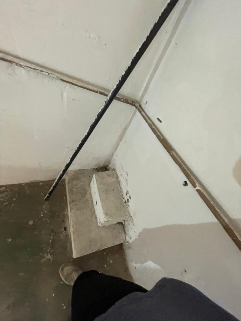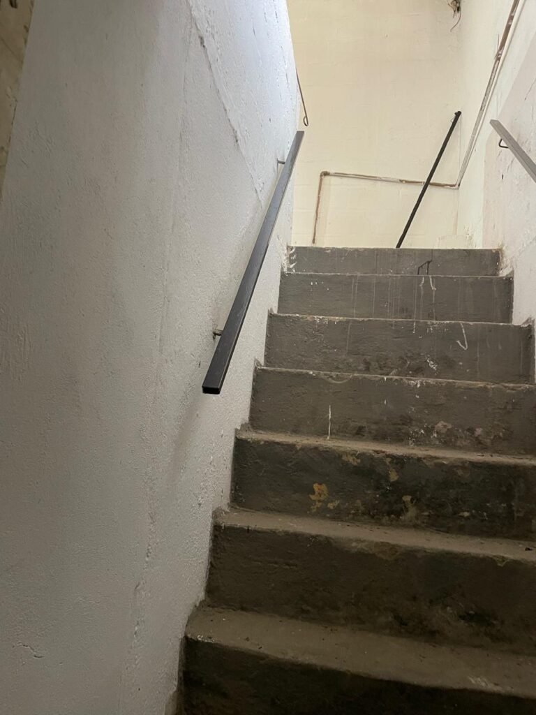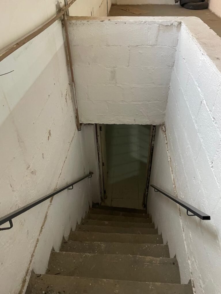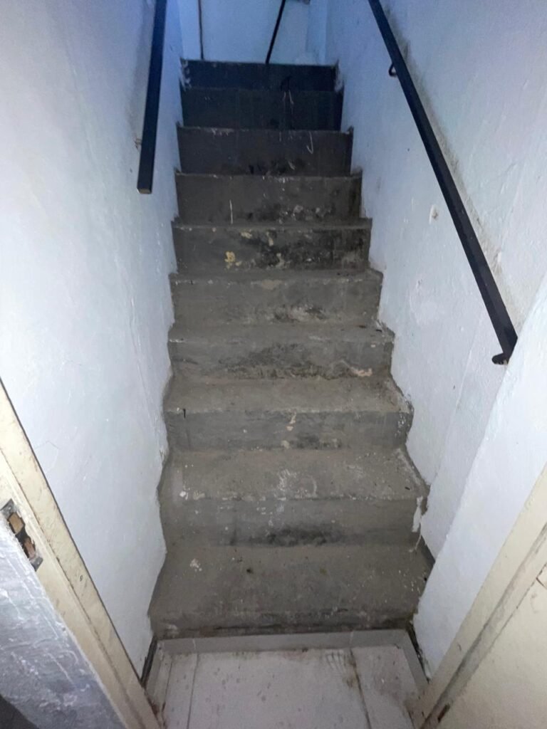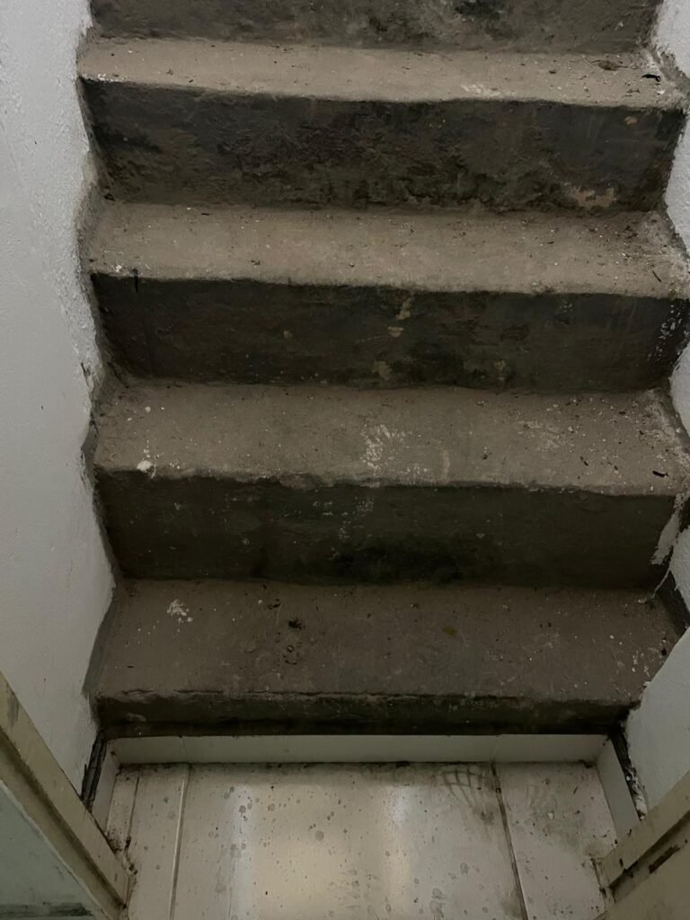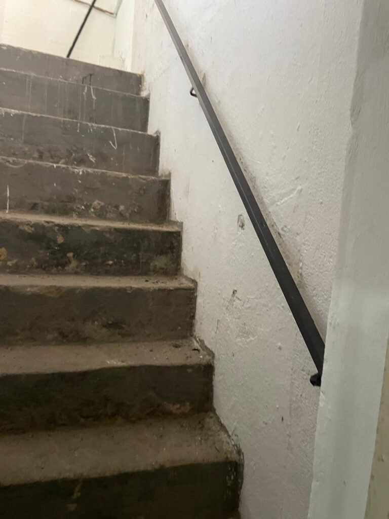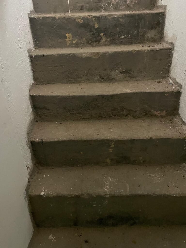 ESCADA:- 01 porta de madeira na cor bege com manchas e desgastes por toda extensão, 01 escada de concreto com manchas e restante em ordem, 02 corrimões com pintura na cor preta em ordem.