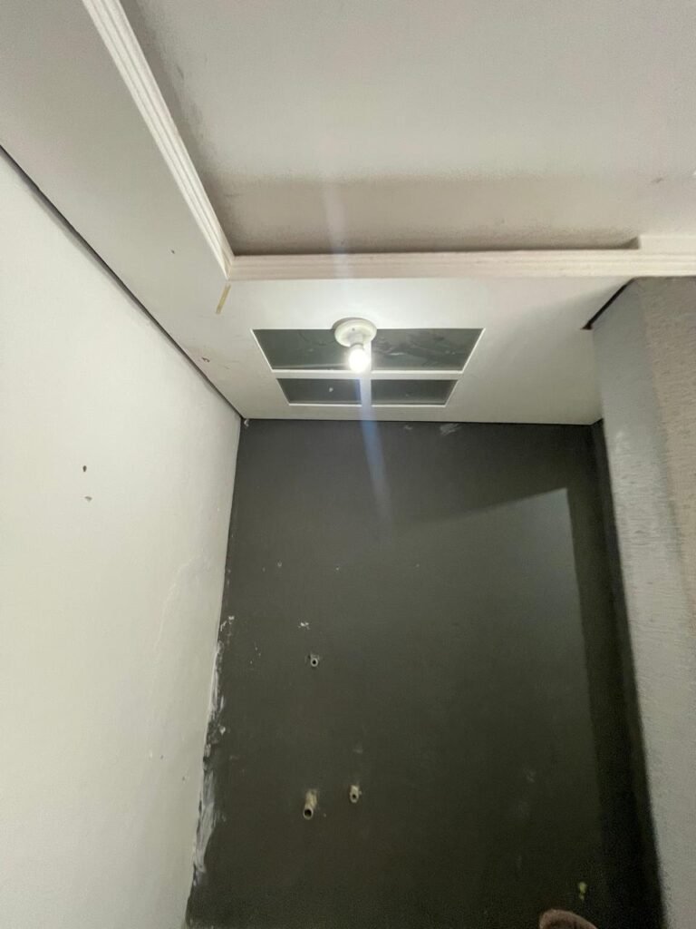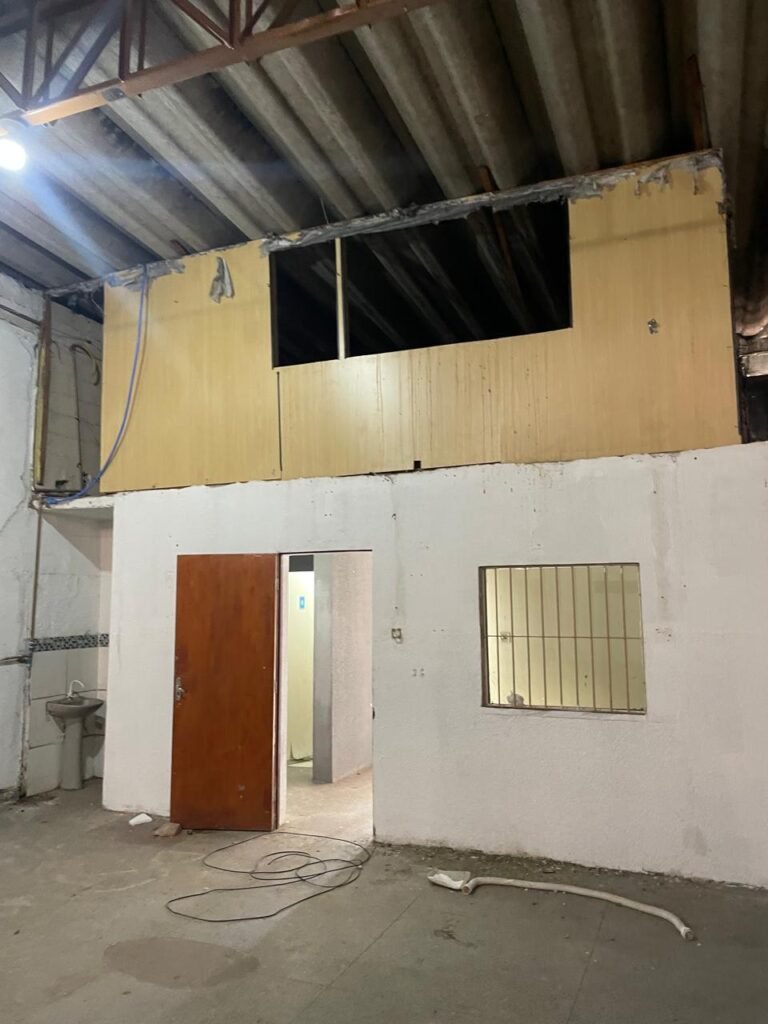 MEZANINO:- Piso de concreto usinado com pintura na cor verde desgastada e suja, ½ parede com pintura na cor branca com desgastes e manchas, 04 vitrôs basculantes com 18 vidros em ordem em cada, todos os vitrôs estão com grades em ordem, 01 interruptor e 03 espelhos com 01 tomada