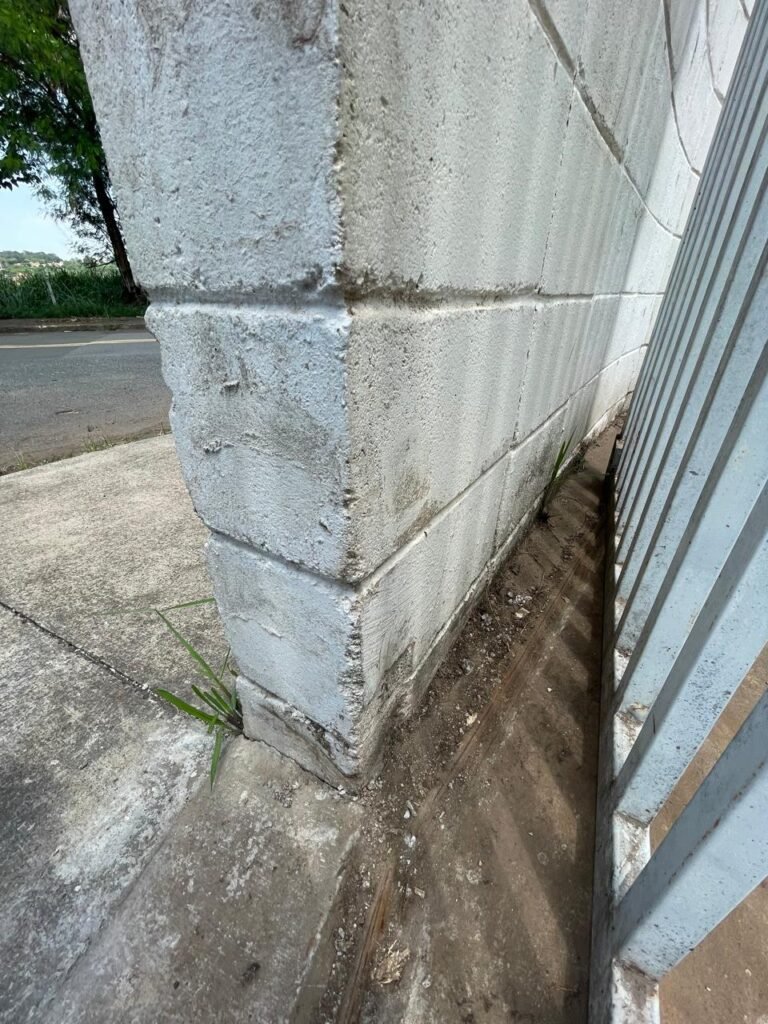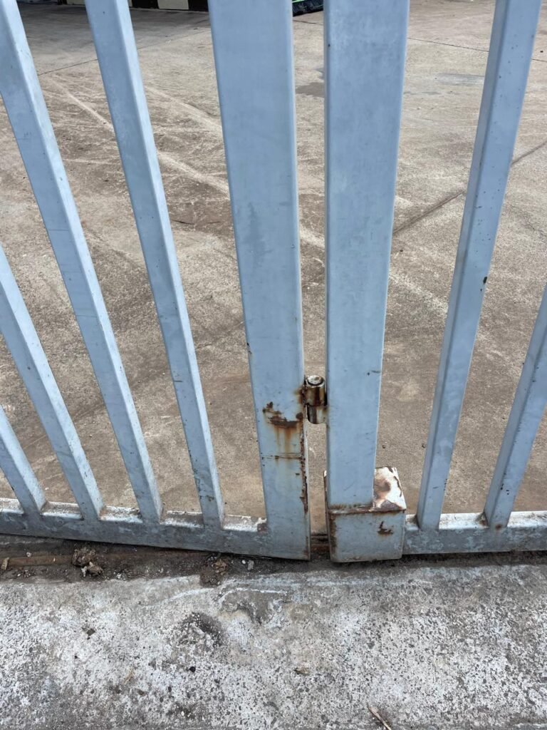 FACHADA-: Portão de ferro lateral direito (rua-imóvel) está com a parte superior danificada, portão deslizante de ferro está forá de trilho e pegando na parede lateral, efetuar reparo em ambos.