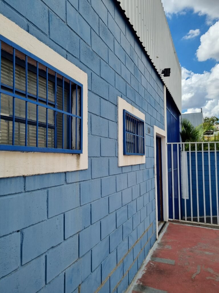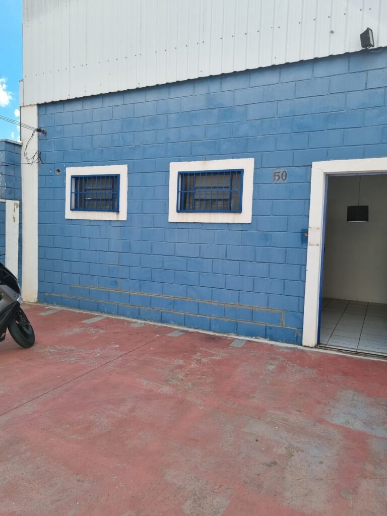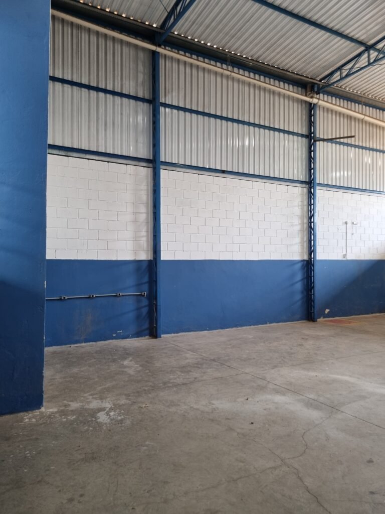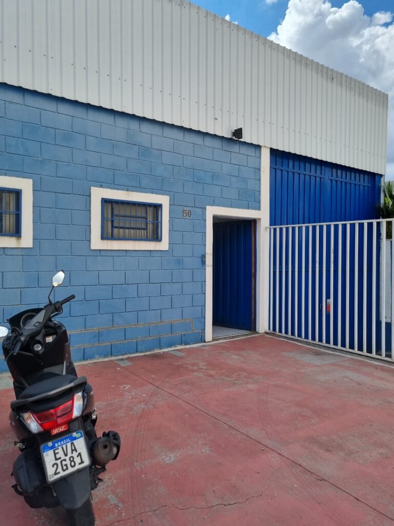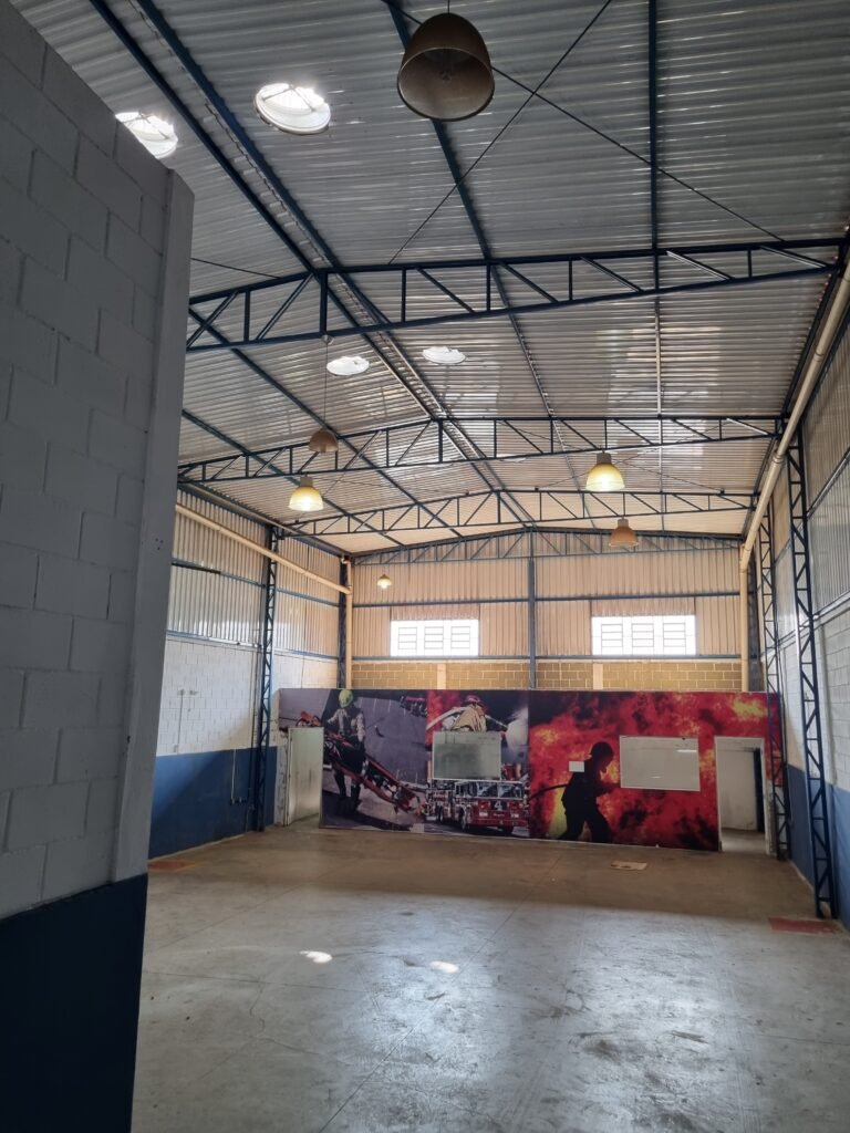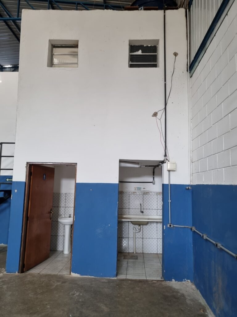 BARRACÃO:- escada de ferro em chapa xadrez com corrimão de ferro metalon em ordem, 02 grelhas de ferro em ordem, 03 marcação no solo para extintor, sem extintor, parede de bloco de concreto na cor branco e azul em ordem, piso de concreto polido em ordem, 01 pia de resina branca em ordem, sifão em ordem, torneira sem marca em ordem, 01 caixa de gordura em ordem, 01 prateleira de madeira em ordem, 10 tomadas 110 volts em ordem, 04 tomadas 220 volts em ordem, tomadas e interruptores em ordem, 01 quadro de luz com 03 disjuntores monofásico de 32 A em ordem, teto com estrutura de ferro na cor azul em ordem, telhas galvanizadas esmaltadas de branco em ordem, 05 lustre com lâmpadas fluorescentes sendo 01 queimada e restante em ordem.