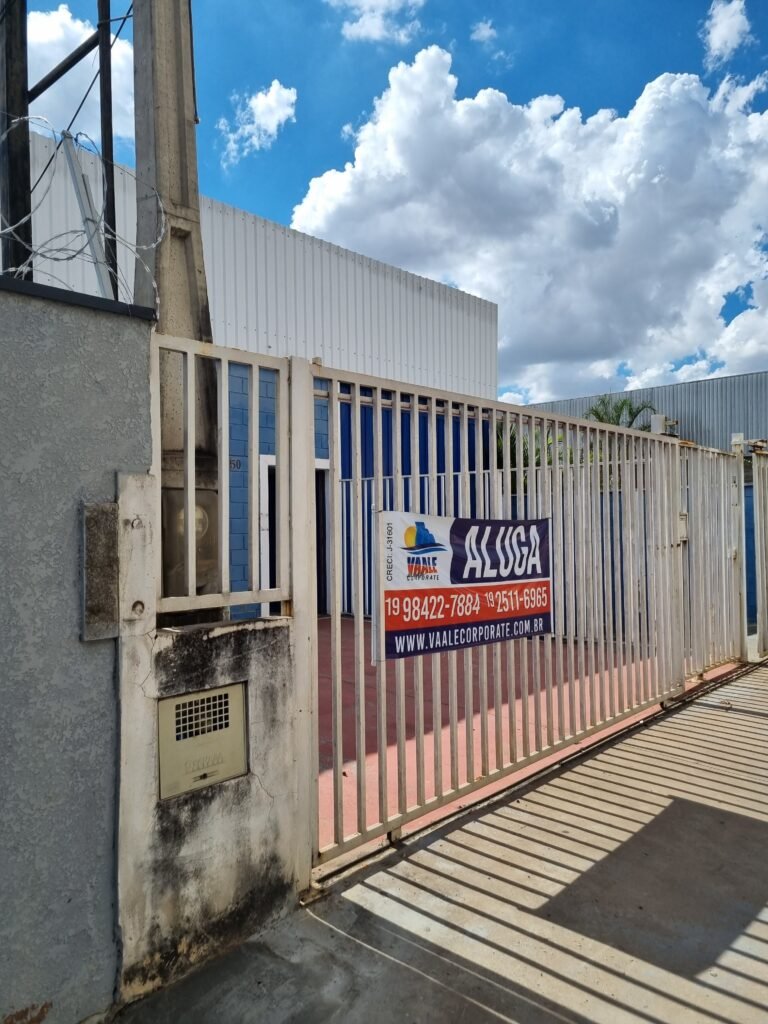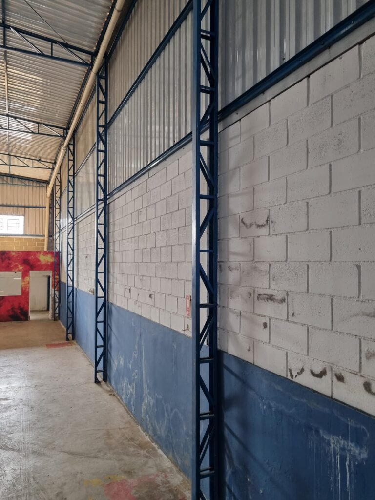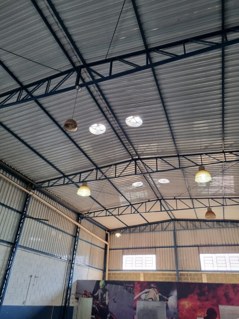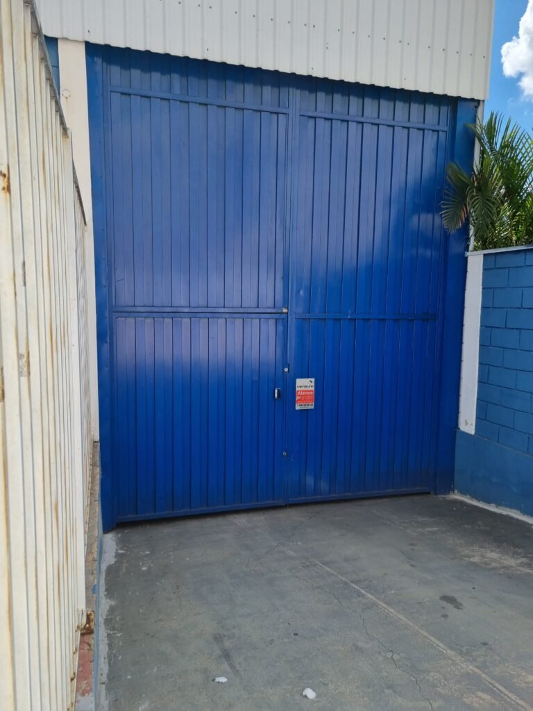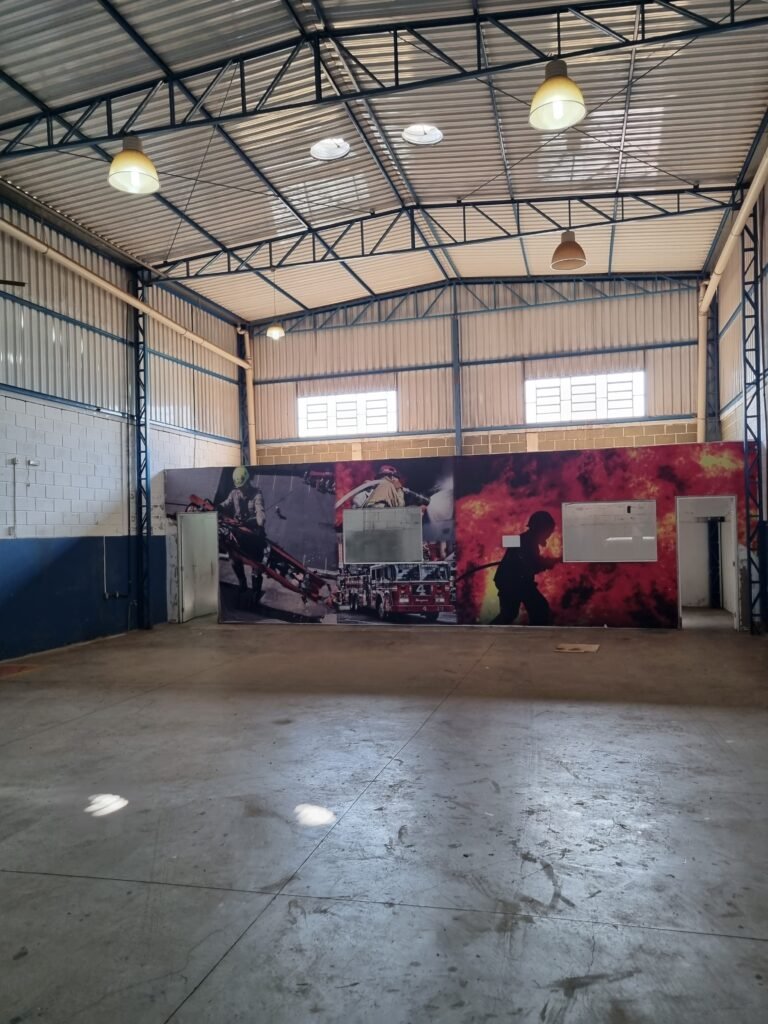 BARRACÃO:- escada de ferro em chapa xadrez com corrimão de ferro metalon em ordem, 02 grelhas de ferro em ordem, 03 marcação no solo para extintor, sem extintor, parede de bloco de concreto na cor branco e azul em ordem, piso de concreto polido em ordem, 01 pia de resina branca em ordem, sifão em ordem, torneira sem marca em ordem, 01 caixa de gordura em ordem, 01 prateleira de madeira em ordem, 10 tomadas 110 volts em ordem, 04 tomadas 220 volts em ordem, tomadas e interruptores em ordem, 01 quadro de luz com 03 disjuntores monofásico de 32 A em ordem, teto com estrutura de ferro na cor azul em ordem, telhas galvanizadas esmaltadas de branco em ordem, 05 lustre com lâmpadas fluorescentes sendo 01 queimada e restante em ordem.