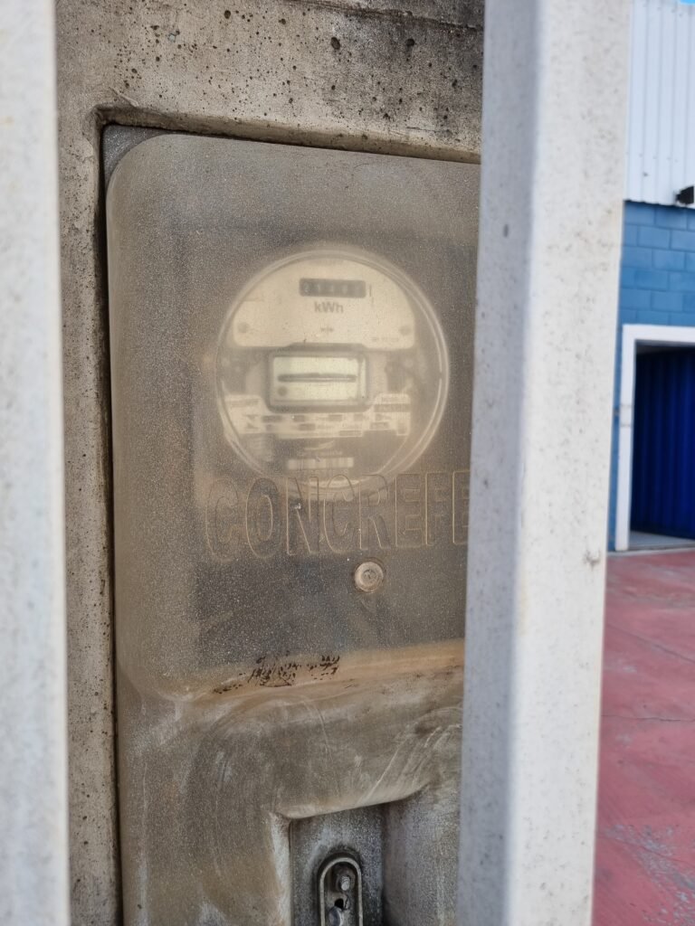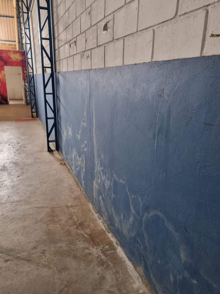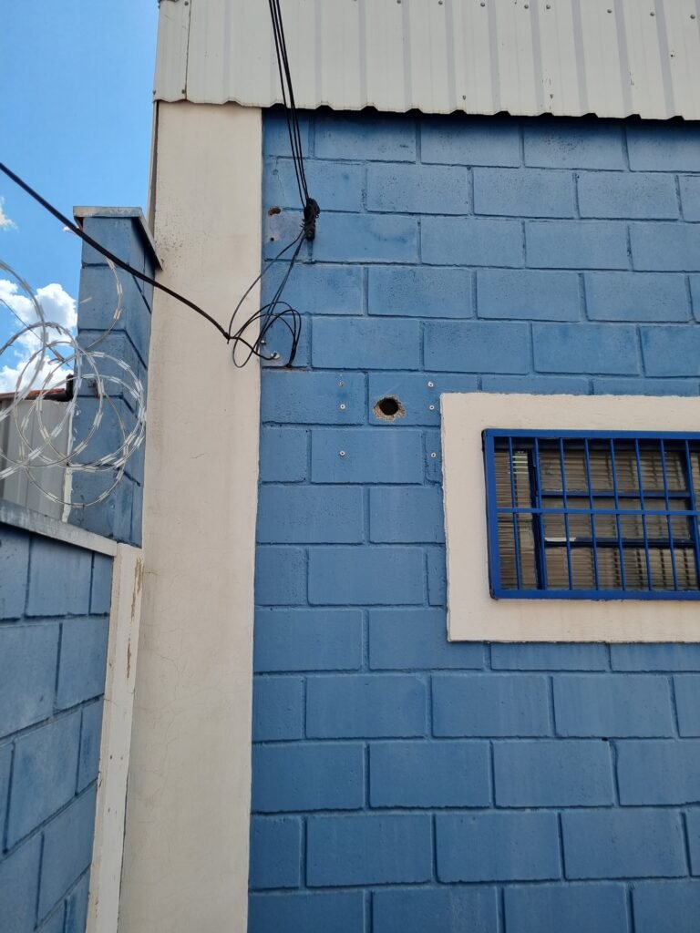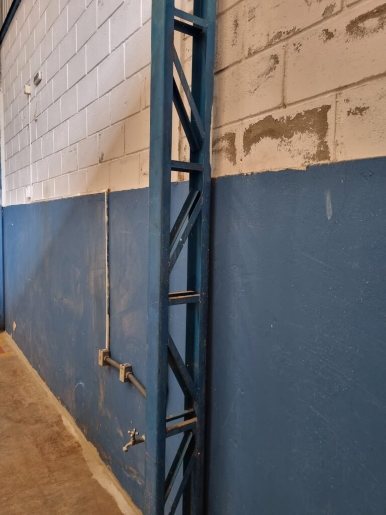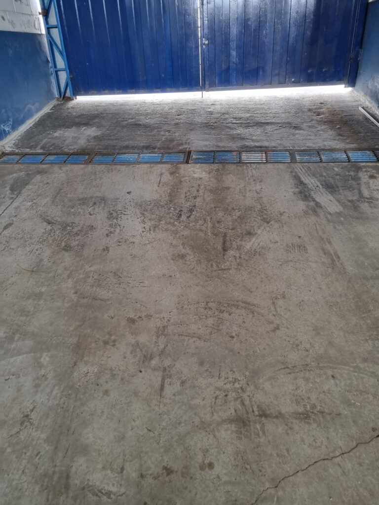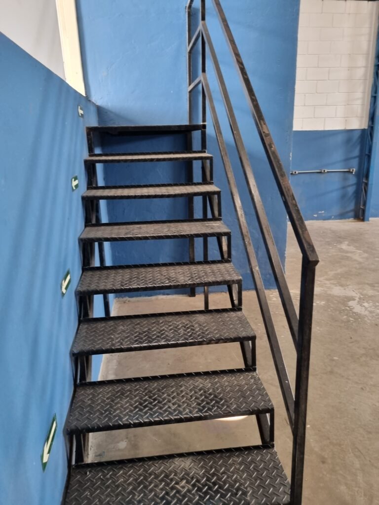 BARRACÃO:- escada de ferro em chapa xadrez com corrimão de ferro metalon em ordem, 02 grelhas de ferro em ordem, 03 marcação no solo para extintor, sem extintor, parede de bloco de concreto na cor branco e azul em ordem, piso de concreto polido em ordem, 01 pia de resina branca em ordem, sifão em ordem, torneira sem marca em ordem, 01 caixa de gordura em ordem, 01 prateleira de madeira em ordem, 10 tomadas 110 volts em ordem, 04 tomadas 220 volts em ordem, tomadas e interruptores em ordem, 01 quadro de luz com 03 disjuntores monofásico de 32 A em ordem, teto com estrutura de ferro na cor azul em ordem, telhas galvanizadas esmaltadas de branco em ordem, 05 lustre com lâmpadas fluorescentes sendo 01 queimada e restante em ordem.