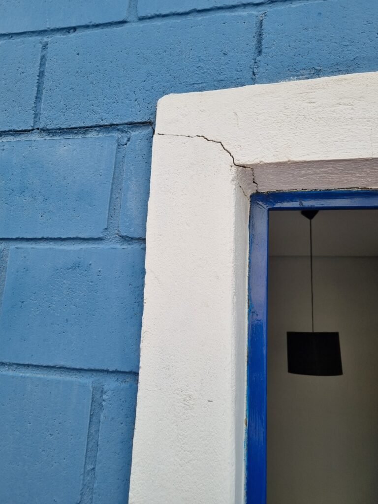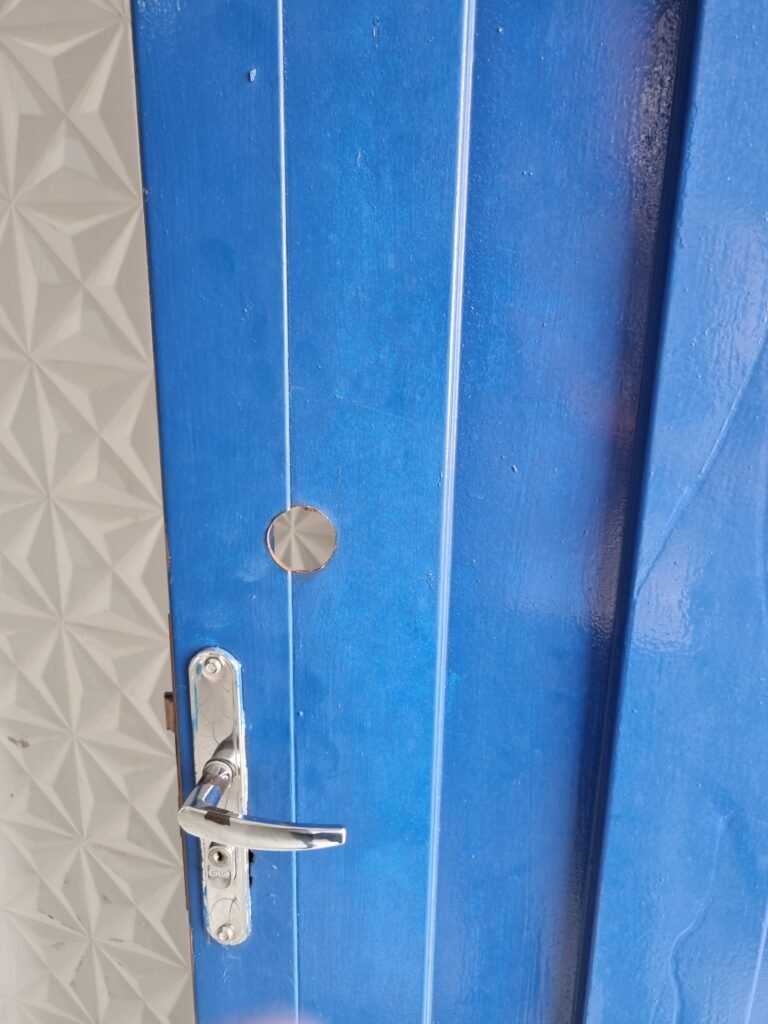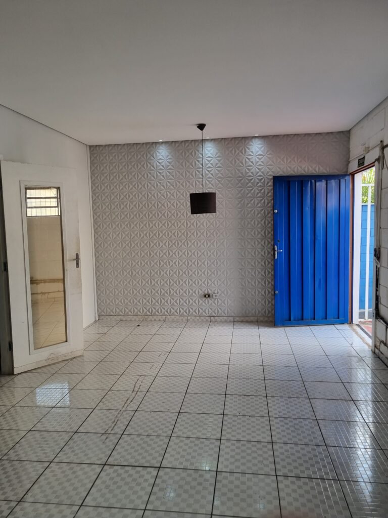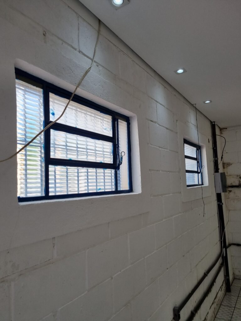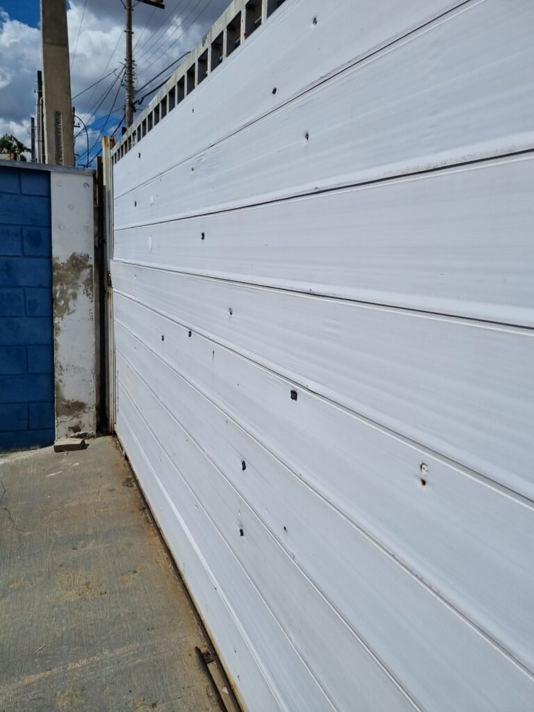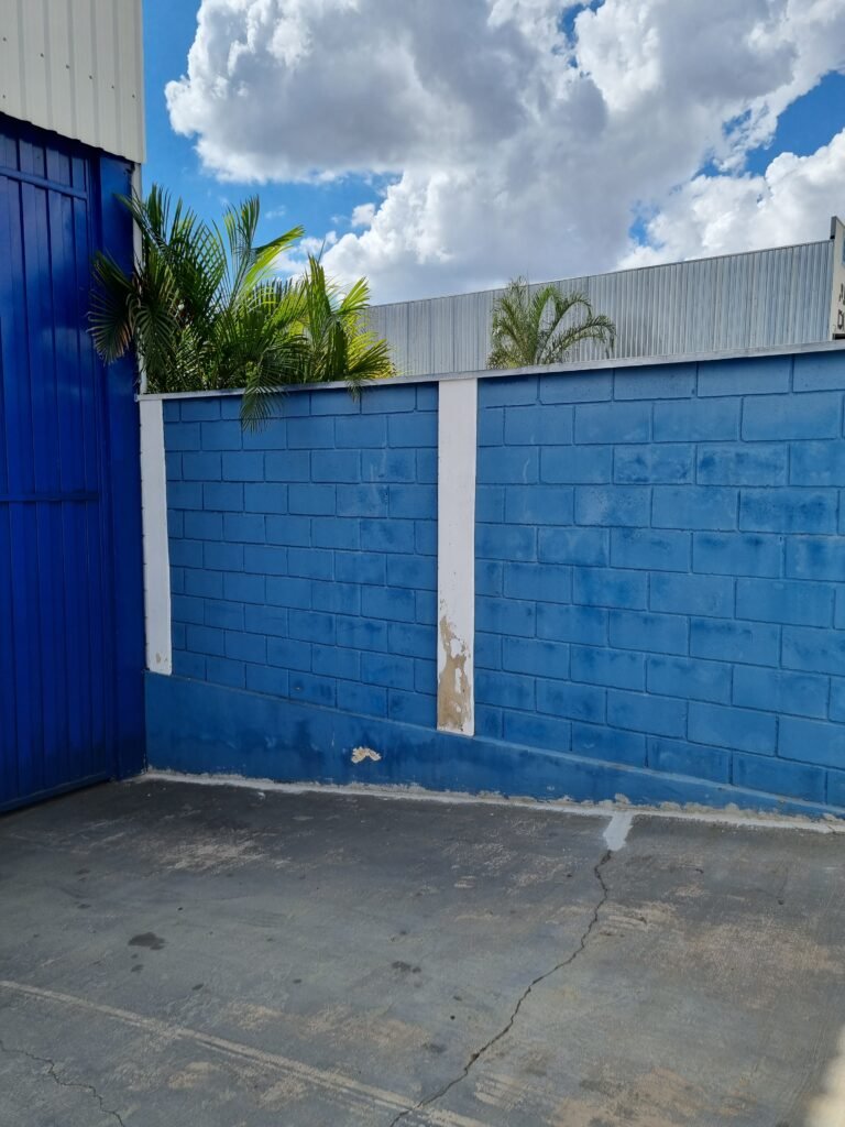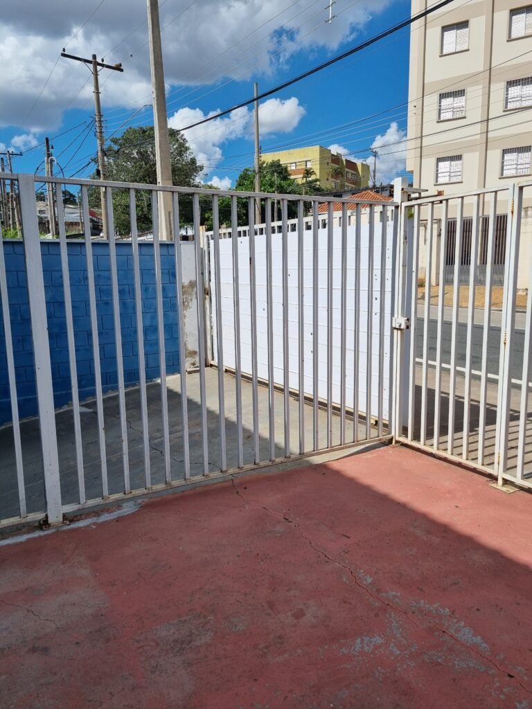 GARAGEM:- piso de concreto polido com pintura descascando vermelho em ordem, muros e paredes frontais de blocos de concreto com pintura na cor azul e branca em ordem, 01 registro geral em ordem, 02 quadro de metalon para banner sem instalar, 01 refletor com lâmpada fluorescente em ordem, 02 vitrôs com grades de ferro e 05 vidros cada em ordem, número 50 na fachada em ordem, 01 grade de metalon na cor branca em ordem, 01 porta de ferro de chapa dobrada pintada de azul em ordem, fechadura yale faltando chave, 01 maçaneta quebrada, telha trapezoidal cor branca na fachada em ordem, 01 refletor em ordem, 01 portão tipo carreta de chapa de ferro dobrada cor azul de 02 folhas em ordem, trincos em ordem, 02 fechadura tetra com chave em ordem.