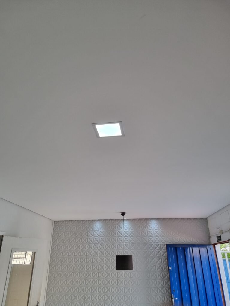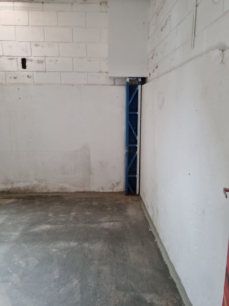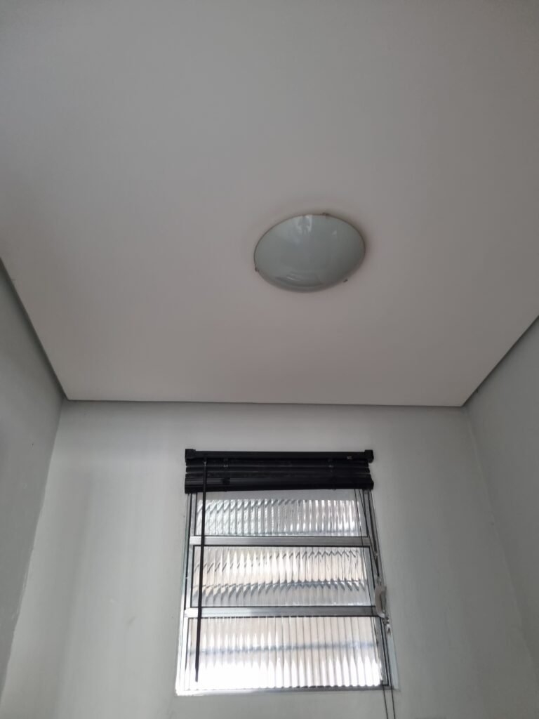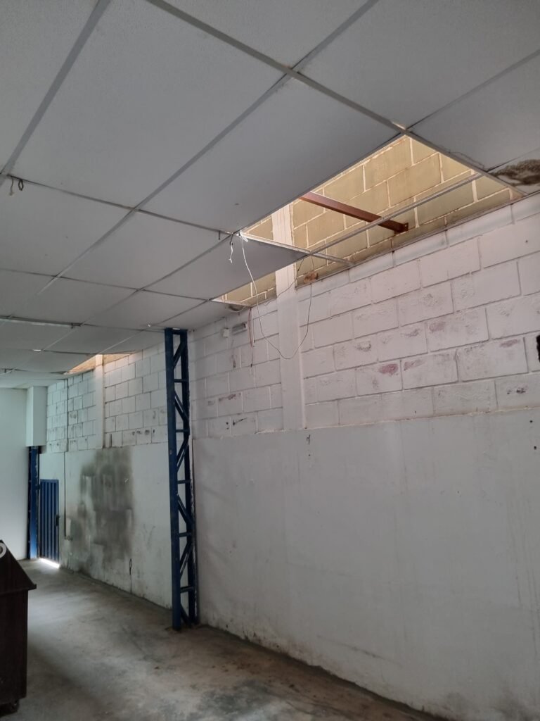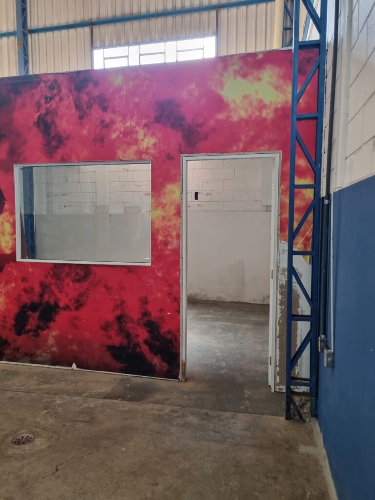 SALA/BARRACÃO:- 01 divisória de drywall cor branca ok, 02 portas de madeira cor branca em ordem, maçanetas em ordem, sem chaves, teto de isopor em ordem, 01 ralo de inox em ordem, 02 janelas de vidros fixo em ordem, 01 tomada em ordem, 01 interruptor em ordem, 04 luminárias com lâmpadas tubulares de led em ordem, piso de concreto polido na cor cinza em ordem, 01 portióla de ferro em chapa dobrada em ordem, trinco em ordem, sem chave.