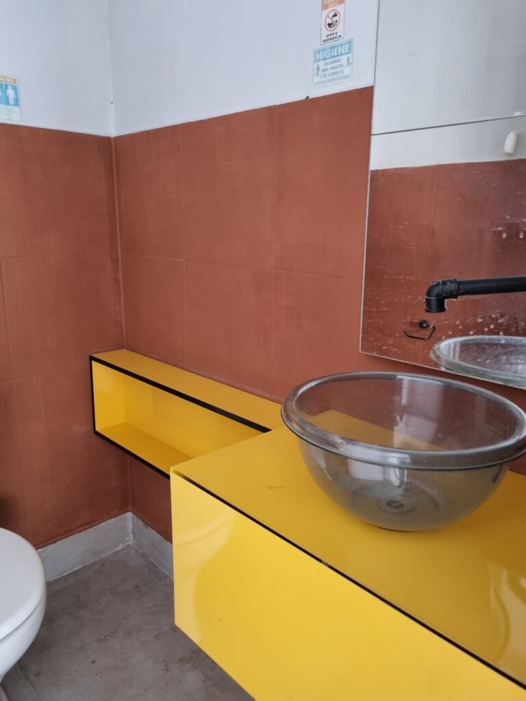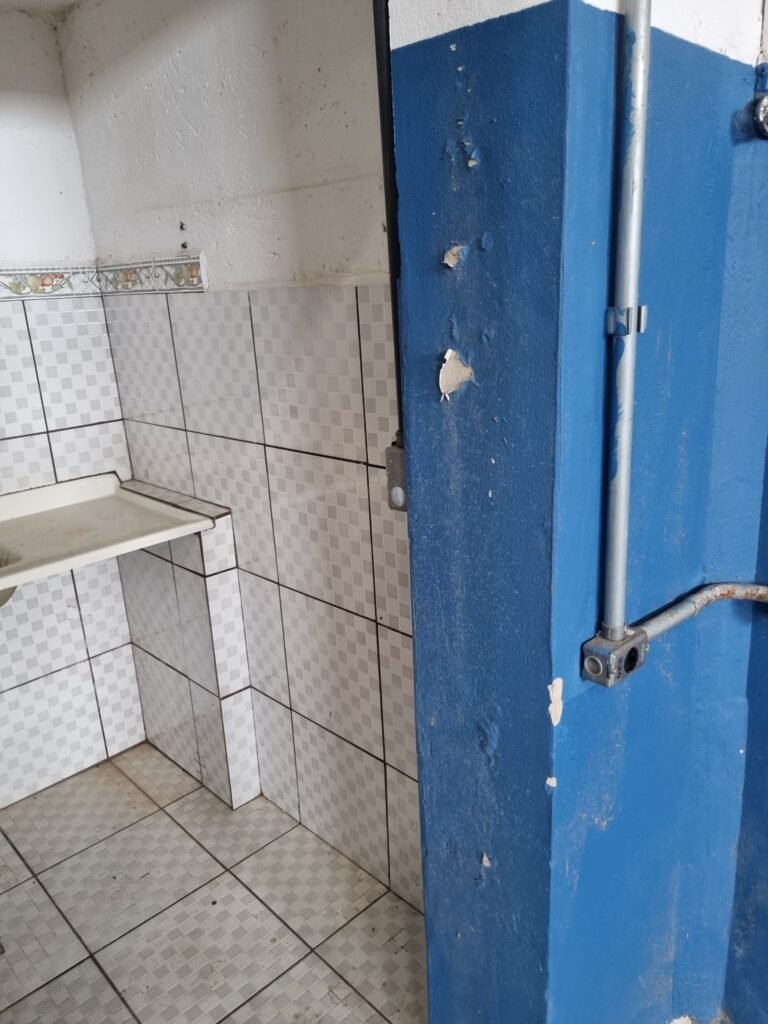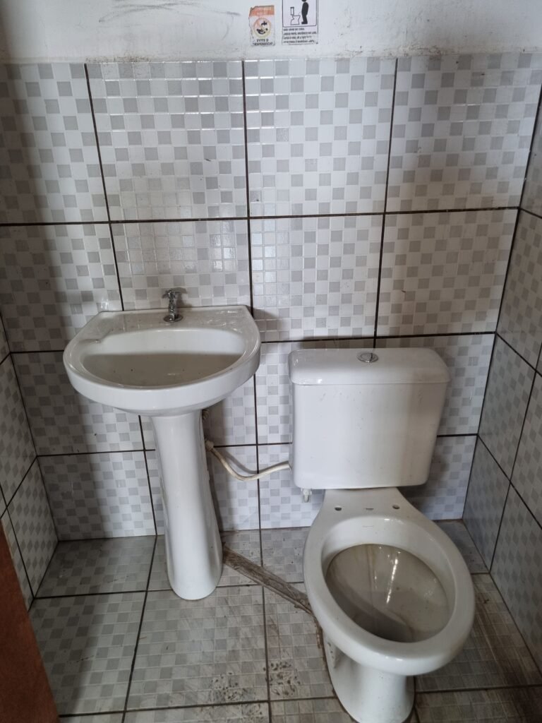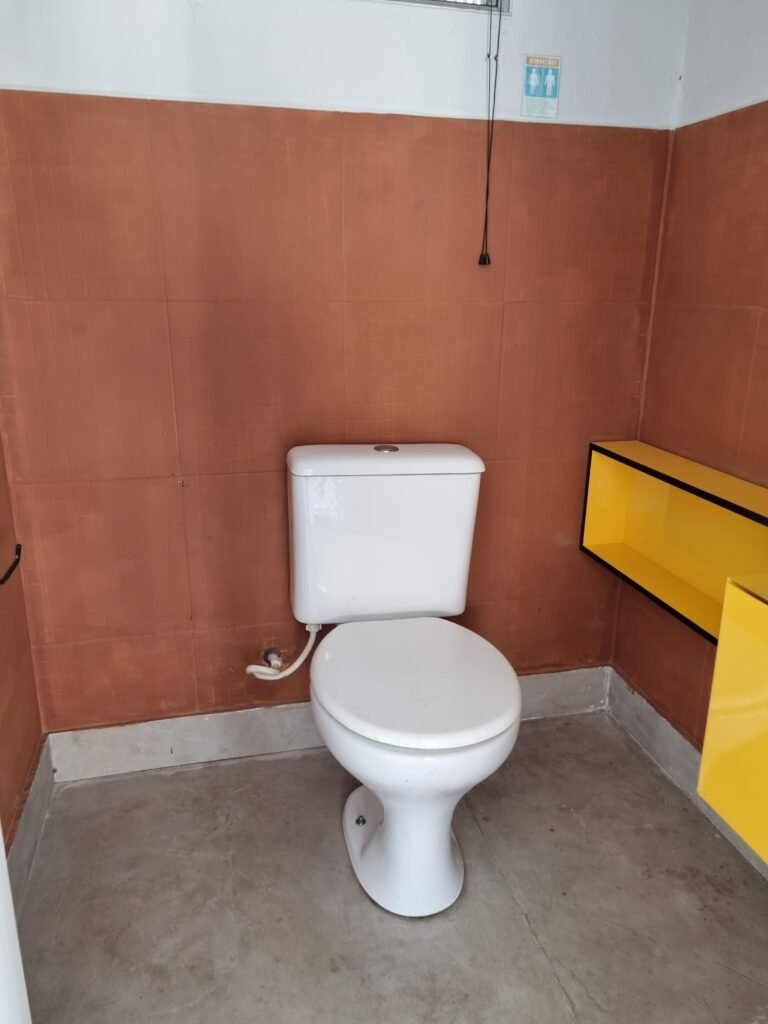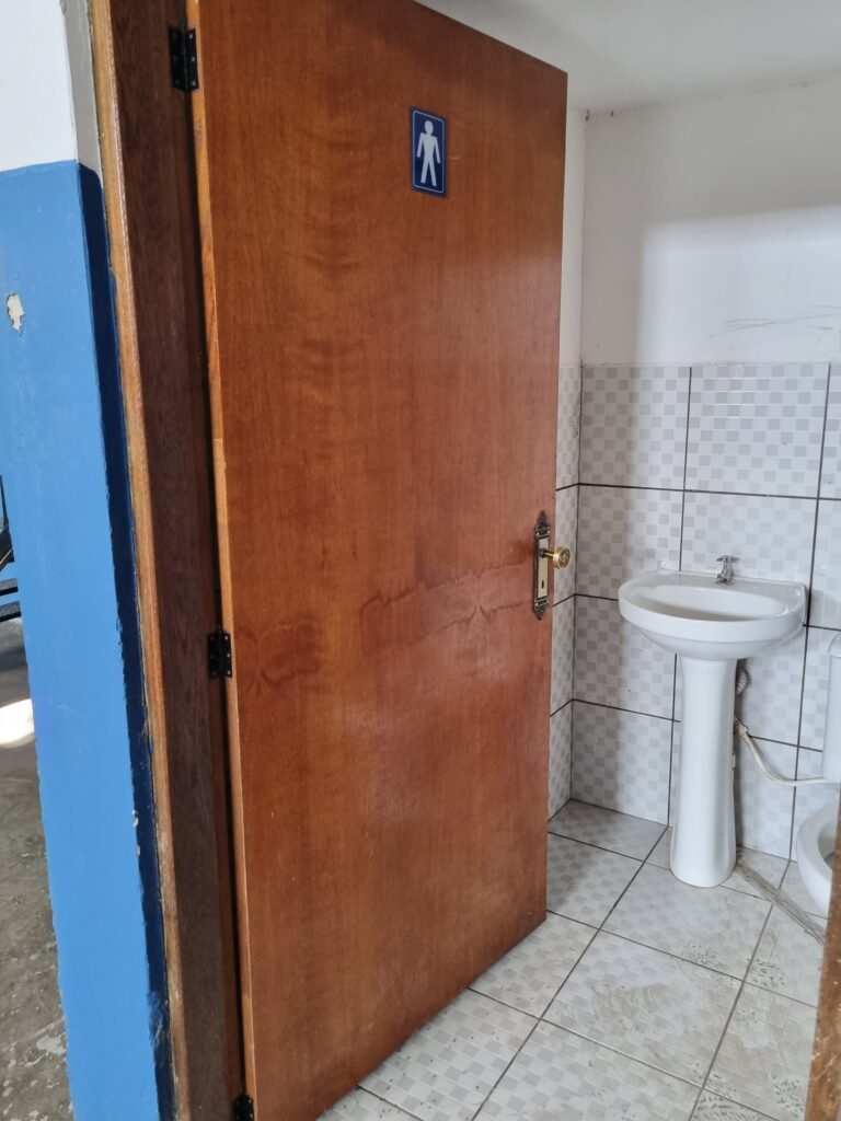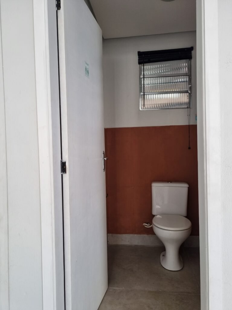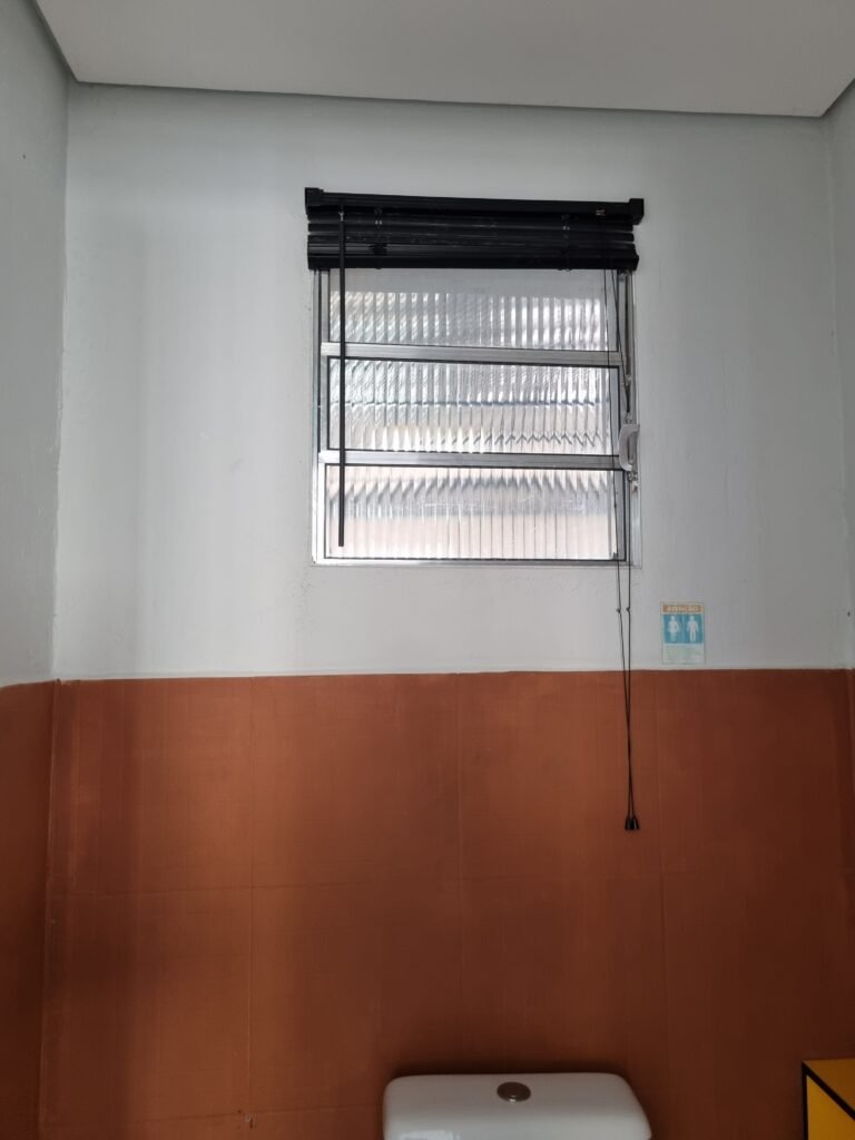 WC/1 ADMINISTRATIVO:- Piso frio cerâmica cor cinza fosco em ordem, ralo em ordem, parede com azulejos na cor marrom até ½ e restante com pintura na cor branca em ordem, conjunto vaso sanitário e caixa acoplada de descarga e tampa marca Incepa, porta papel higiênico na cor preta em ordem, 01 vitrô de alumínio com 03 vidros em ordem, 01 persiana horizontal na cor preta em ordem, porta de madeira com pintura na cor branca ordem, maçanetas em ordem, fechadura e chave fixa em ordem, teto de gesso branco em ordem, 01 interruptor externo em ordem, 01 lustre tartaruga em ordem, 01 lâmpada de led.