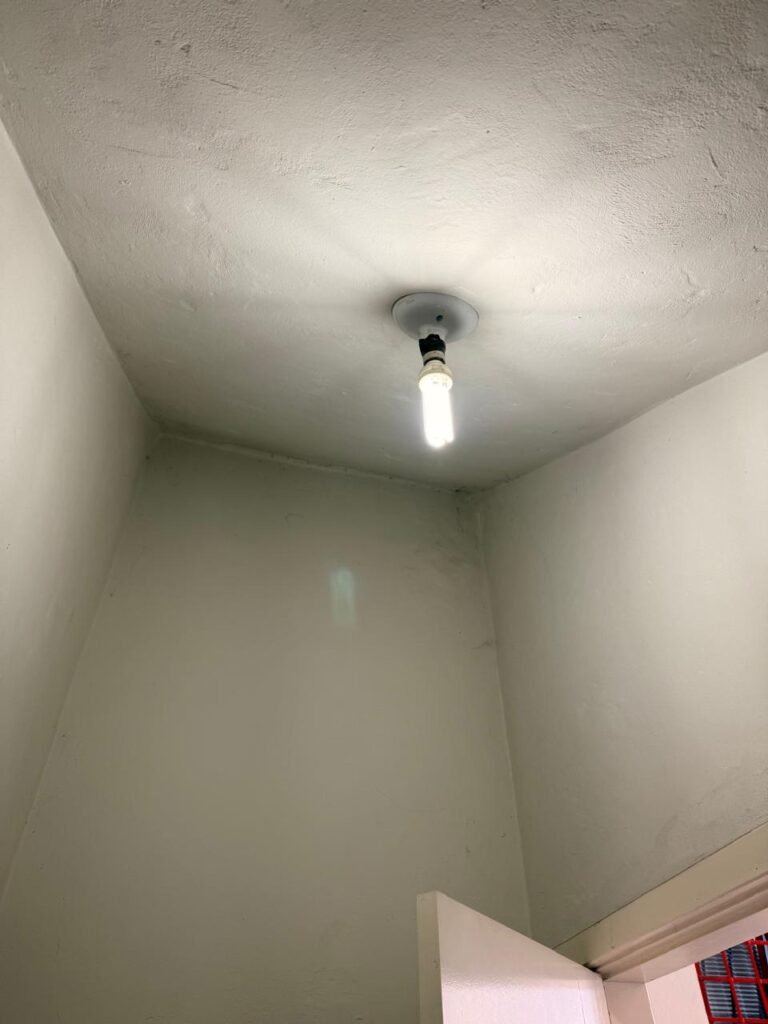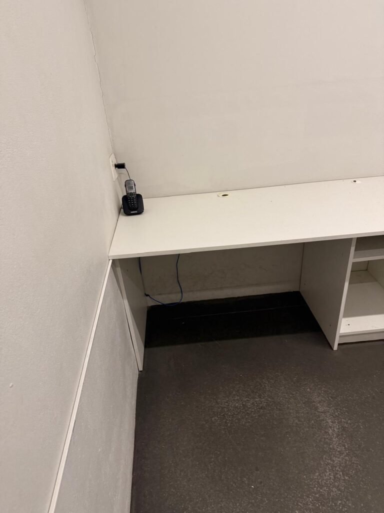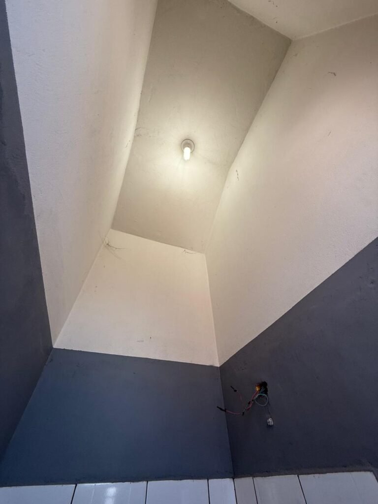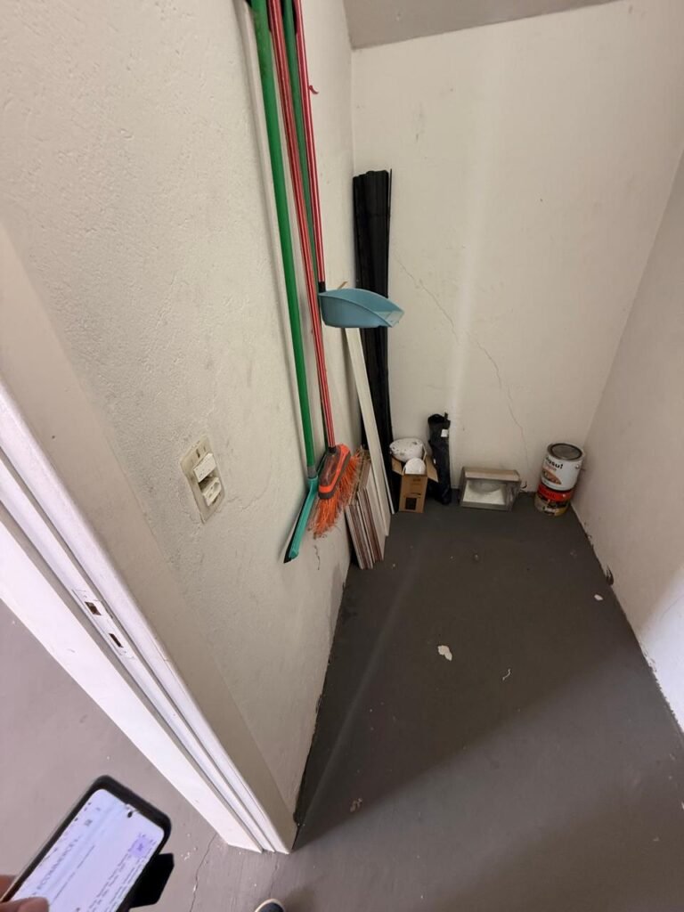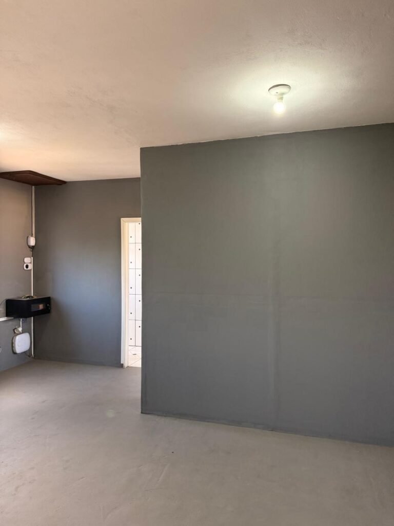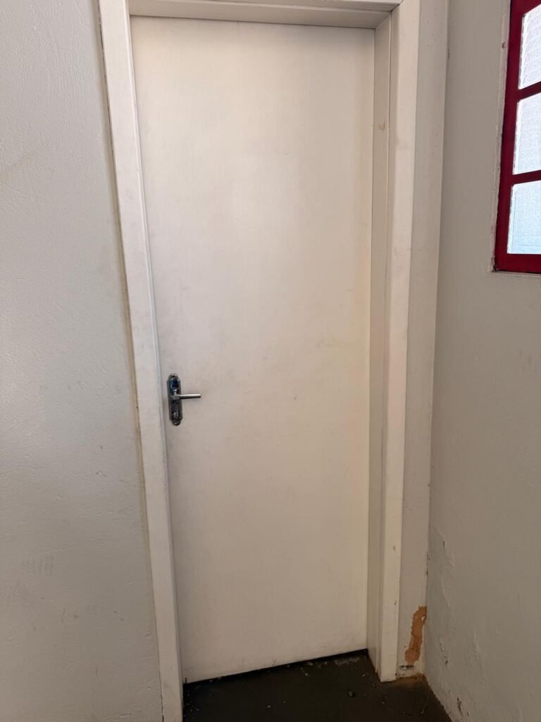 CÔMODO DRYWALL:- Piso concreto usinado com pintura na cor cinza em ordem, paredes com buracos, furos e pintura na cor branco gelo com manchas de infiltração, 03 bancadas em mdf com pequenas lascas e restante em ordem, parede 01 buraco circular para ar condicionado e 06buracos com bucha, 01 aparelho interfone Intelbras, 01 lâmpada com metade queimada, porta em mdf em ordem, 01 puxador de correr.