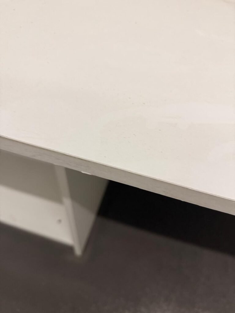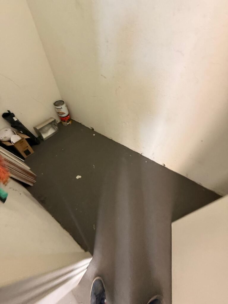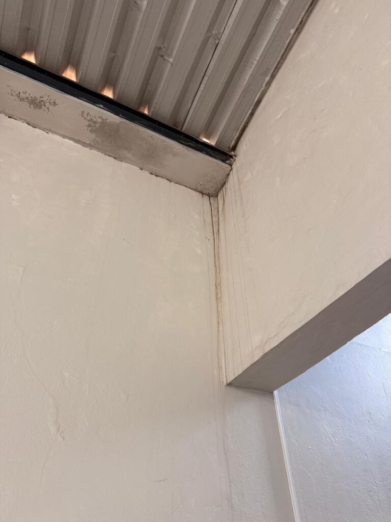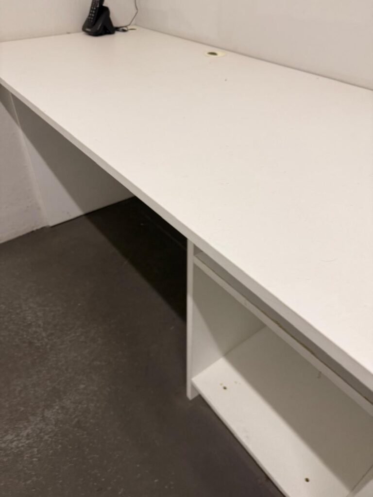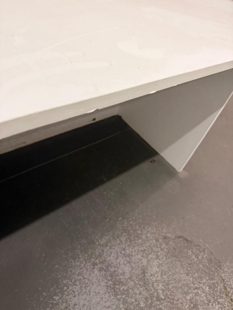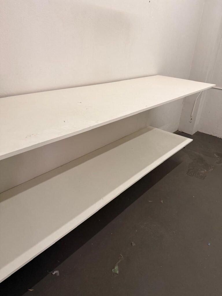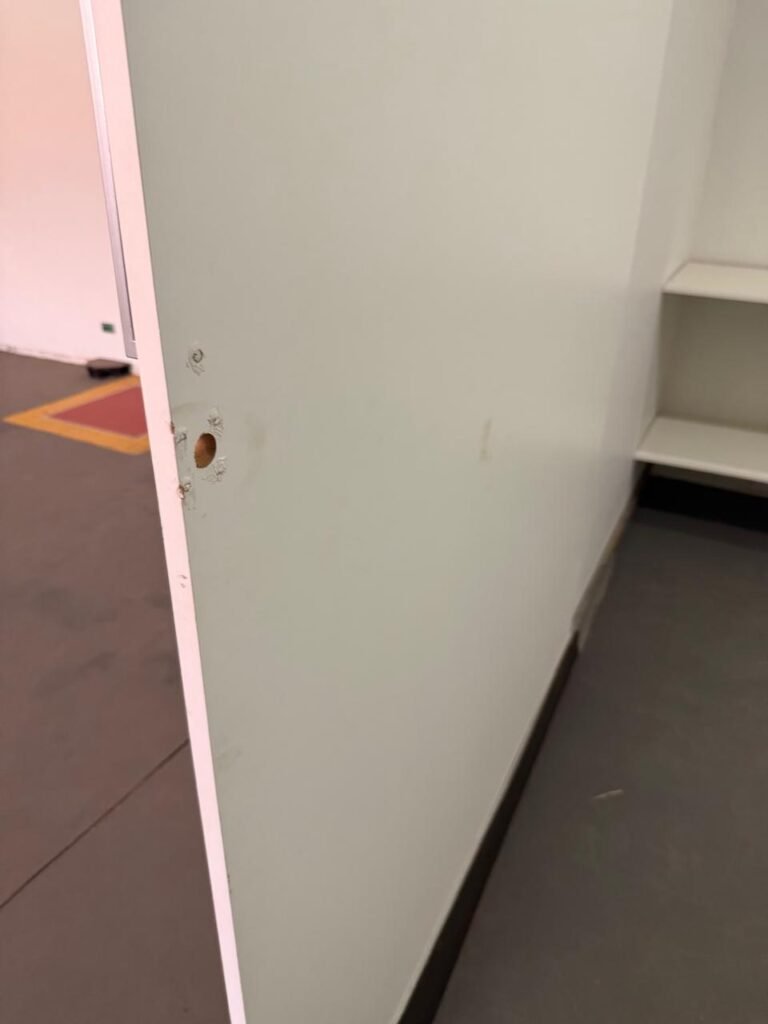 CÔMODO DRYWALL:- Piso concreto usinado com pintura na cor cinza em ordem, paredes com buracos, furos e pintura na cor branco gelo com manchas de infiltração, 03 bancadas em mdf com pequenas lascas e restante em ordem, parede 01 buraco circular para ar condicionado e 06buracos com bucha, 01 aparelho interfone Intelbras, 01 lâmpada com metade queimada, porta em mdf em ordem, 01 puxador de correr.