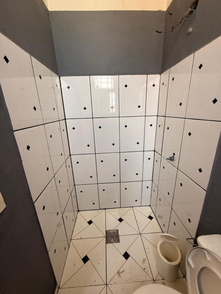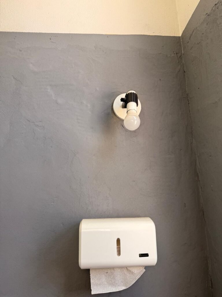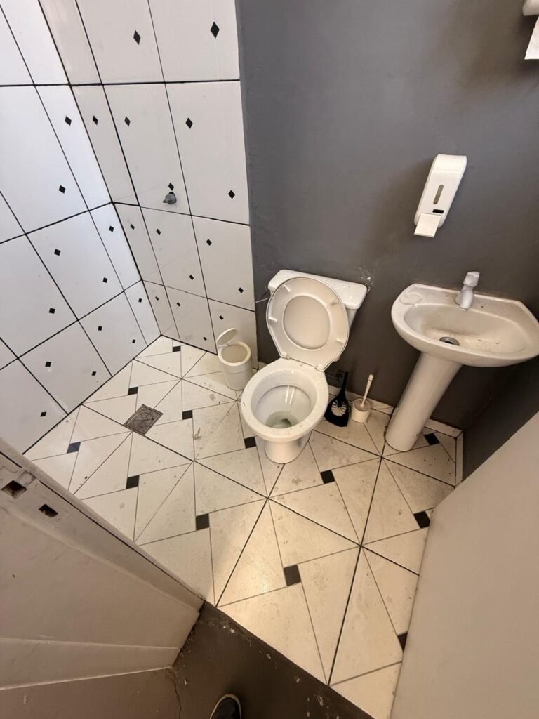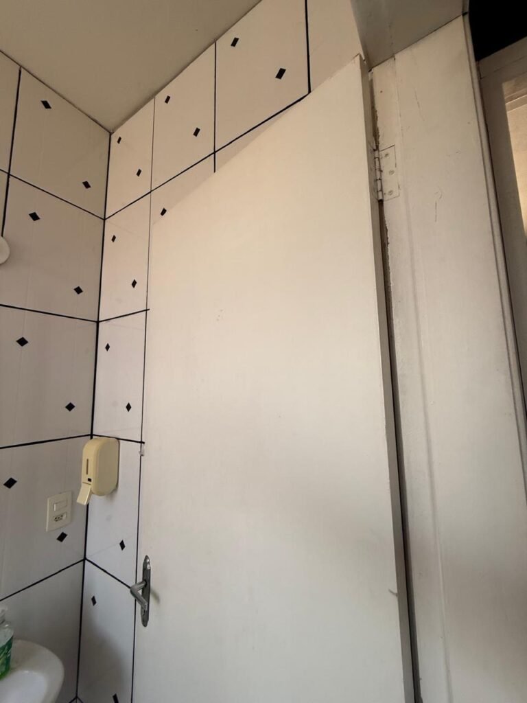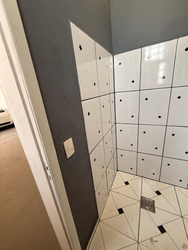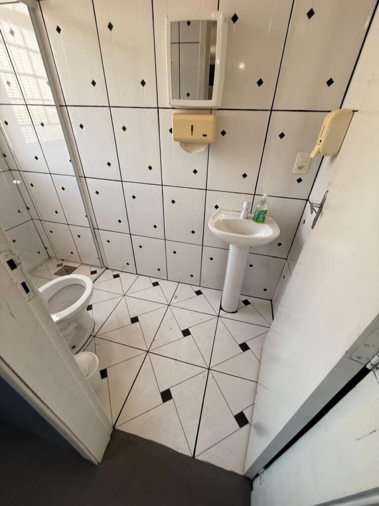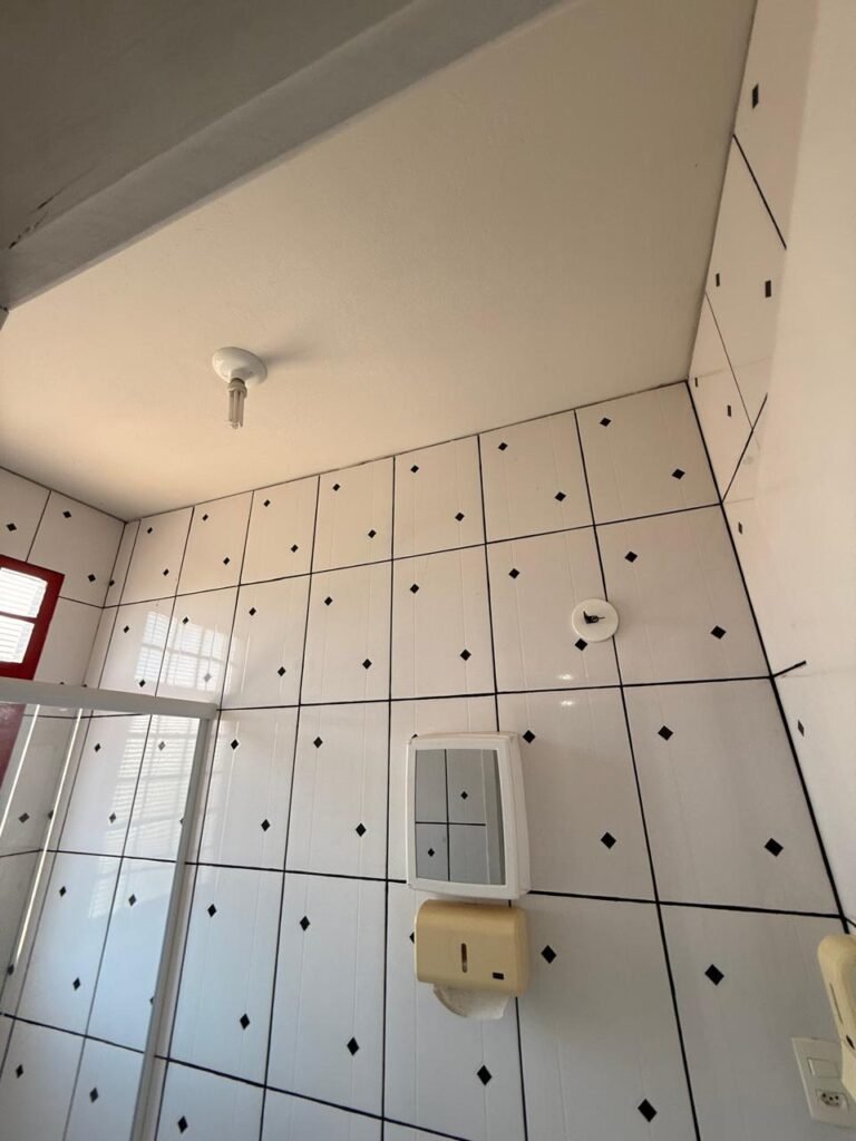 W.C. 1:- Piso frio cerâmico em ordem, azulejo até somente na área do chuveiro a até a altura do chuveiro restante paredes com reboco e com barrado até a altura do chuveiro com pintura na cor cinza e restante com pintura na cor branco, 01 soquete em ordem, 01 lâmpada fluorescente em ordem, 02interruptores em ordem, 01 tomada em ordem, 02 espelhos de luz em ordem, 01 spot na cor branco sem lâmpada, 01 ralo com tampa inox e desentupido em ordem, porta de madeira com pintura na cor branco, guarnição da porta parte superior sem pintura restante com pintura na cor branco, 02 maçanetas em ordem fechadura sem chave, 01 vitrô basculante com pintura na cor vermelho, 10vidros em ordem, sem chuveiro, registro faltando canopla restante em ordem, conjunto lavatório e coluna cerâmica na cor branco em ordem, torneira em ordem, conjunto vaso sanitário e caixa acoplada de descarga cerâmica na cor branca em ordem.