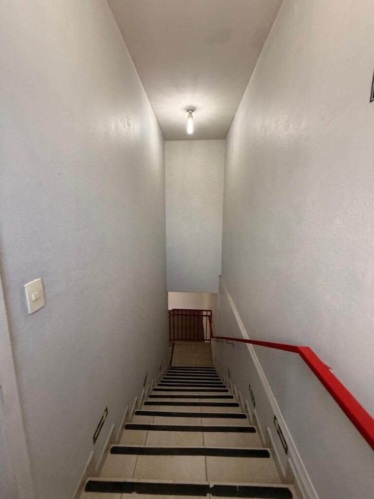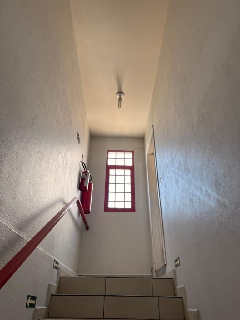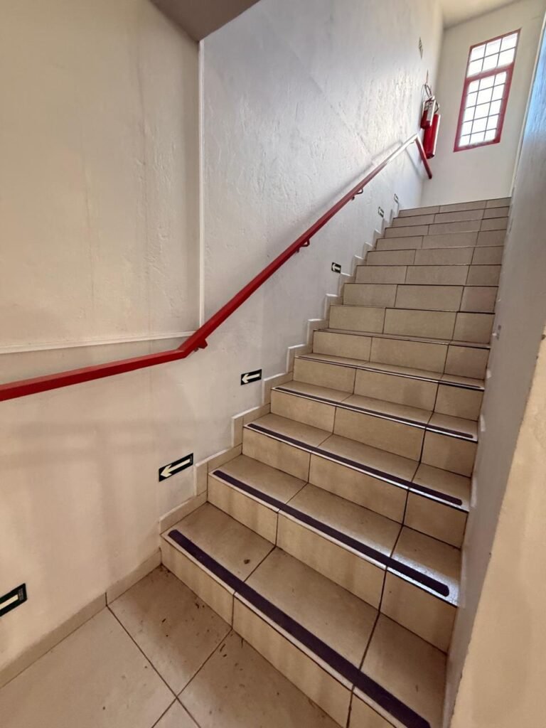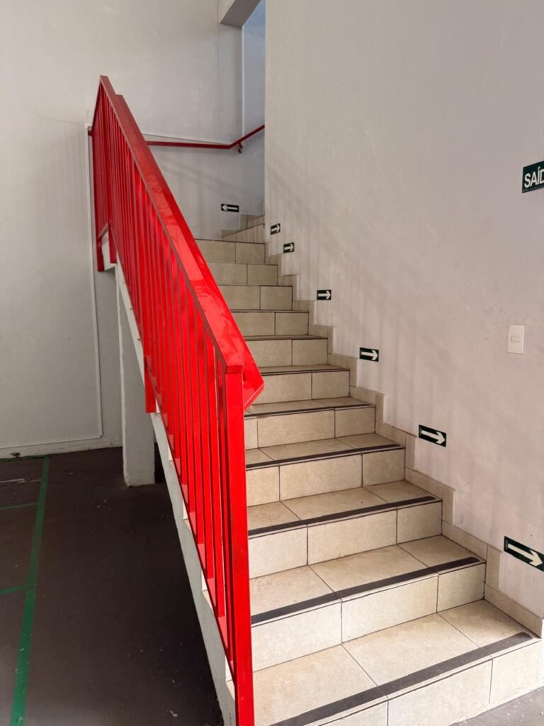 ESCADA:- Escada de alvenaria com degraus revestidos de piso frio cerâmico com fitas ante derrapante em ordem, corrimão e guarda corpo ferro tubular com pintura na cor vermelho com desgastes naturais, 02 extintores sendo 01pó químico 4 kg 20 b:c e 01 água 10 litros 2-A em ordem, 01 interruptor em ordem, 01 espelho de luz em ordem, 01 vitrô basculante com pintura na cor vermelho em ordem, trava em ordem, 07 vidros em ordem.