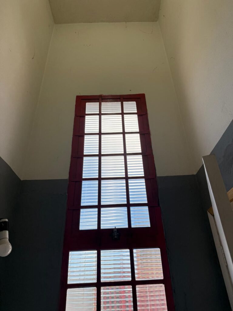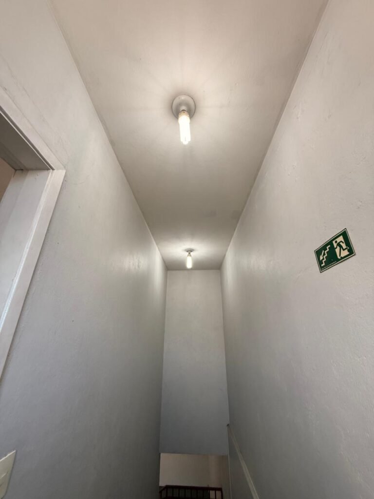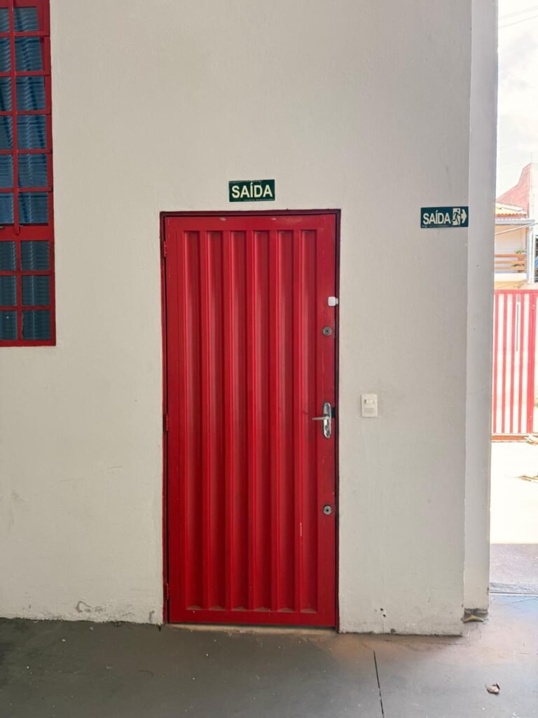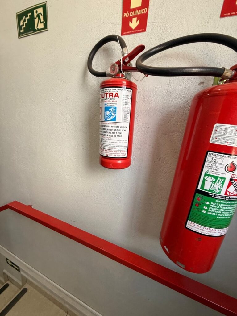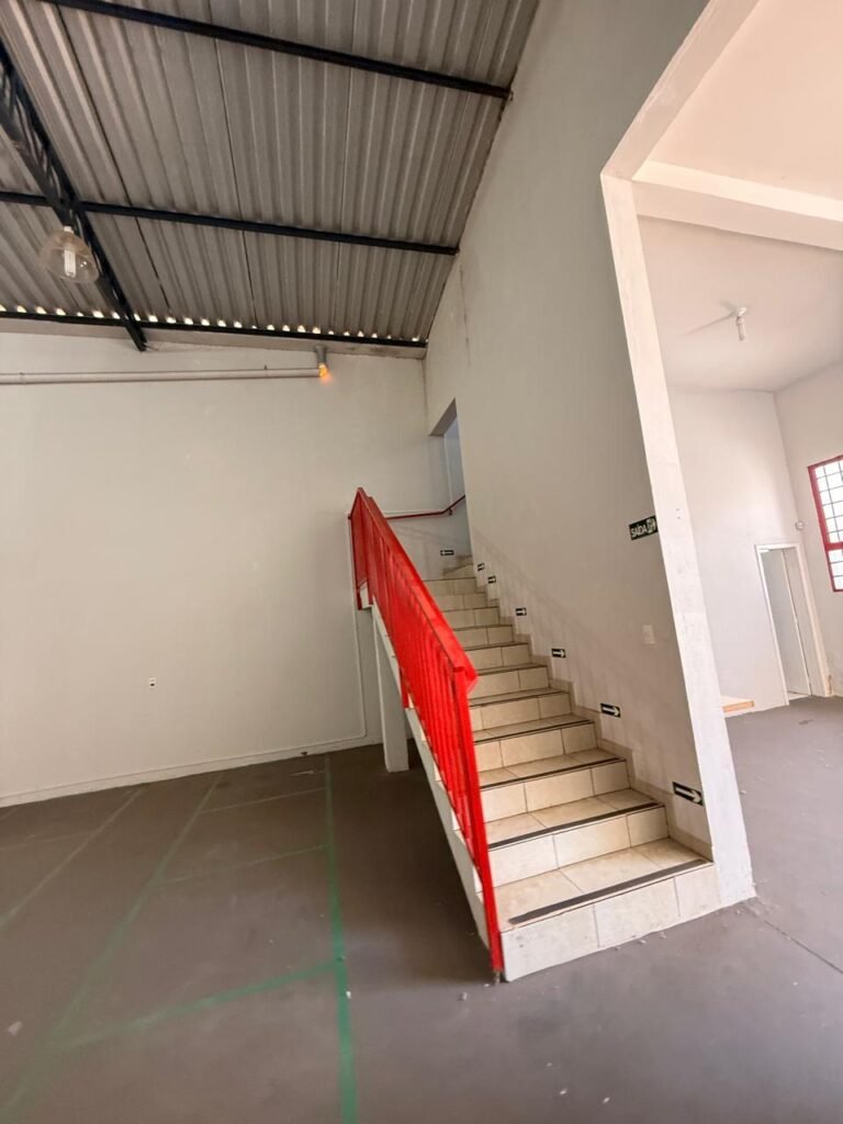 ESCADA:- Escada de alvenaria com degraus revestidos de piso frio cerâmico com fitas ante derrapante em ordem, corrimão e guarda corpo ferro tubular com pintura na cor vermelho com desgastes naturais, 02 extintores sendo 01pó químico 4 kg 20 b:c e 01 água 10 litros 2-A em ordem, 01 interruptor em ordem, 01 espelho de luz em ordem, 01 vitrô basculante com pintura na cor vermelho em ordem, trava em ordem, 07 vidros em ordem.
