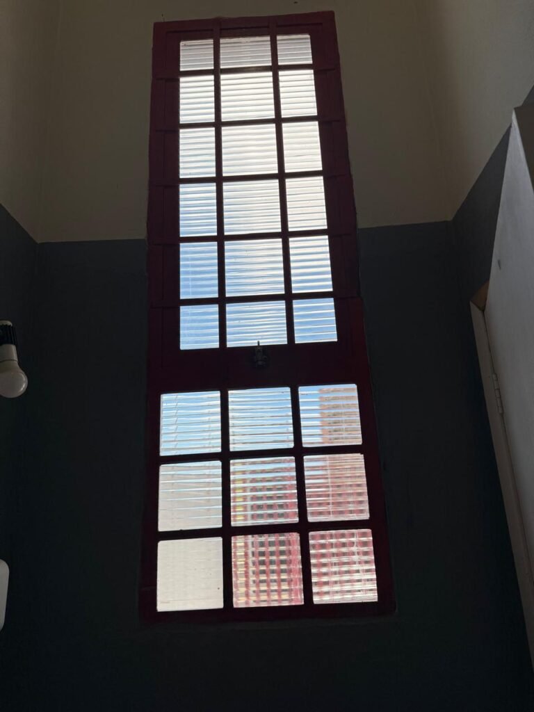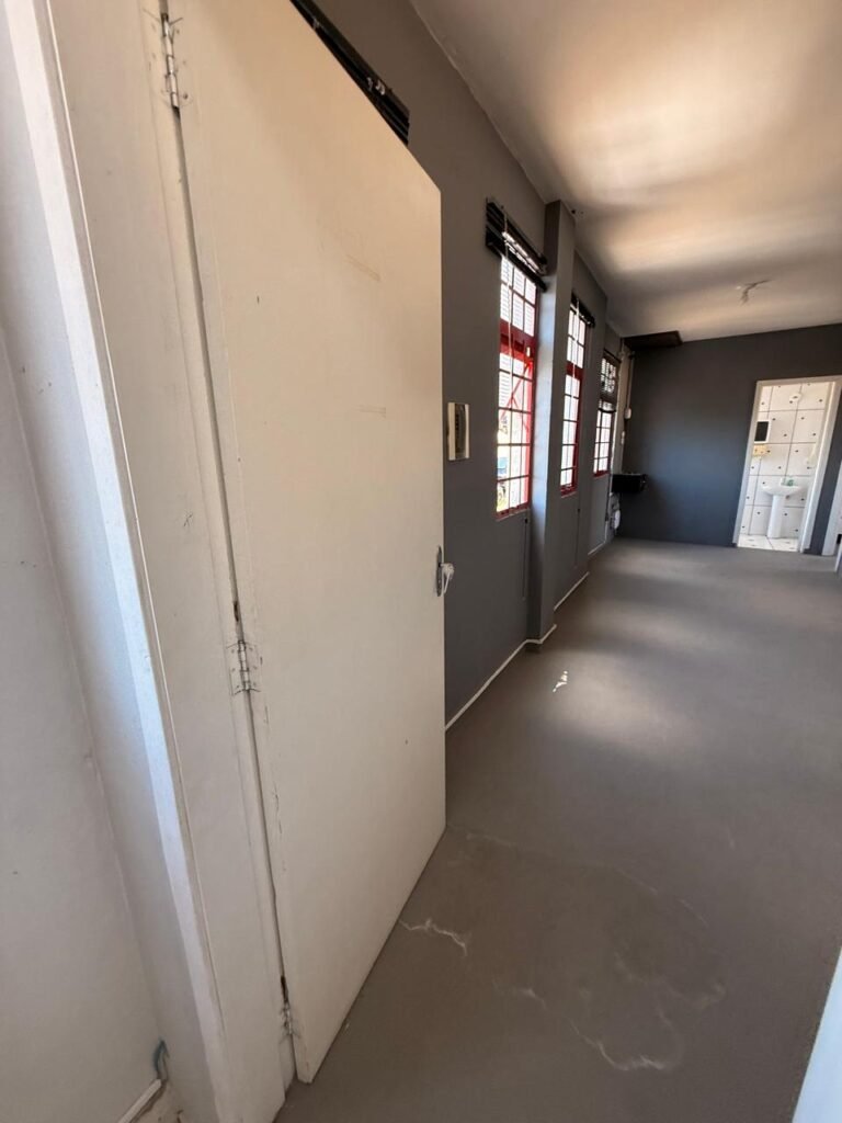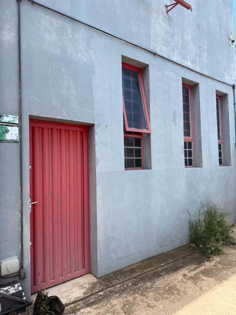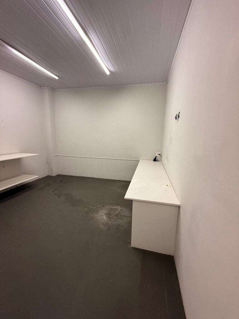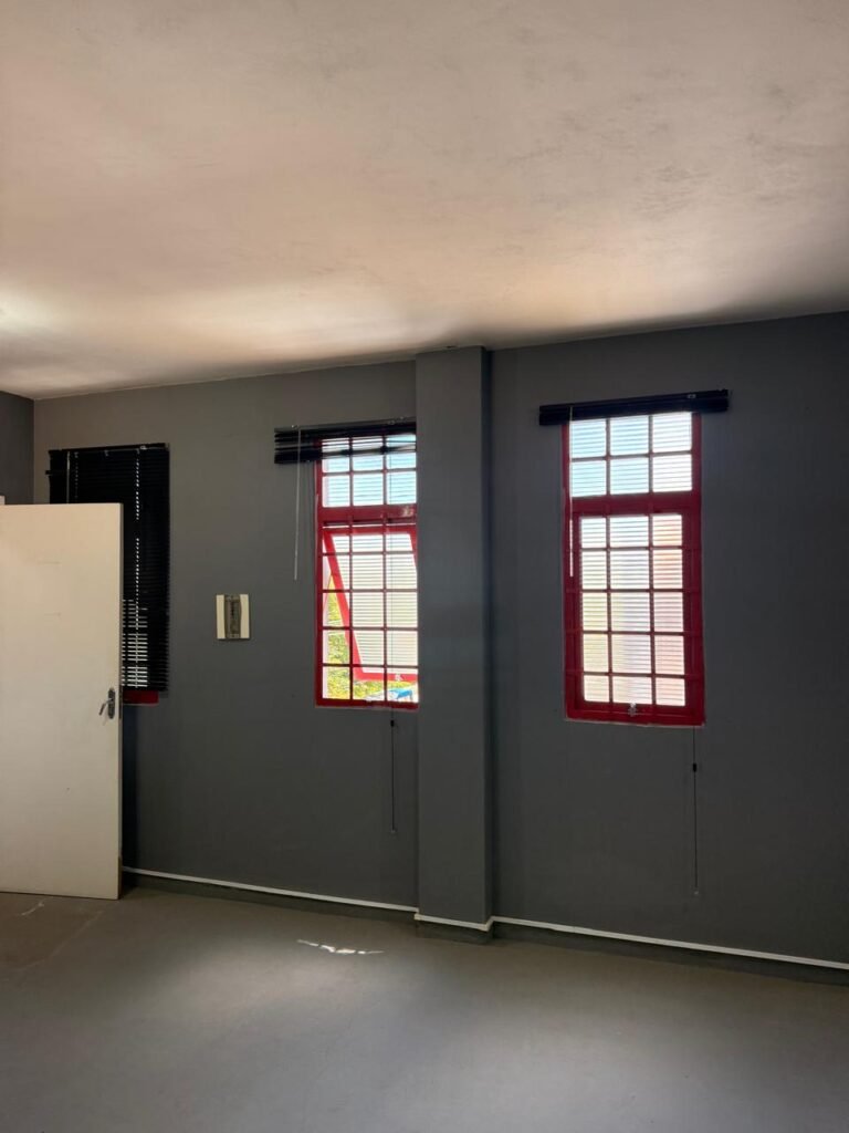 ADM:- Piso concreto desempenado com pintura nova com tinta piso da cor cinza, paredes com pintura na cor cinza, teto com pintura na cor branco, 04 soquetes com 04 lâmpadas LED bulbo em ordem, 04 vitrô basculante com pintura na cor vermelho em ordem, 04 puxadores em ordem, 02 vitrô de correr com pintura na cor vermelho em ordem, travas em ordem, 53 vidros em ordem, porta de madeira com pintura na cor branco, 02 maçanetas em ordem, fechadura yale sem chave, 05 persianas horizontais em ordem, 11 espelhos de luz em ordem, 02 interruptores em ordem, 18 tomadas em ordem, caixa de disjuntores com 05 disjuntores alumbra sendo (01) C16/1, (02) C52/2, (01) C40/2 e (01) C63/2, 01 sensor de presença, 01 câmera intelbras, 01 central de alarme, 01 DVR MHD2 MOB.