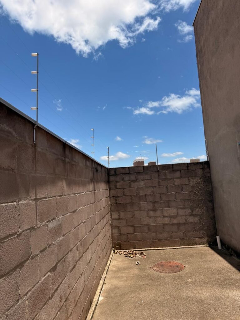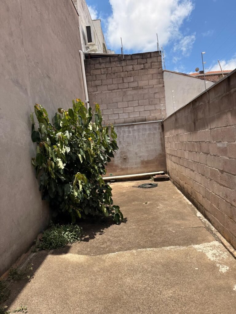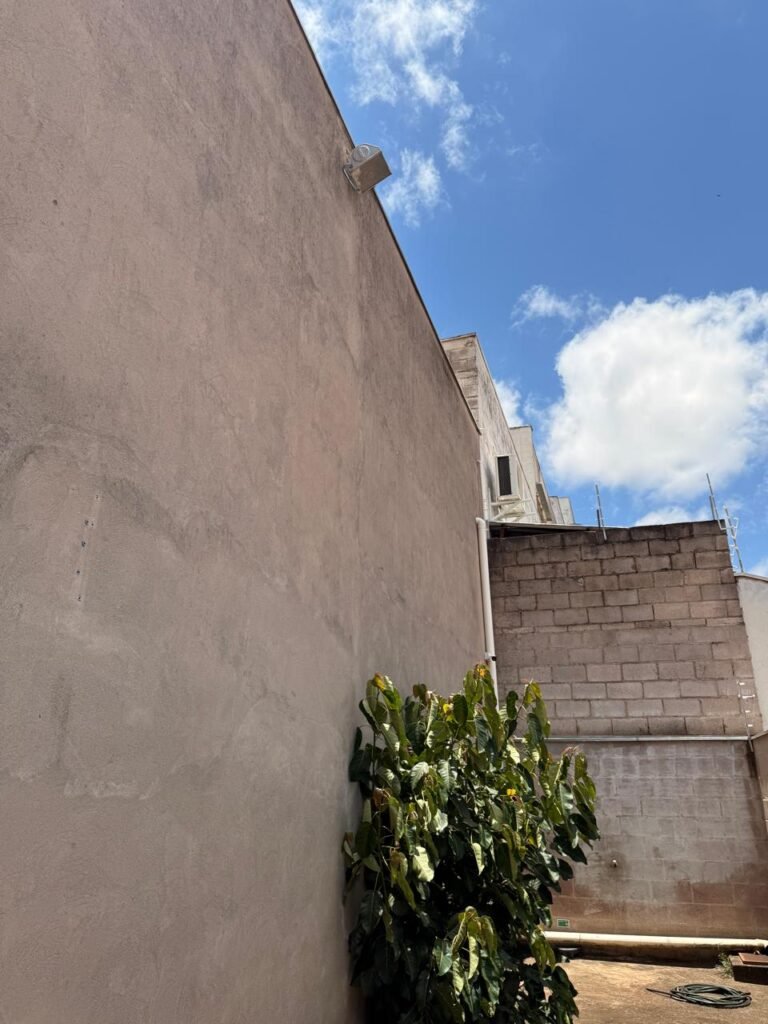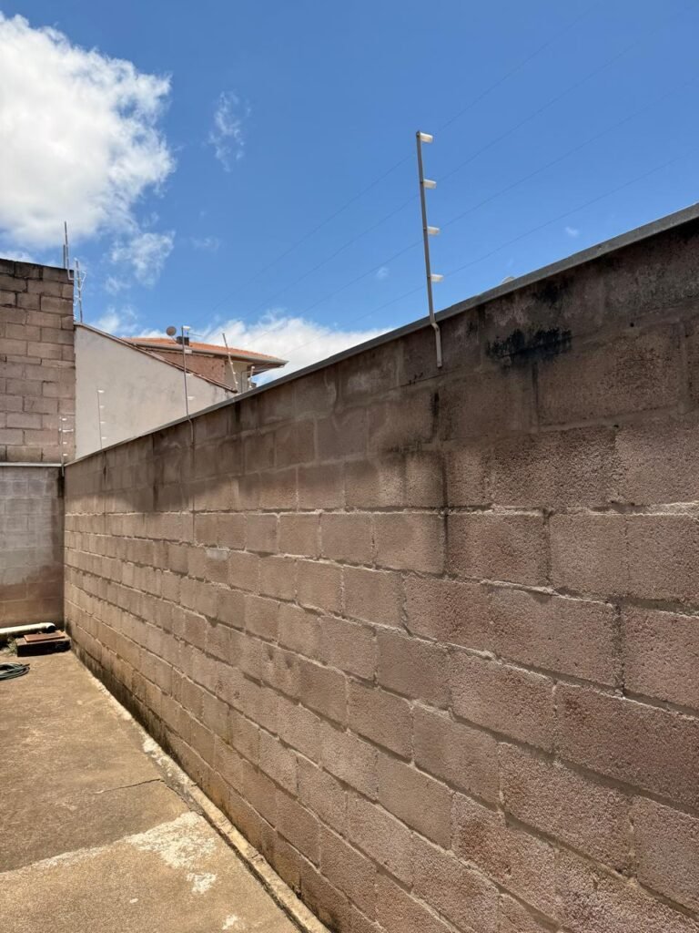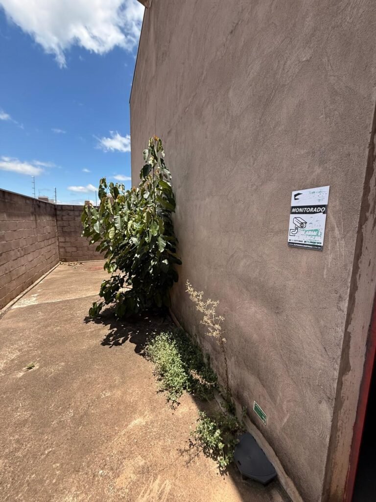 FUNDOS:- piso de concreto com manchas de uso, 02 ralos com tampa, 01 holofote, 02 torneiras de jardim, 02 tomadas, 01 espelho de luz, muro blocos aparentes sem pintura, pingadeira em ordem, paredes galpão com reboco e sem pintura, 01 condutor de água cano PVC 100 mm, cerca elétrica em toda extensão dos muros em ordem, 01 câmera de vigilância Intelbras.