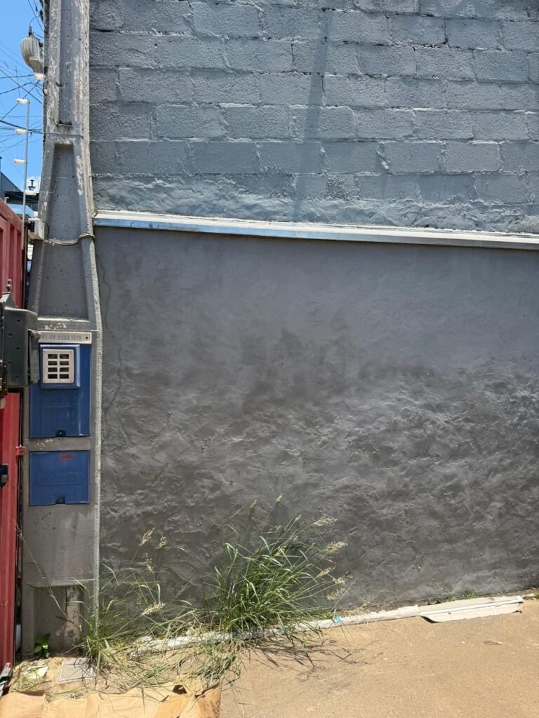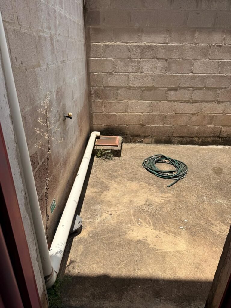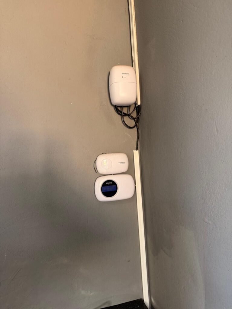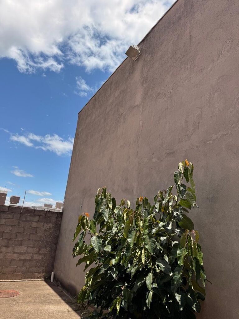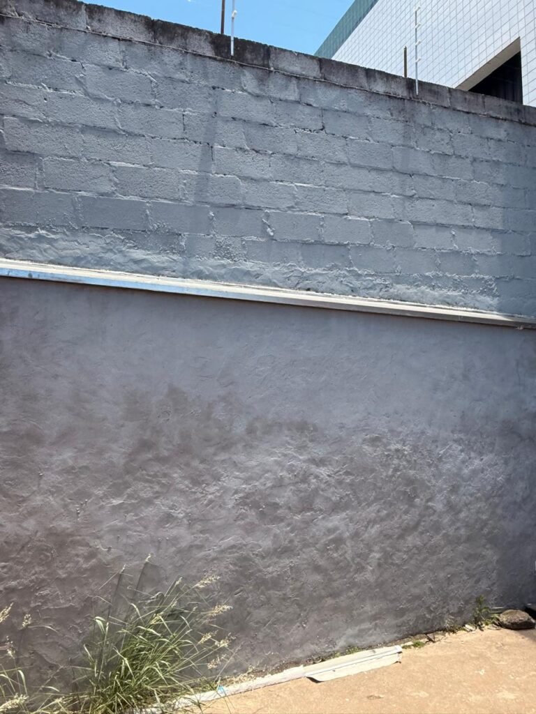 FUNDOS:- piso de concreto com manchas de uso, 02 ralos com tampa, 01 holofote, 02 torneiras de jardim, 02 tomadas, 01 espelho de luz, muro blocos aparentes sem pintura, pingadeira em ordem, paredes galpão com reboco e sem pintura, 01 condutor de água cano PVC 100 mm, cerca elétrica em toda extensão dos muros em ordem, 01 câmera de vigilância Intelbras.