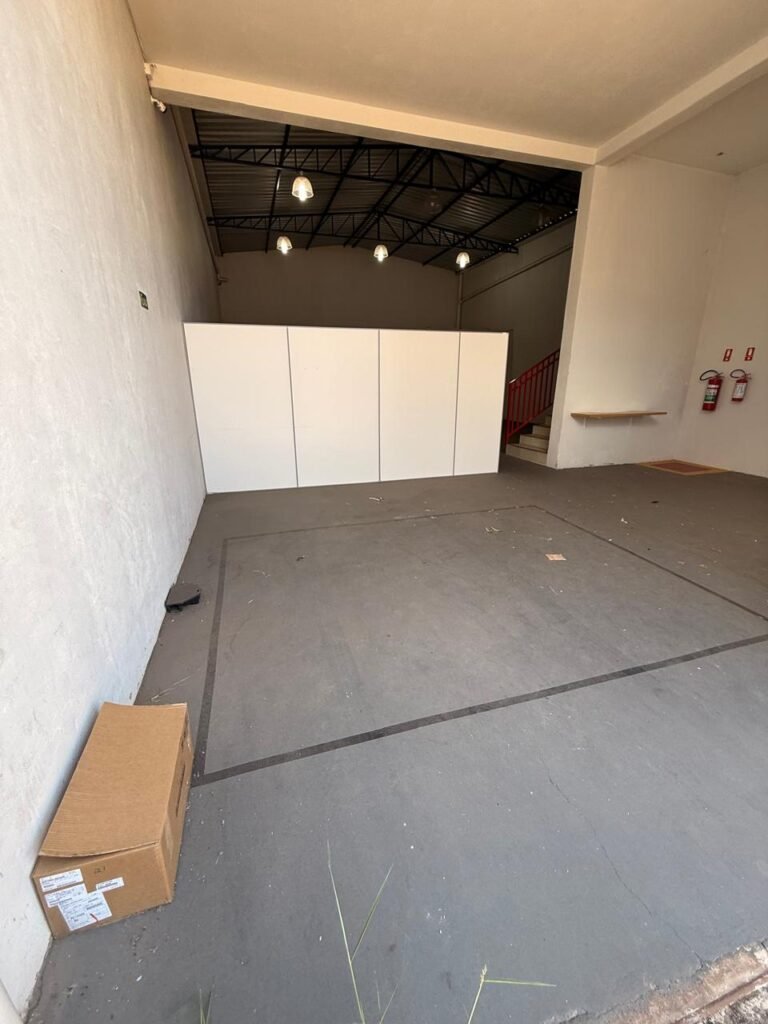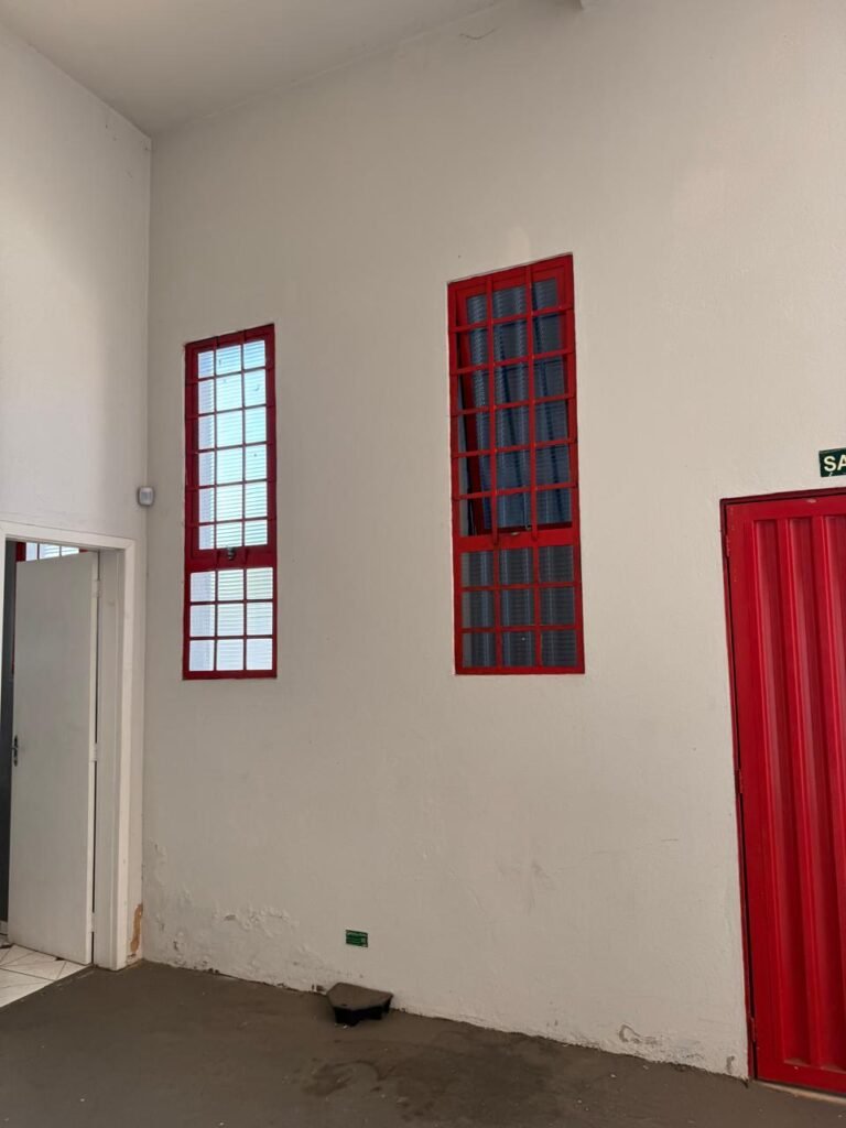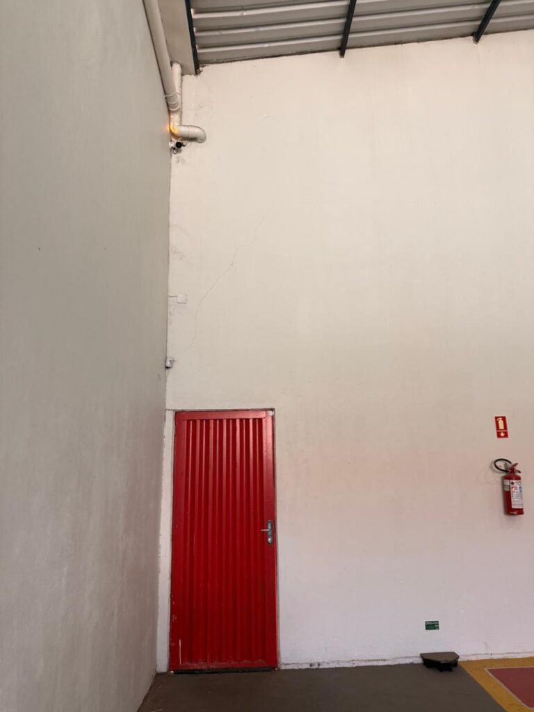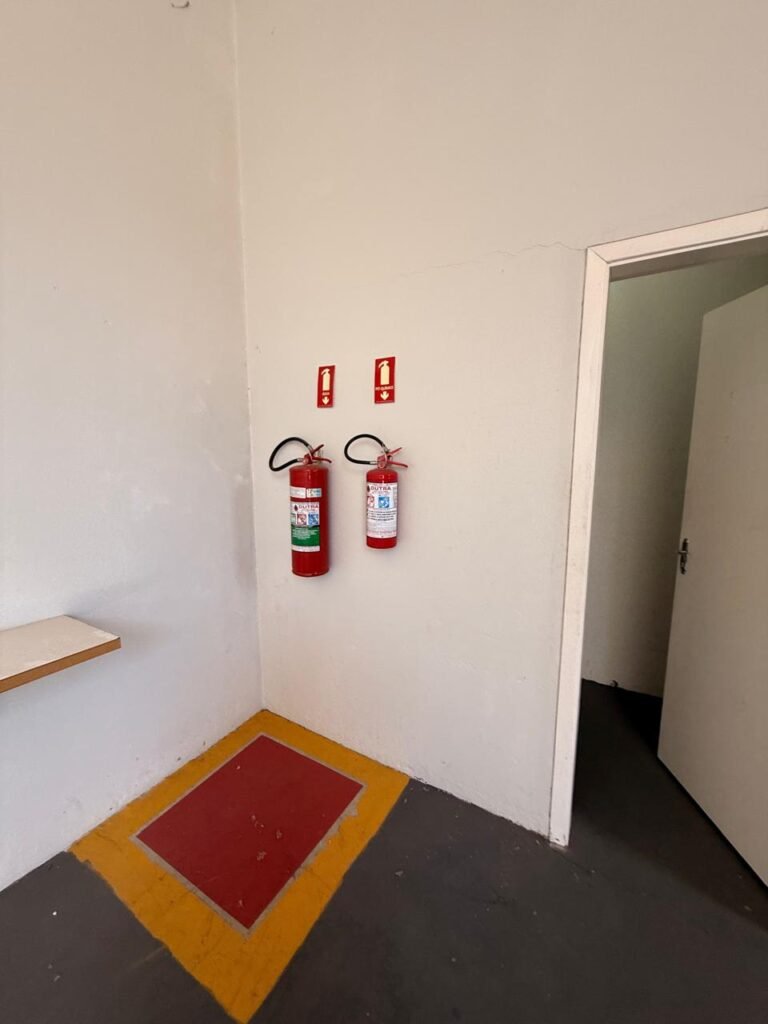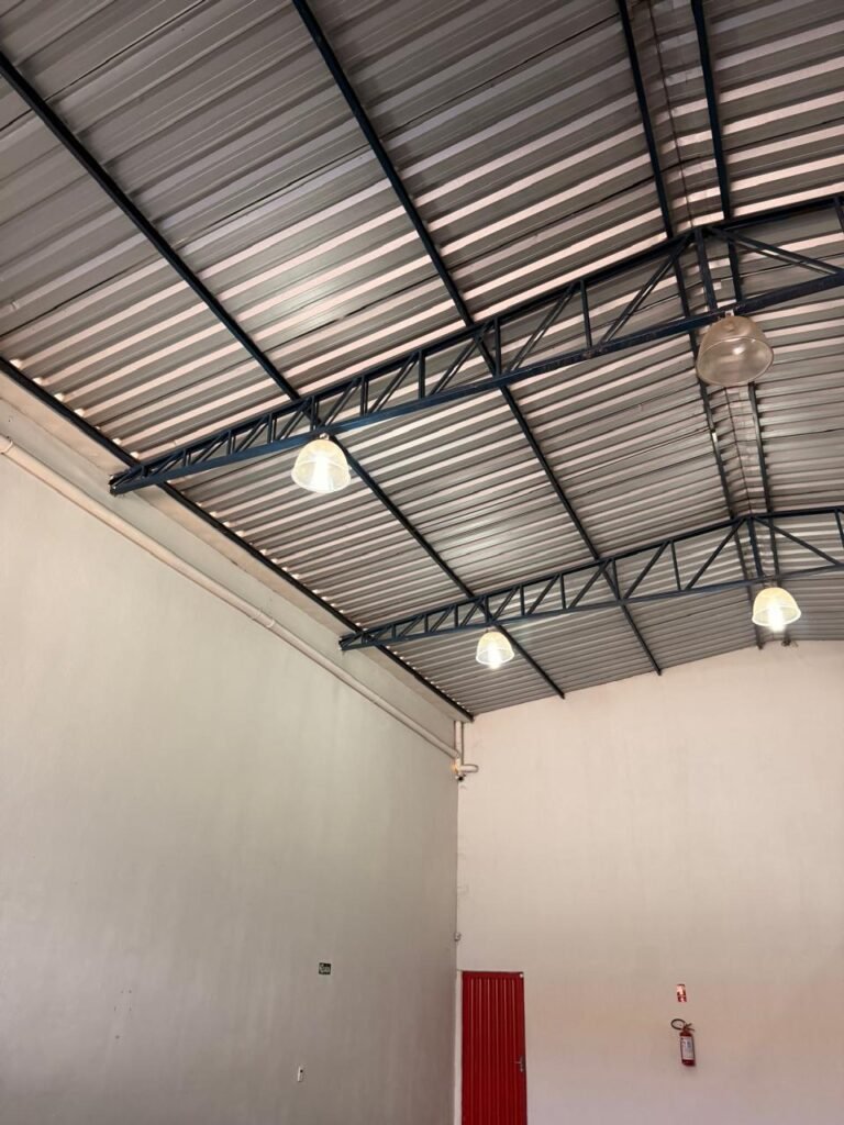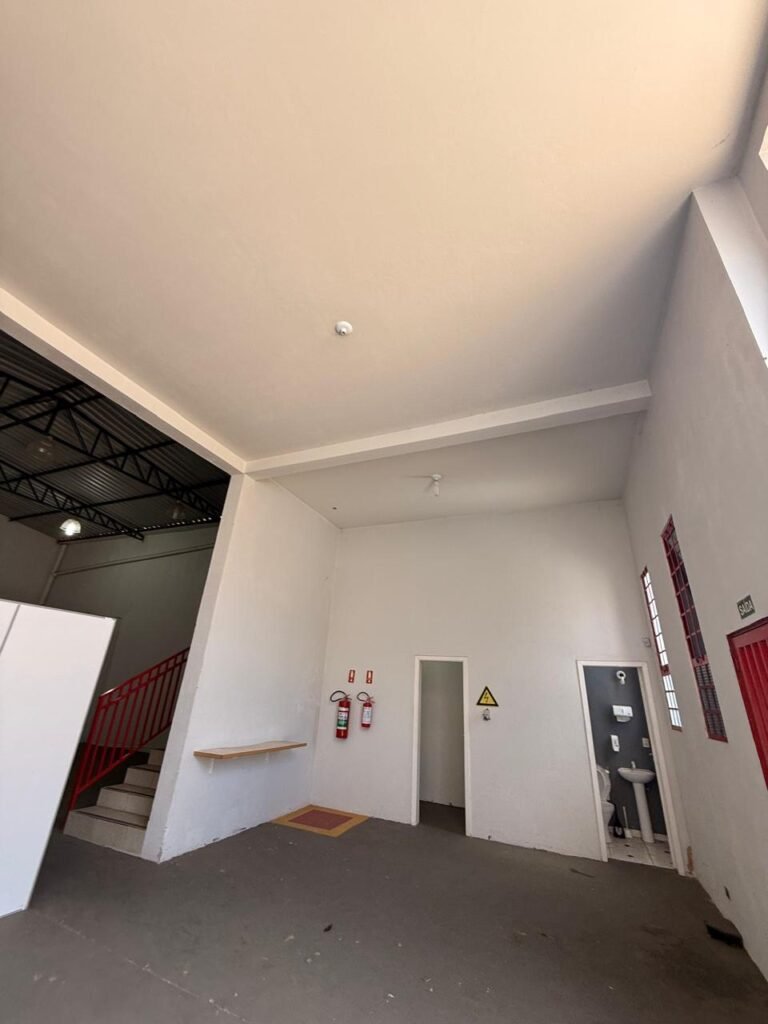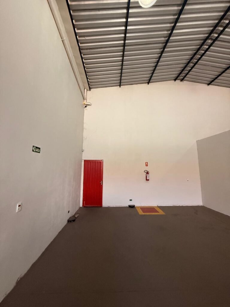 GALPÃO:- Piso concreto usinado polido em ordem, paredes com reboco e pintura látex na cor branco gelo com manchas de infiltração, telhado estrutura de ferro com pintura na cor azul em ordem, telhas galvanizadas em ordem, 06lustres em ordem, 04 lâmpadas fluorescentes em ordem, 03 soquetes em ordem, 03 interruptores em ordem,10 tomadas em ordem, 08 espelhos de luz em ordem, 01 tomada stek em ordem, 02 vitrôs basculantes em ordem, 20 vidros em ordem, porta social chapa dobrada com pintura na cor vermelha em ordem, portão deslizante chapa dobrada com pintura interna na cor cinza e pintura externa na cor vermelha com desgastes naturais, roldanas em ordem, sinalização de emergência em ordem, 03 câmeras intelbras em ordem, porta fundos chapa dobrada na cor vermelha sem chaves tetra restante em ordem, 03 extintores em ordem sendo 02 pó químico 4 kg 20 b:c e 01 água 10 litros 2-a em ordem, 01 parede de dry wall, demarcações no piso com faixas verdes.