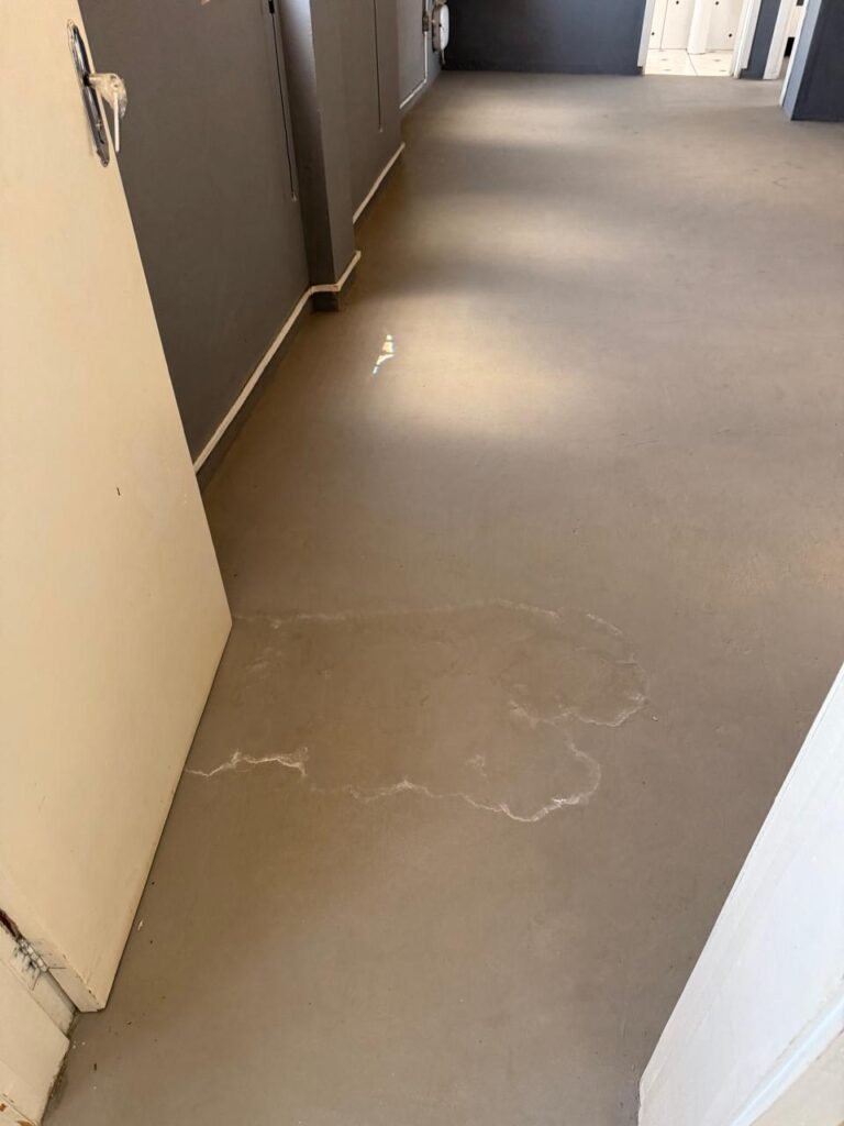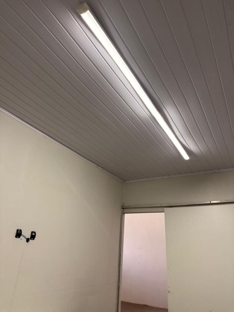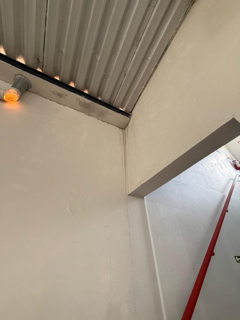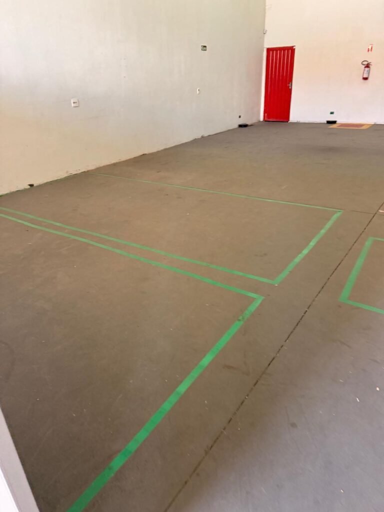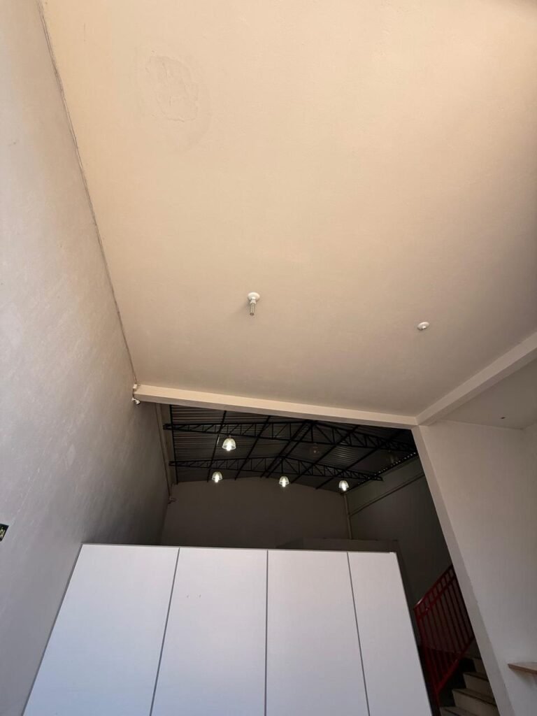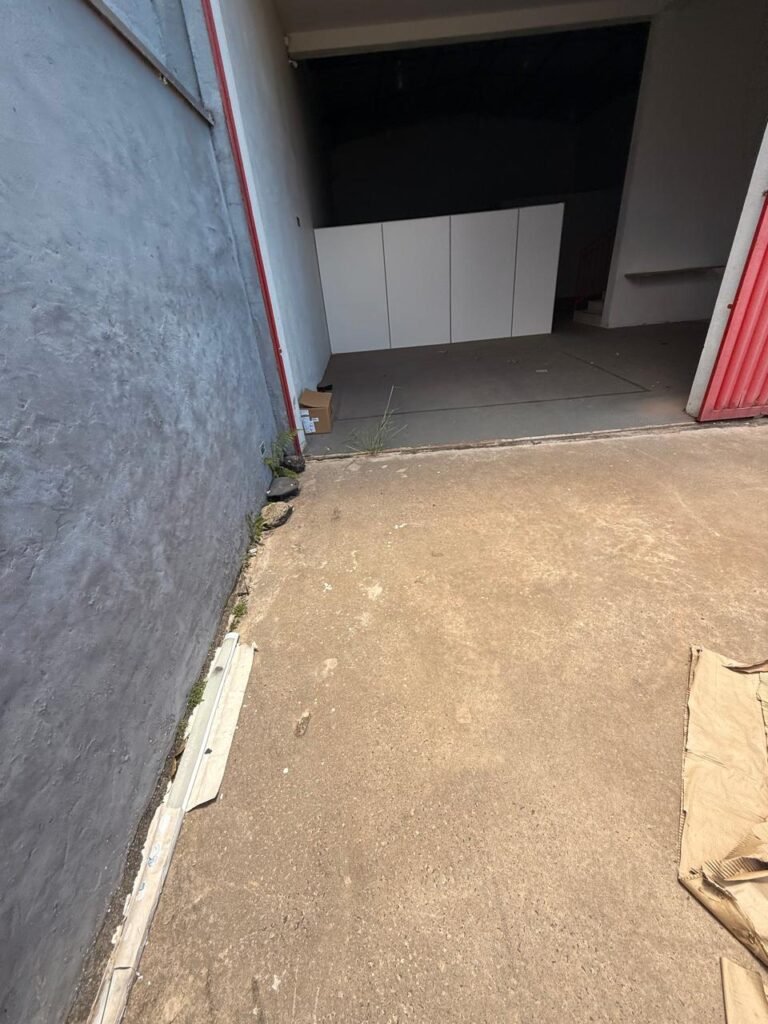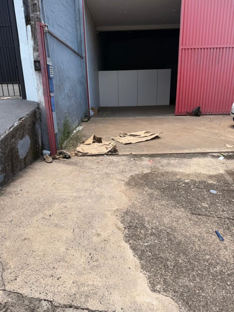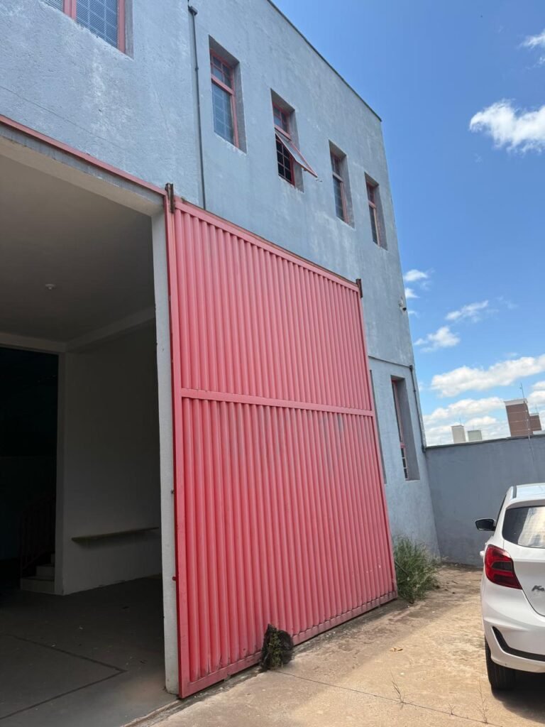 GALPÃO:- Piso concreto usinado polido em ordem, paredes com reboco e pintura látex na cor branco gelo com manchas de infiltração, telhado estrutura de ferro com pintura na cor azul em ordem, telhas galvanizadas em ordem, 06lustres em ordem, 04 lâmpadas fluorescentes em ordem, 03 soquetes em ordem, 03 interruptores em ordem,10 tomadas em ordem, 08 espelhos de luz em ordem, 01 tomada stek em ordem, 02 vitrôs basculantes em ordem, 20 vidros em ordem, porta social chapa dobrada com pintura na cor vermelha em ordem, portão deslizante chapa dobrada com pintura interna na cor cinza e pintura externa na cor vermelha com desgastes naturais, roldanas em ordem, sinalização de emergência em ordem, 03 câmeras intelbras em ordem, porta fundos chapa dobrada na cor vermelha sem chaves tetra restante em ordem, 03 extintores em ordem sendo 02 pó químico 4 kg 20 b:c e 01 água 10 litros 2-a em ordem, 01 parede de dry wall, demarcações no piso com faixas verdes.