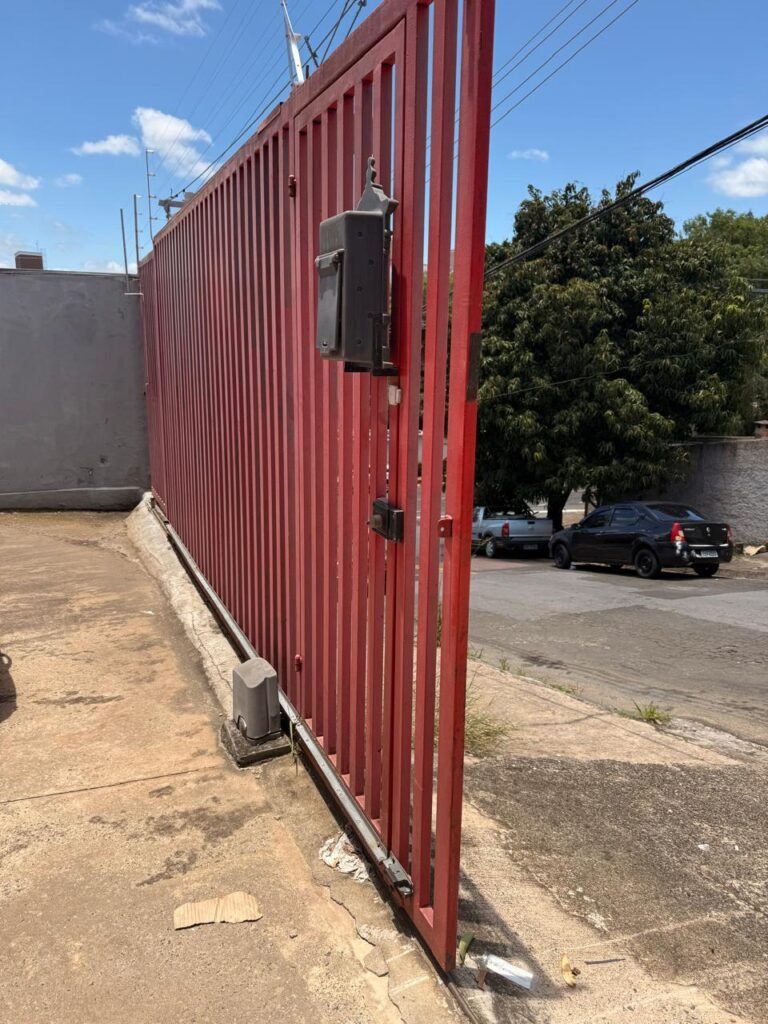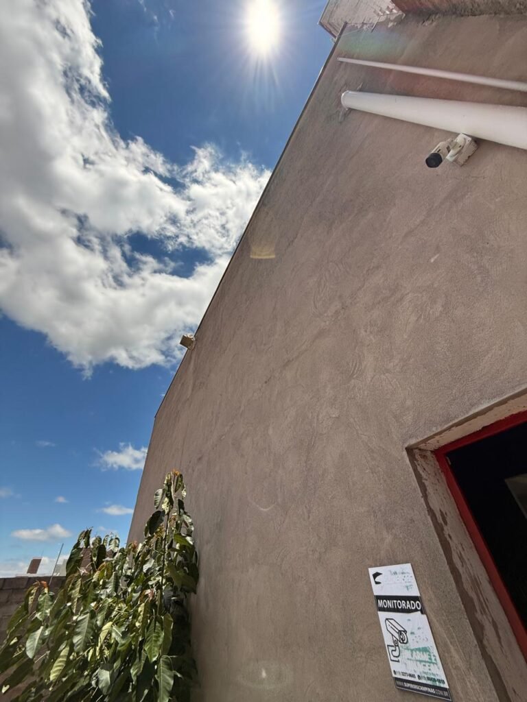 FACHADA:- Calçada rampa de acesso concreto desempenado em ordem, interfone Intelbras, cerca elétrica nos muros da frente e dos fundos, alarme em todas as portas com sensores, portão deslizante e grade de ferro tubular com pintura na cor vermelho, estacionamento interno com piso concreto desempenado em ordem, fachada do galpão com pintura na cor cinza com manchas de infiltração e restante em ordem, portão de chapa dobrada com pintura na cor vermelho, padrão de força CPFL em ordem, padrão de água Sanasa em ordem, 02 câmeras em ordem, 02 holofotes led em ordem, 02 portões automatizados 01 com motor PPA e outro com motor Peccinin ambos em ordem, controles remotos em ordem.