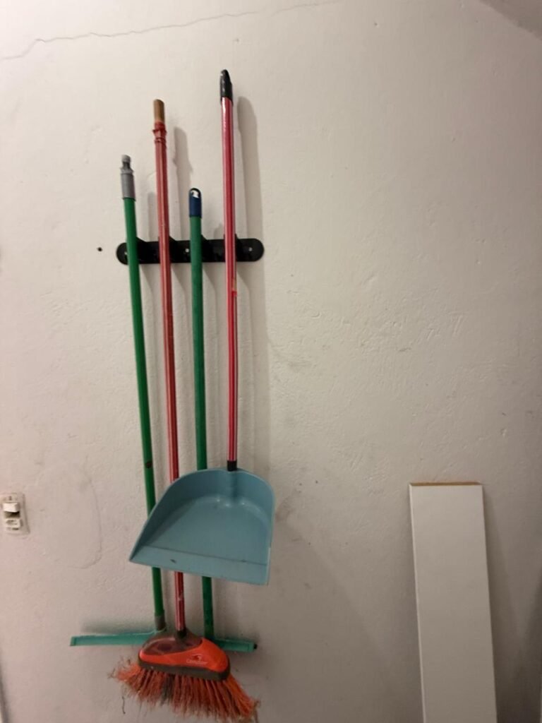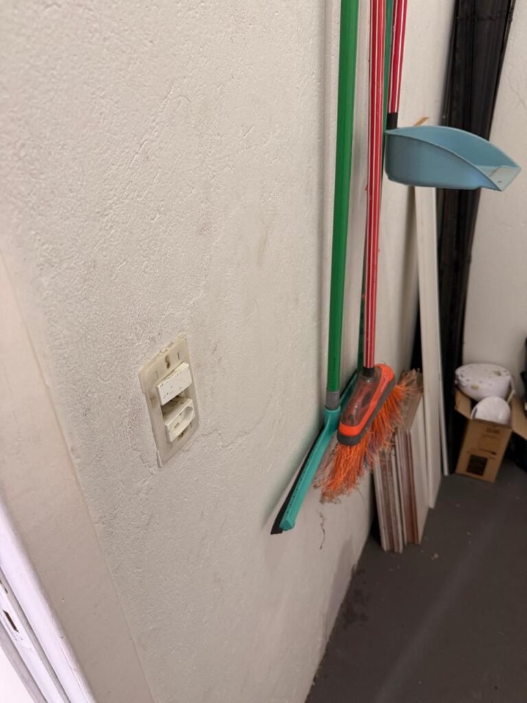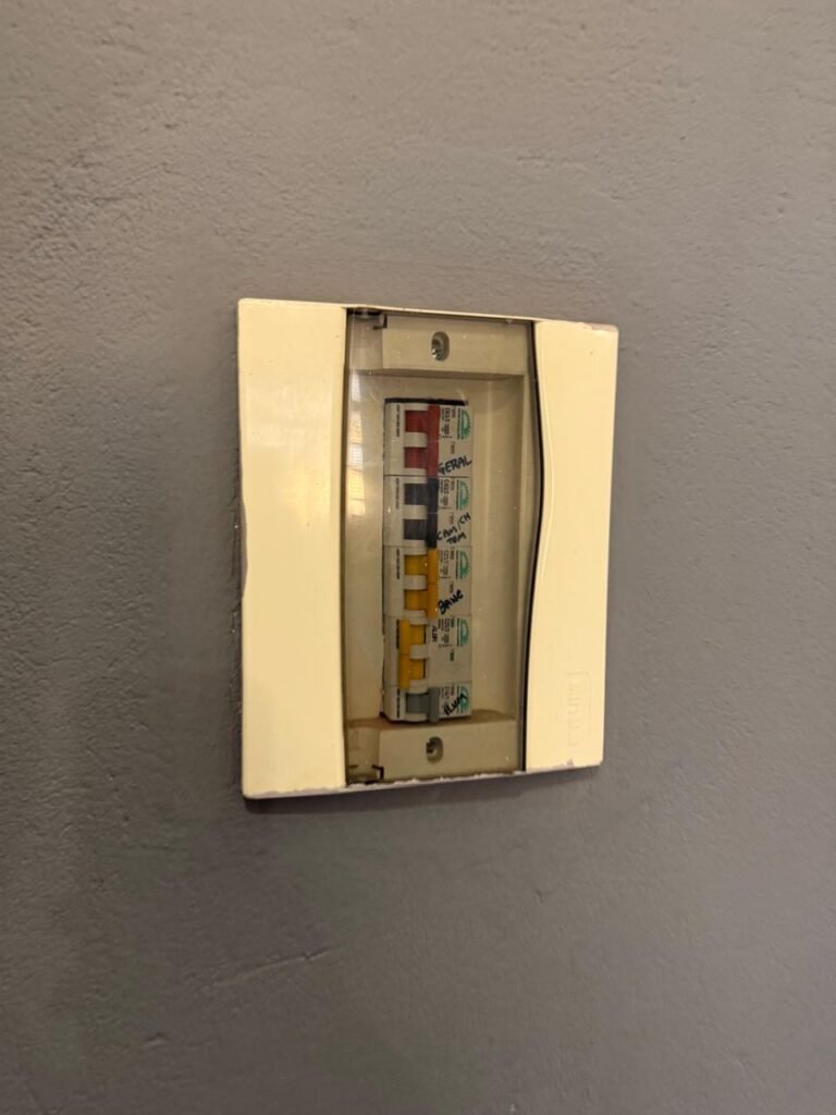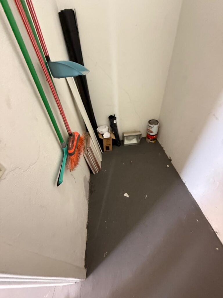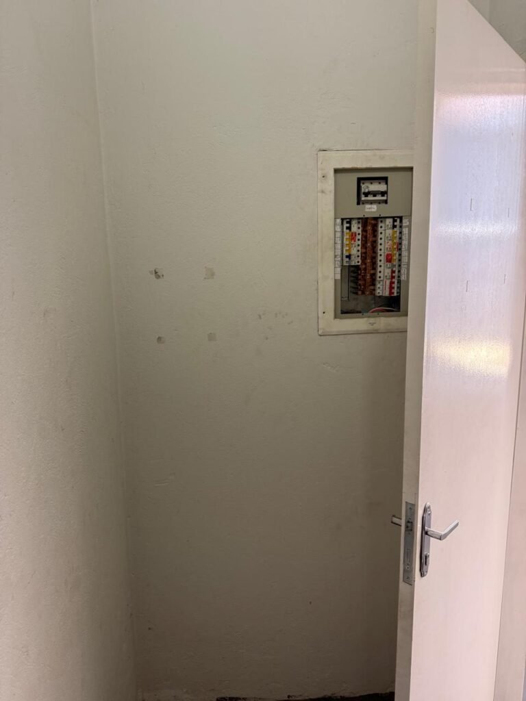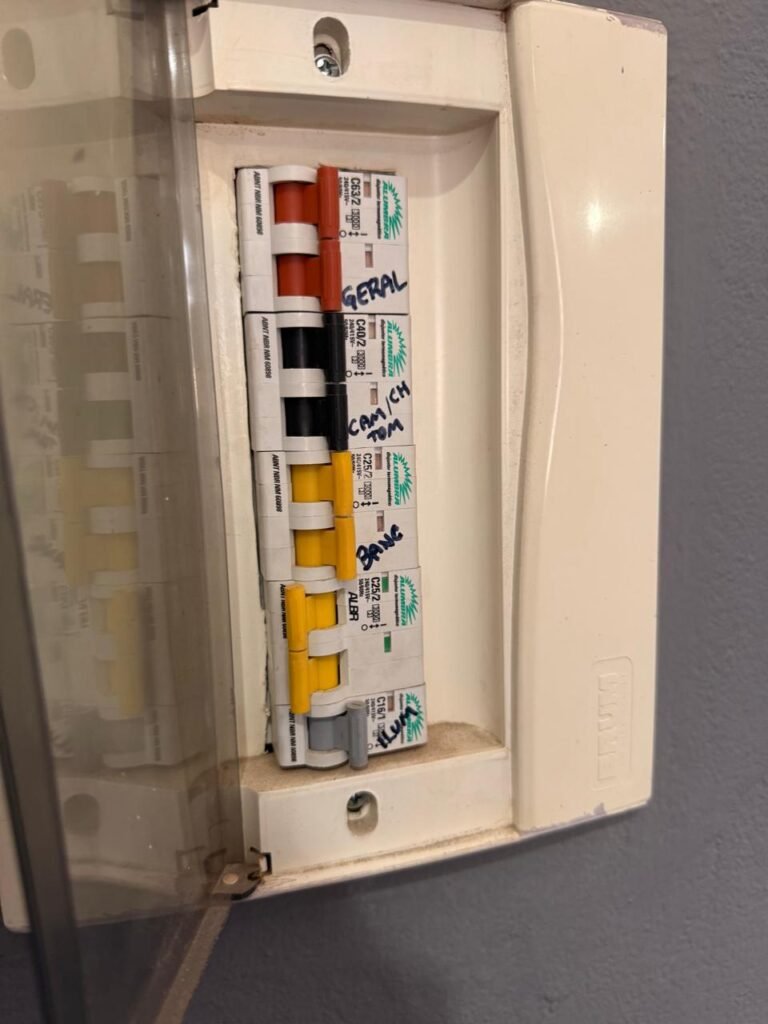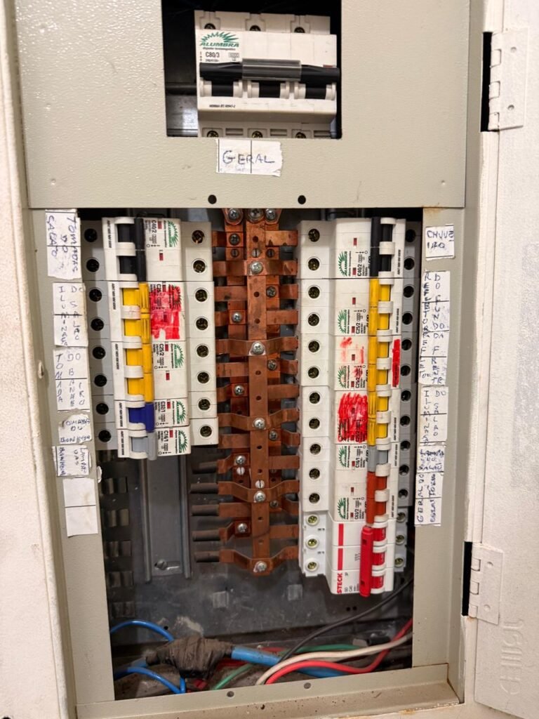 CÔMODO SOB ESCADA:- Piso concreto usinado polido com manchas de tinta restante em ordem, paredes e teto na cor branco com manchas e restante em ordem, 02 soquete com lâmpada fluorescente em ordem, 01interruptor em ordem, 01 tomada sem espelho de luz, porta de madeira com pintura na cor branco com desgastes naturais e saindo lascas, 01 maçanetas marca Arouca danificada, fechadura Yale faltando chave, 01 suporte para vassoura em ordem, quadro de disjuntores com tampa fora do lugar com 13 disjuntores sendo 01 C80/ 3 240/415w marca alumbra, 01 C40/2marca alumbra, 01 SD C40 400 w marca steck, 05 C52/2 240/415 w marca alumbra, 01 C16/1 marca alumbra, 02 C32/1 marca alumbra 01 C40/2 marca alumbra.
