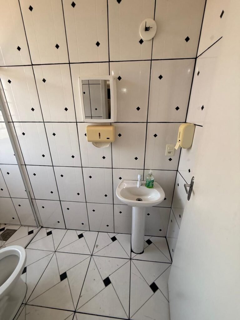 W.C. 2:- Piso frio cerâmico em ordem, azulejo até o teto em ordem, 01 soquete em ordem, 02 interruptores em ordem, 01 tomada em ordem, 02 espelhos de luz em ordem, 01 spot na cor branco sem lâmpada, 01 ralo com tampa inox e desentupido em ordem, porta de madeira com pintura na cor branco com desgastes naturais, 02 maçanetas em ordem fechadura sem chave, 01 vitrô basculante com pintura na cor vermelho em ordem, 10 vidros em ordem, box blindex transparente em ordem, armário de pequeno porte com espelho em ordem, registro com canopla restante em ordem, conjunto lavatório e coluna cerâmica na cor branco em ordem, torneira em ordem, conjunto vaso sanitário e caixa acoplada de descarga cerâmica na cor branca em ordem.