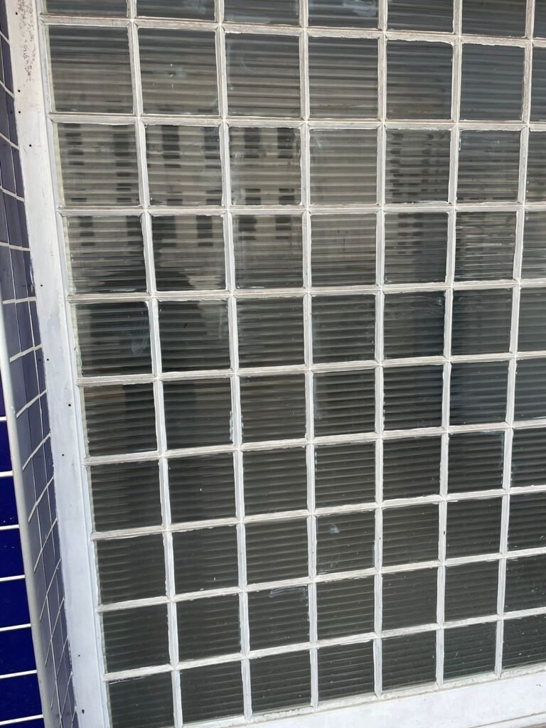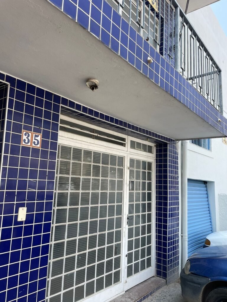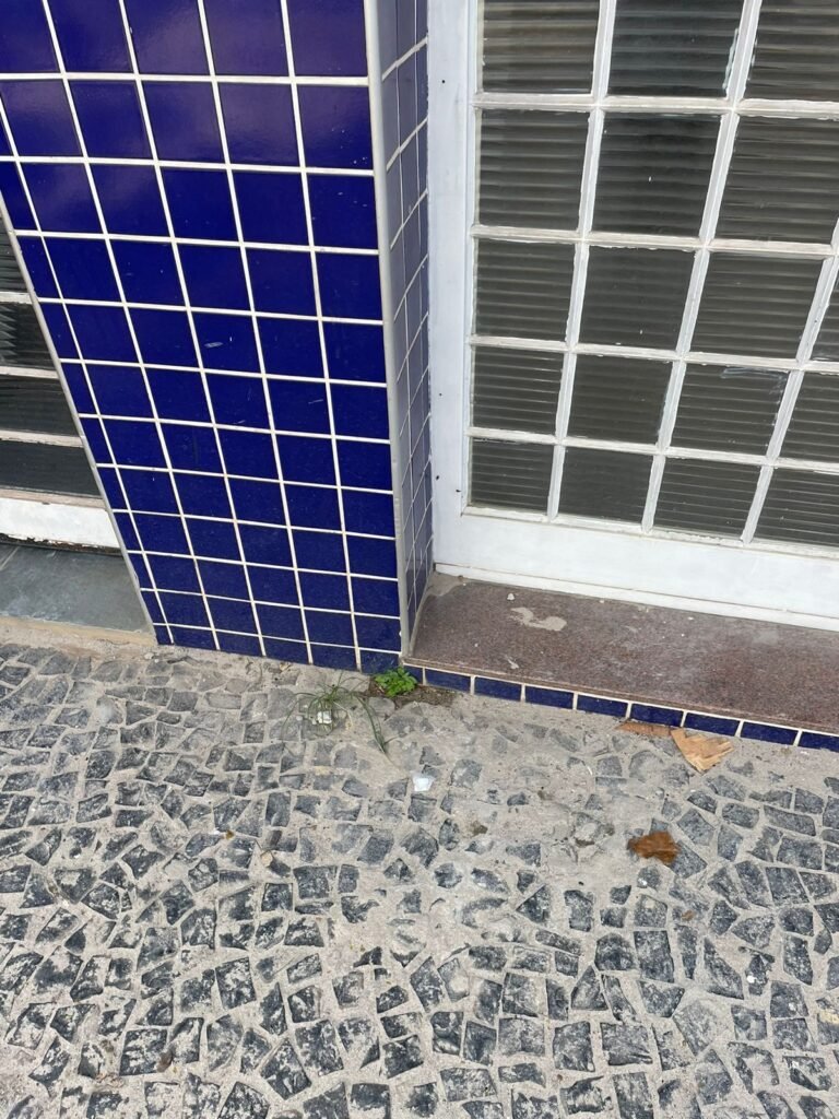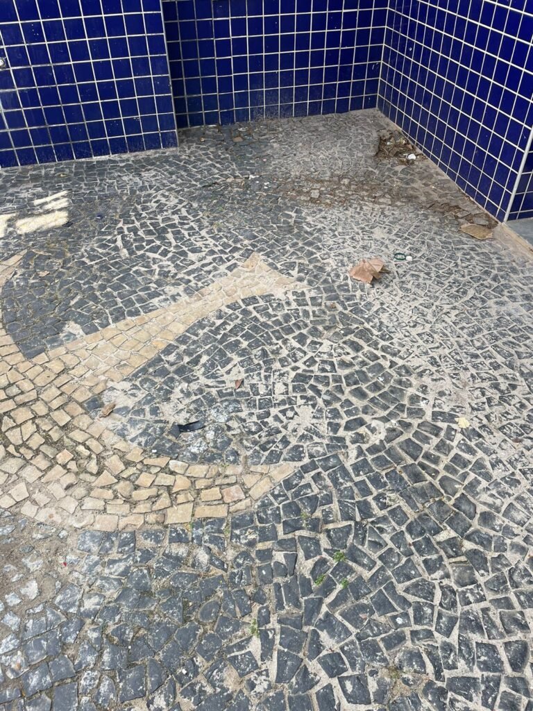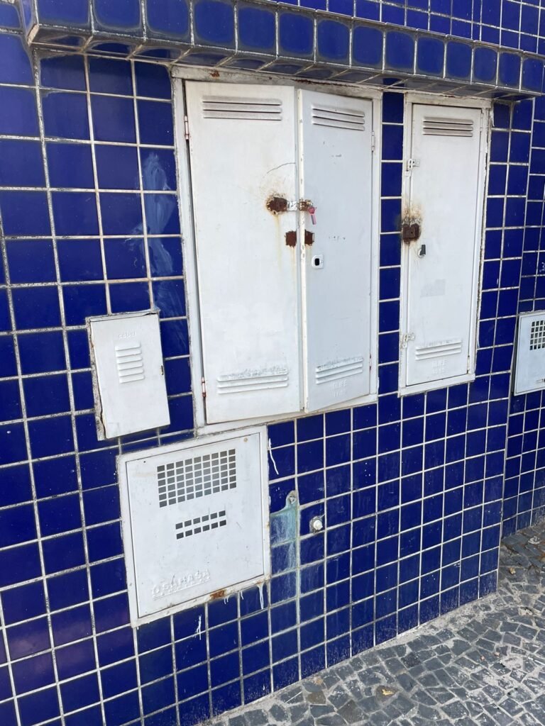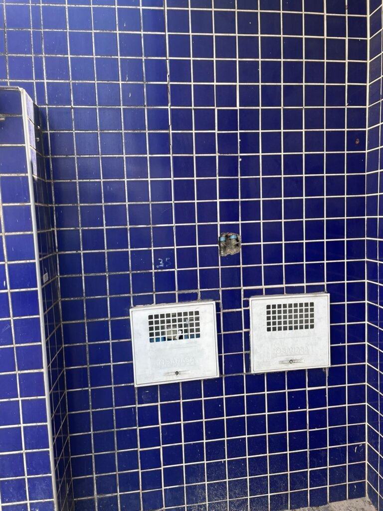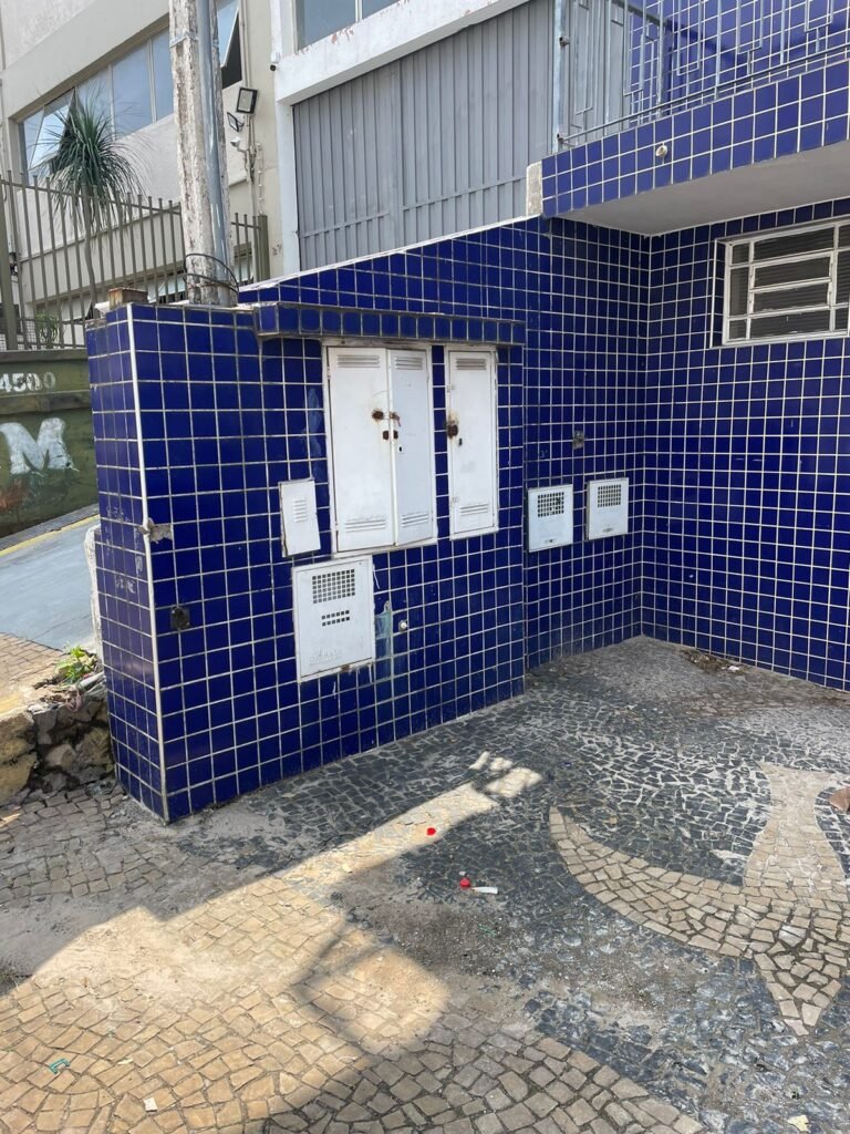 FACHADA-: Paredes revestidas de pastilhas de cerâmica na cor azul, com desgaste natural, partes danificadas e com buracos de instalações, 01 espelho de luz cego, 01 relógio Sanasa com tampa e lacre em ordem, 01 poste de energia com 02 tampas de ferro de proteção e disjuntor steck, 01 tampa com lacre em ordem, 01 sem lacre, 01 caixa Cebel com tampa danificada , 02 canopla do medidor da Sanasa.