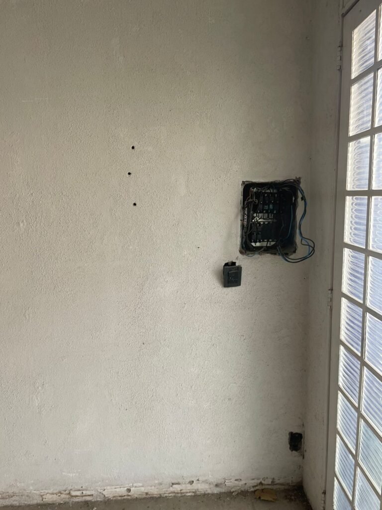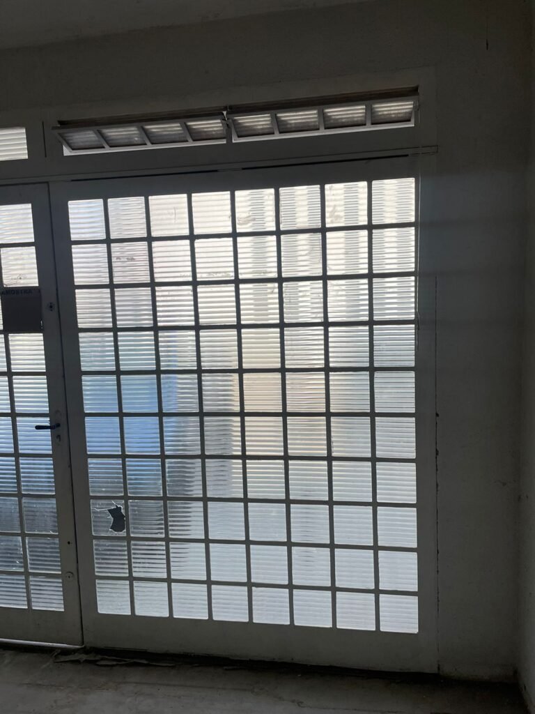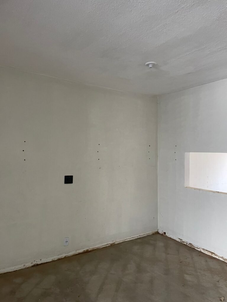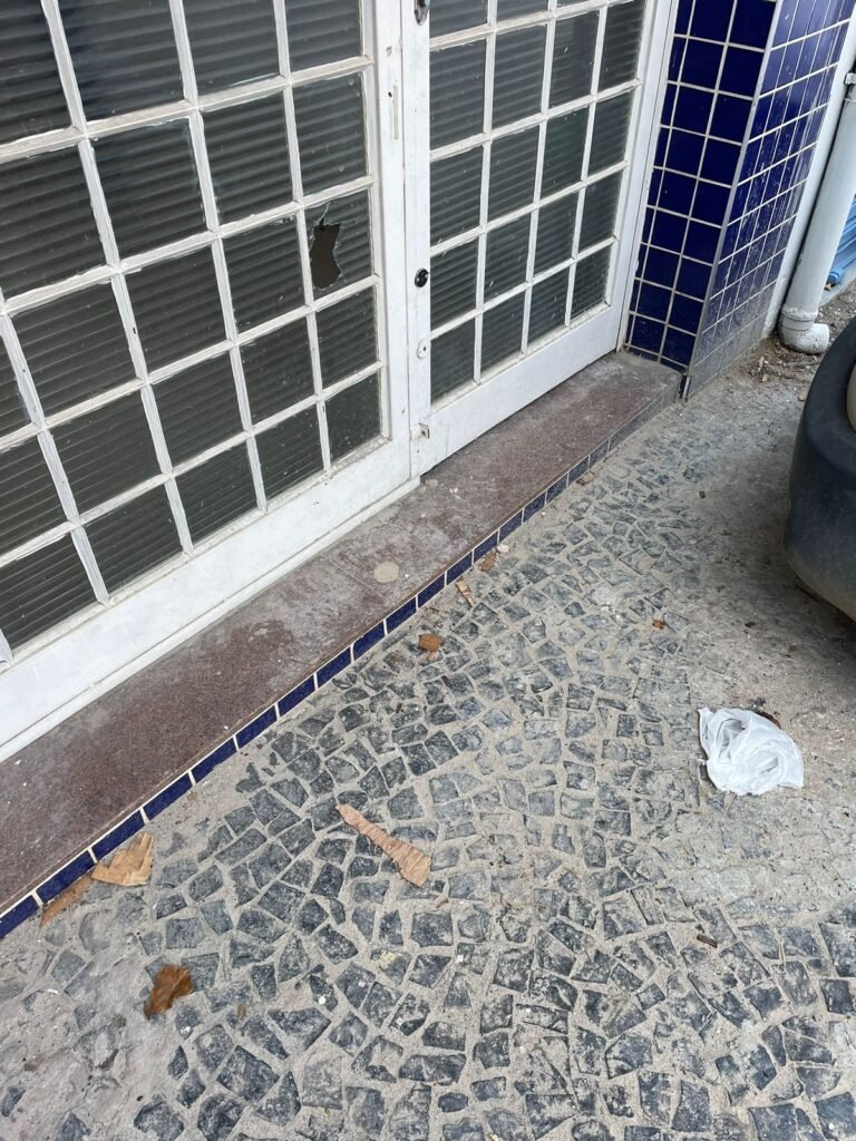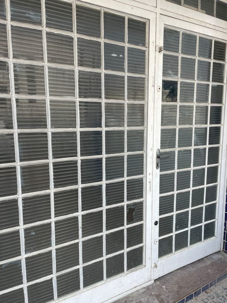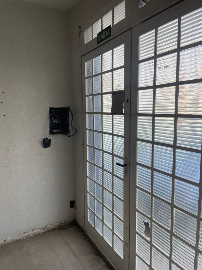 SALÃO-: 01 portão de ferro com 01 porta social dividida, ambos com pintura na cor branca, 03 fechaduras tetra sendo que 02 estão sem o acabamento, 01 fechadura yale, 01 maçaneta estilo imperial, porta social 44 vidros canelados quadriculados sendo que 02 estão trincados e restante está em ordem, porta maior fixa com 88 vidros canelados sendo que 01 está trincado e restante está em ordem, 01 caixa de disjuntor com fiação aparente, piso de concreto com rachaduras e desgaste natural, paredes em grafiato e pintura na cor branco neve com desgaste natural, buracos de instalações e partes em reforma, 04 vãos nas paredes de instalações sendo, 03 de portas e 01 de janela, 05 bocais de lâmpada sendo que apenas 01 está com lâmpada Led em ordem, 03 tomadas, 03 interruptores, 01 conexão de fios de dados, 02 espelhos em ordem, 02 espelhos danificados com fiação aparente.