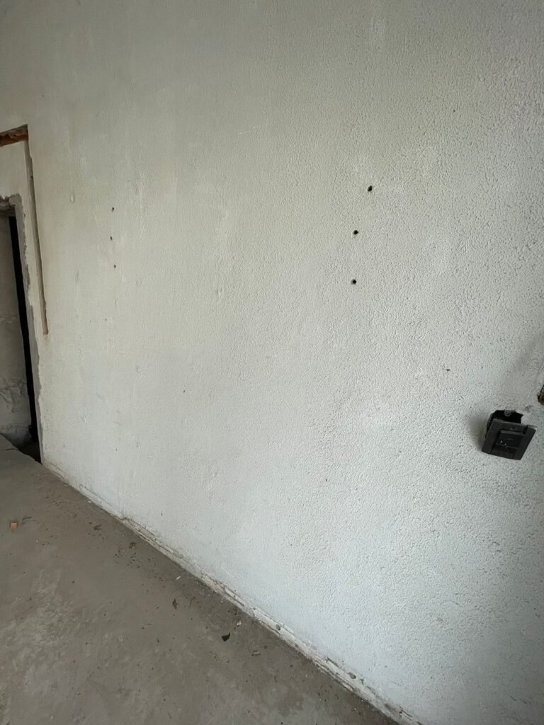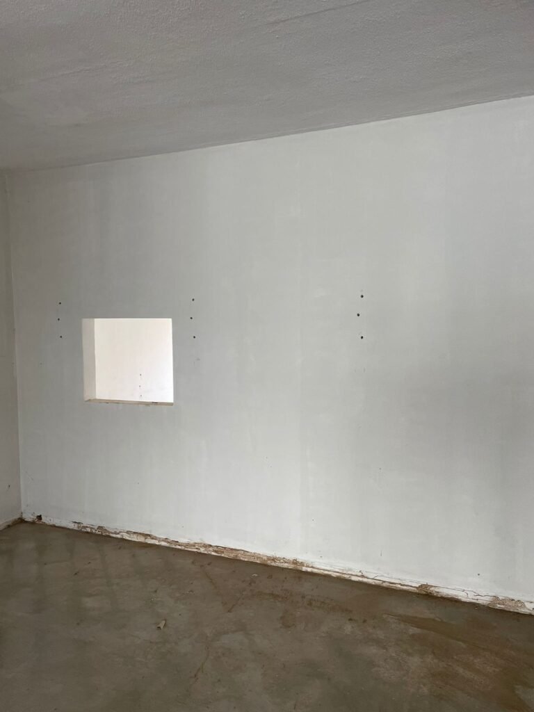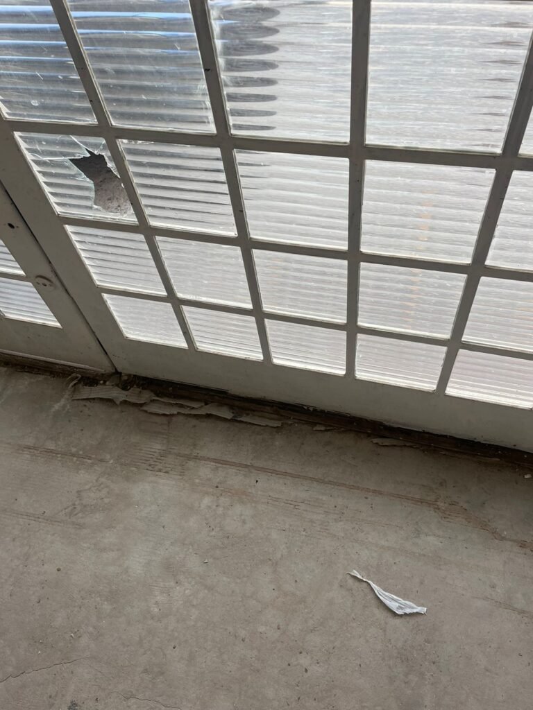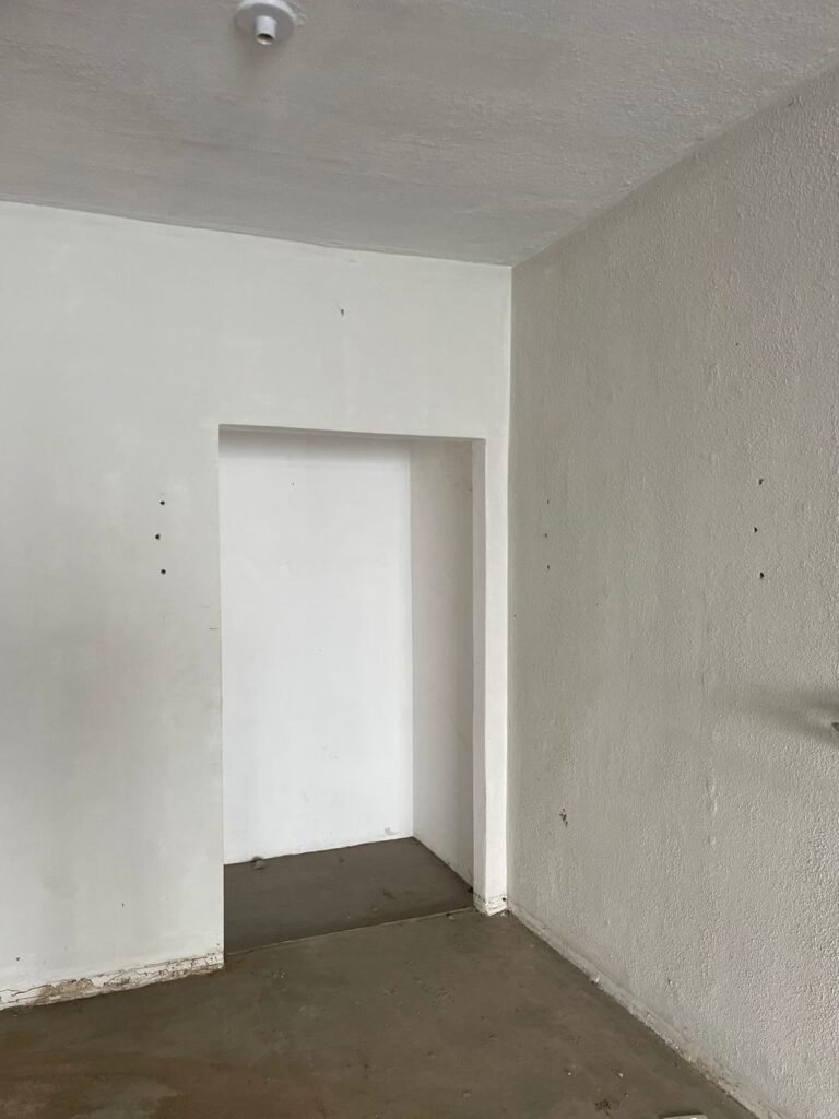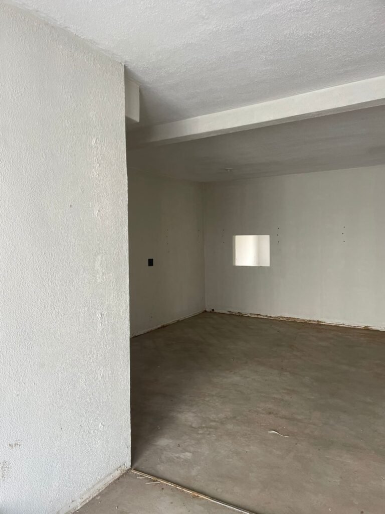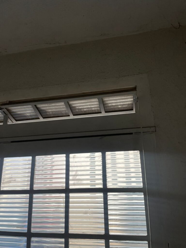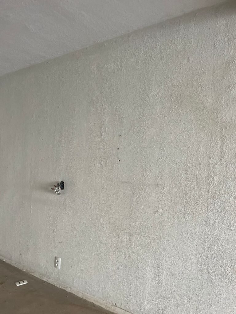 SALÃO-: 01 portão de ferro com 01 porta social dividida, ambos com pintura na cor branca, 03 fechaduras tetra sendo que 02 estão sem o acabamento, 01 fechadura yale, 01 maçaneta estilo imperial, porta social 44 vidros canelados quadriculados sendo que 02 estão trincados e restante está em ordem, porta maior fixa com 88 vidros canelados sendo que 01 está trincado e restante está em ordem, 01 caixa de disjuntor com fiação aparente, piso de concreto com rachaduras e desgaste natural, paredes em grafiato e pintura na cor branco neve com desgaste natural, buracos de instalações e partes em reforma, 04 vãos nas paredes de instalações sendo, 03 de portas e 01 de janela, 05 bocais de lâmpada sendo que apenas 01 está com lâmpada Led em ordem, 03 tomadas, 03 interruptores, 01 conexão de fios de dados, 02 espelhos em ordem, 02 espelhos danificados com fiação aparente.