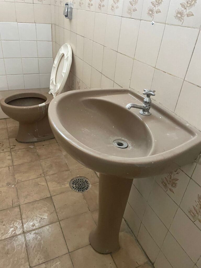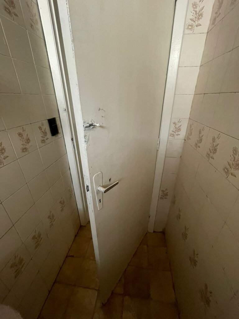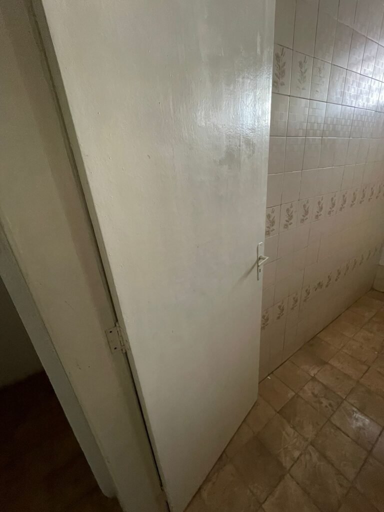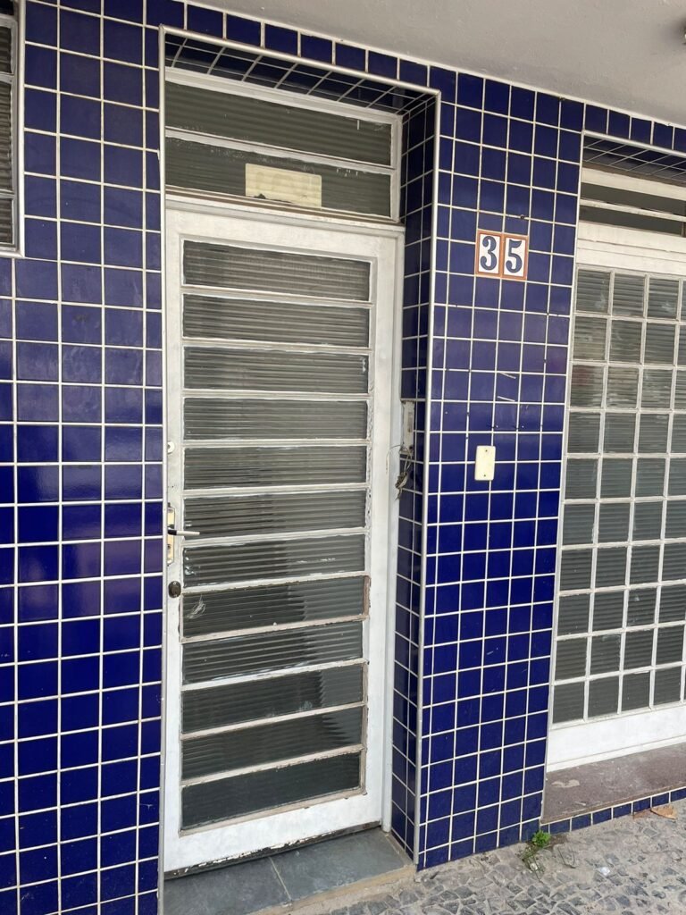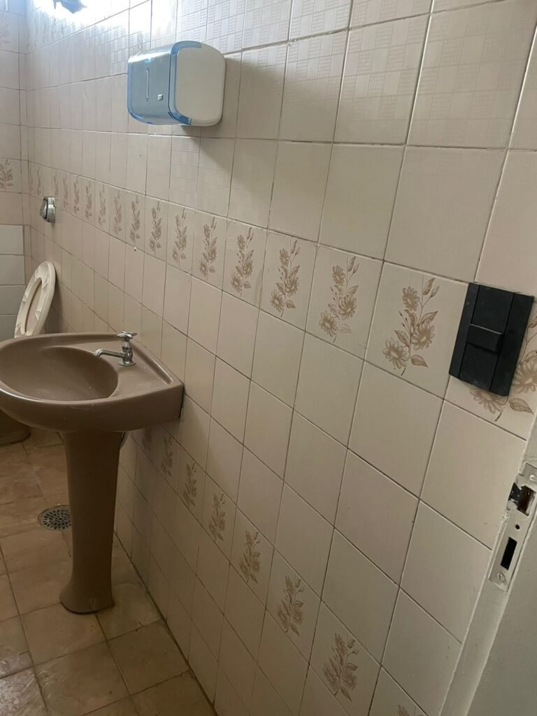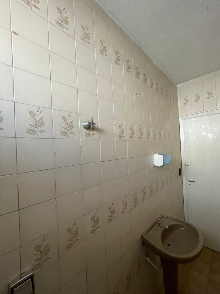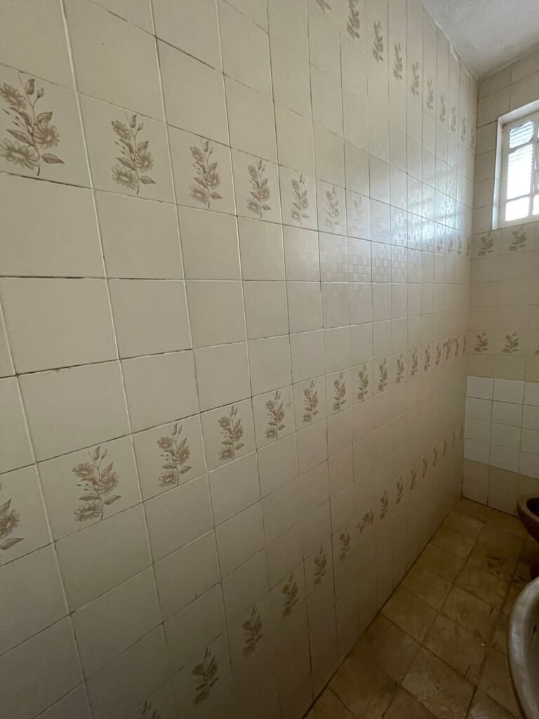 BANHEIRO 02-: 01 porta e batente de madeira com pintura na cor branca com desgaste natural, saindo lascas, maçaneta e fechadura com pintura na cor branca emperrando, 01 trinco em ordem, piso de cerâmica cor amarelo com desgaste natural, 01 ralo grelha de ferro, 03 paredes revestidas com pisos de cerâmica com desenhos em bege e desgaste natural, 01 parede revestida de pisos de cerâmica cor branco com desgaste natural, 01 pia com coluna de cerâmica cor marrom, com 01 torneira de inox sem água, 01 vaso sanitário de cerâmica cor marrom com acabamento solto, tampa em ordem, e descarga danificada, 02 canopla de registro de inox, fiação de instalação de chuveiro aparente, 01 vitrô basculante com pintura na cor branco, fechadura em ordem, e 06 vidros canelados com desgaste natural, 01 bocal de lâmpada sem acabamento e com 01 lâmpada Led, 01 interruptor com 01 tomada em ordem, 01 suporte de inox de toalha de rosto.