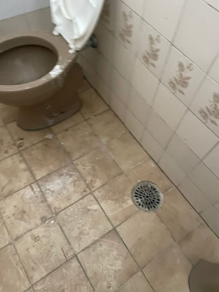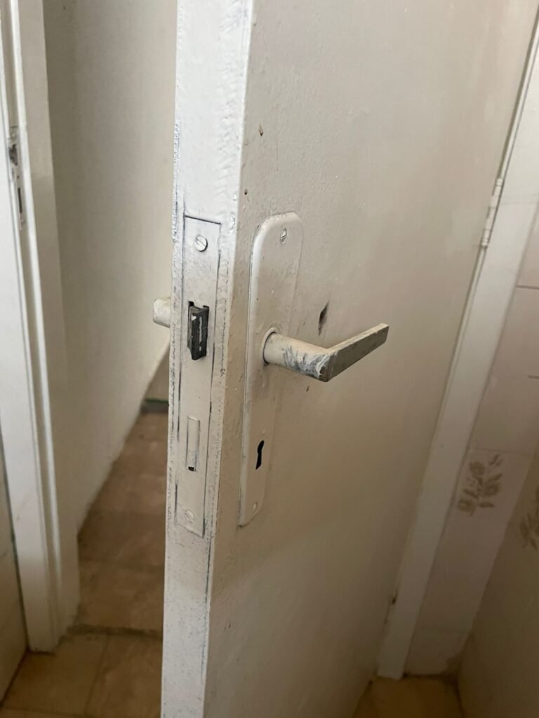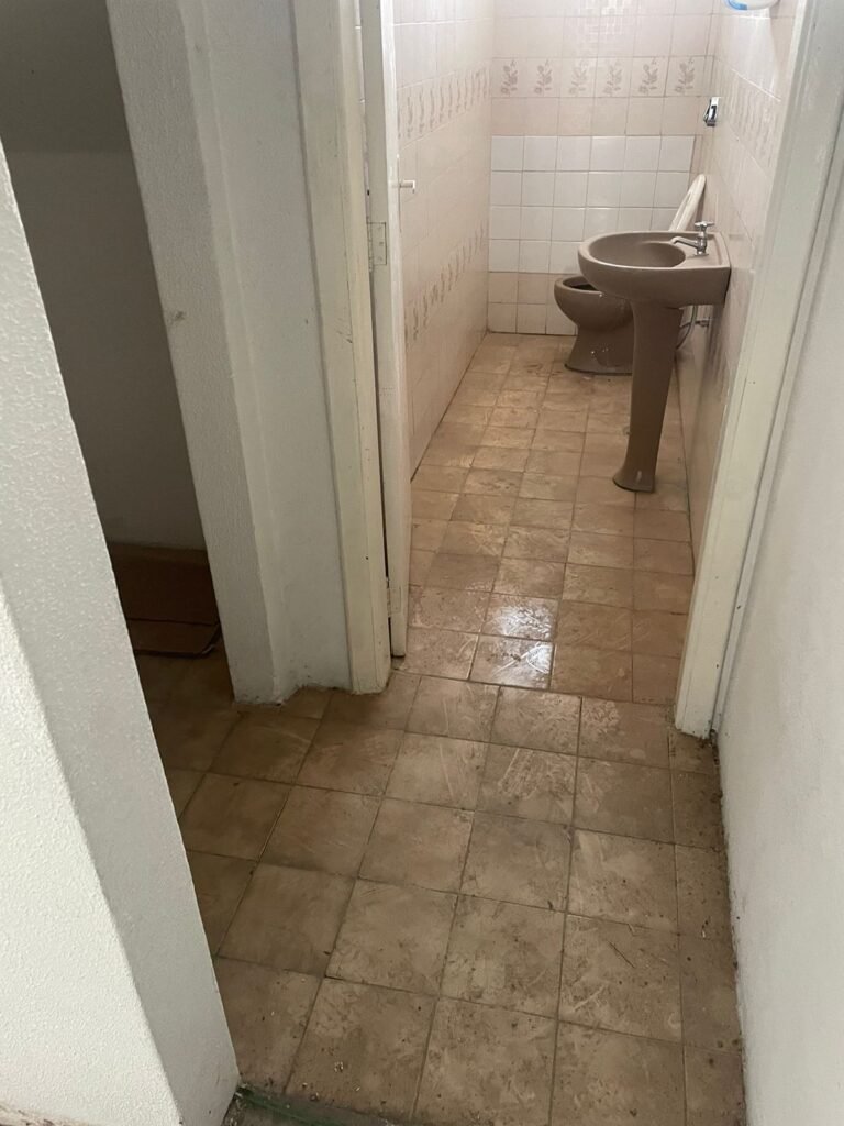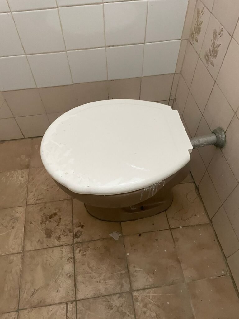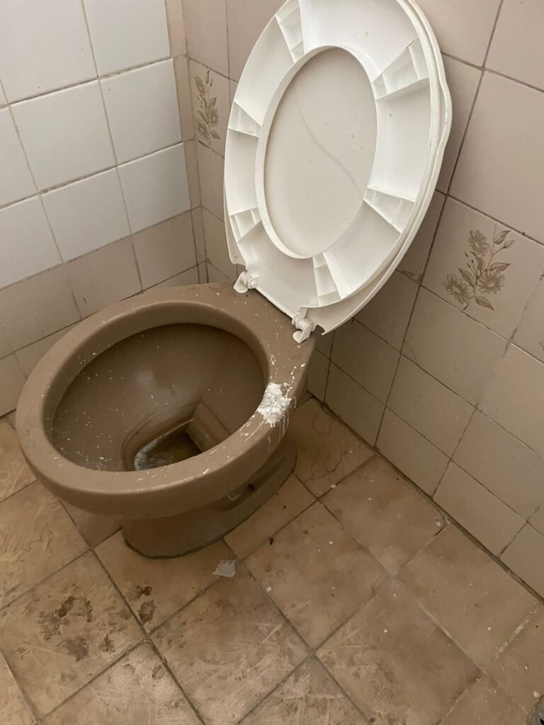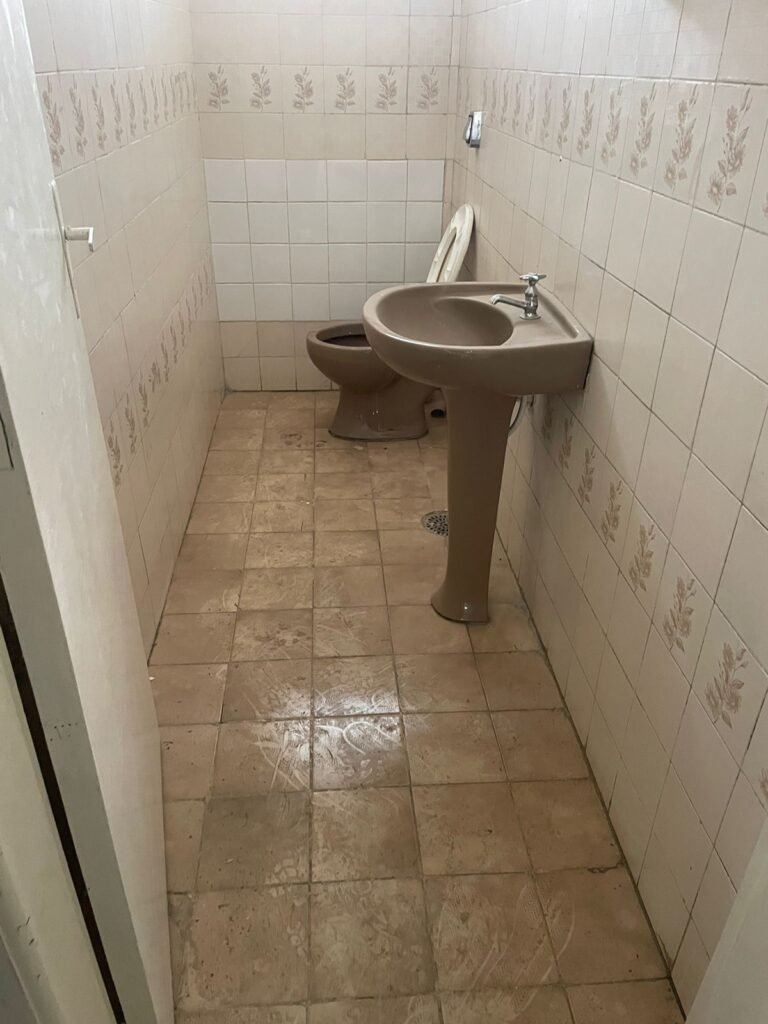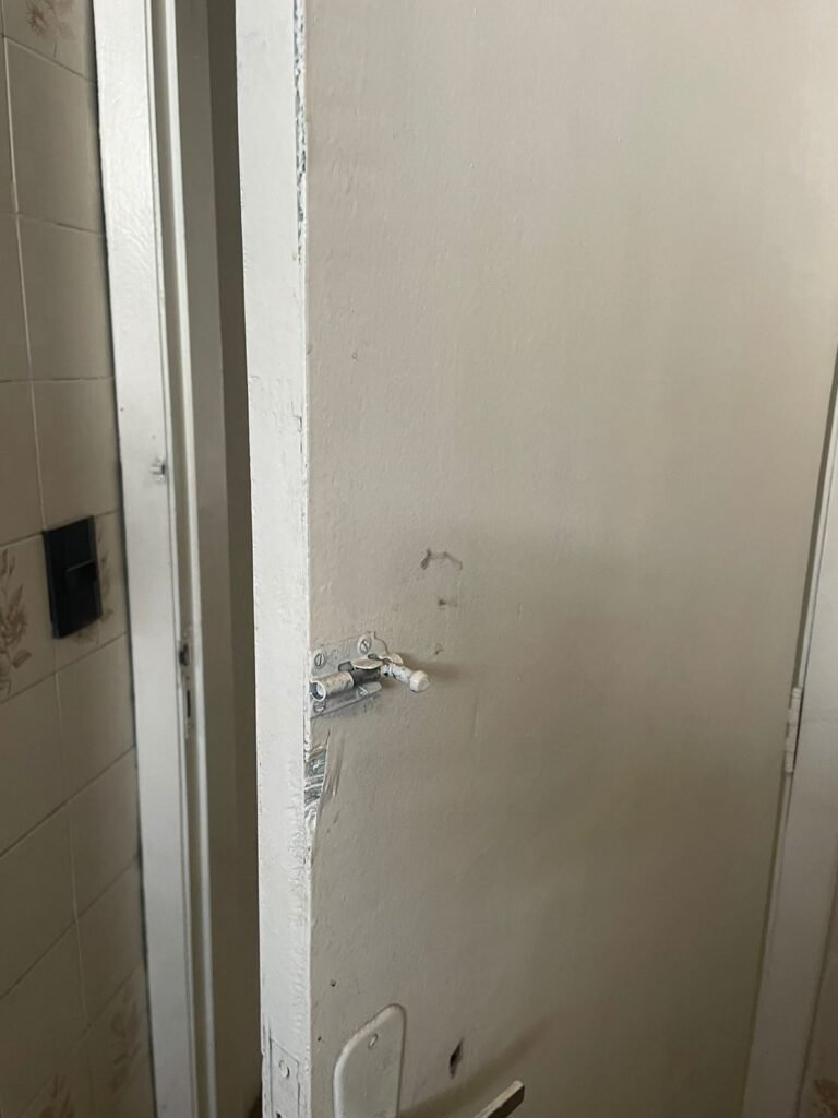 BANHEIRO 02-: 01 porta e batente de madeira com pintura na cor branca com desgaste natural, saindo lascas, maçaneta e fechadura com pintura na cor branca emperrando, 01 trinco em ordem, piso de cerâmica cor amarelo com desgaste natural, 01 ralo grelha de ferro, 03 paredes revestidas com pisos de cerâmica com desenhos em bege e desgaste natural, 01 parede revestida de pisos de cerâmica cor branco com desgaste natural, 01 pia com coluna de cerâmica cor marrom, com 01 torneira de inox sem água, 01 vaso sanitário de cerâmica cor marrom com acabamento solto, tampa em ordem, e descarga danificada, 02 canopla de registro de inox, fiação de instalação de chuveiro aparente, 01 vitrô basculante com pintura na cor branco, fechadura em ordem, e 06 vidros canelados com desgaste natural, 01 bocal de lâmpada sem acabamento e com 01 lâmpada Led, 01 interruptor com 01 tomada em ordem, 01 suporte de inox de toalha de rosto.