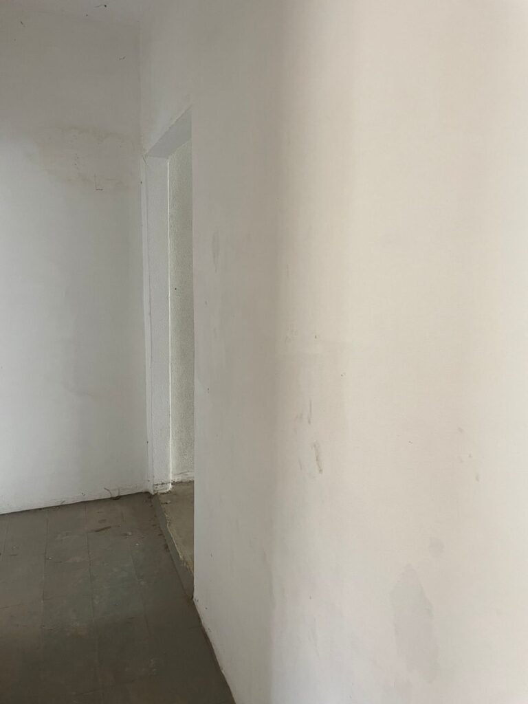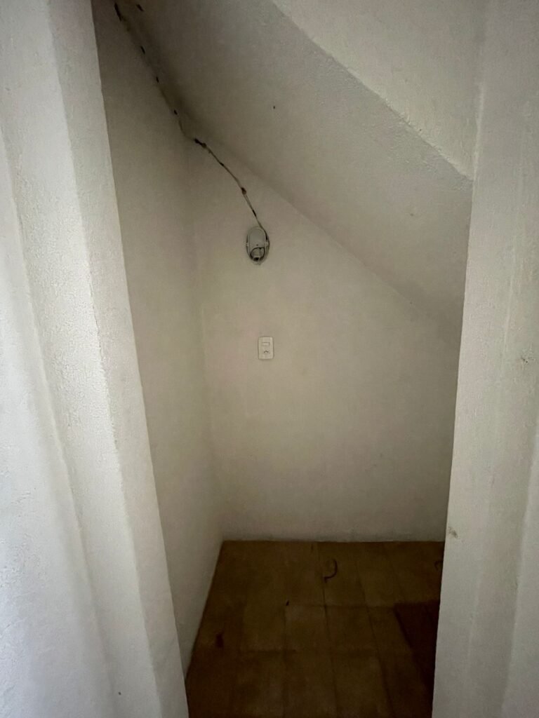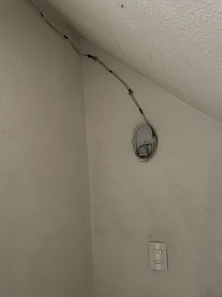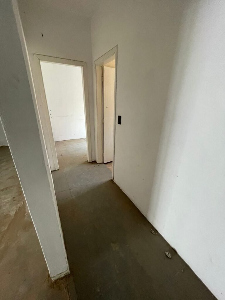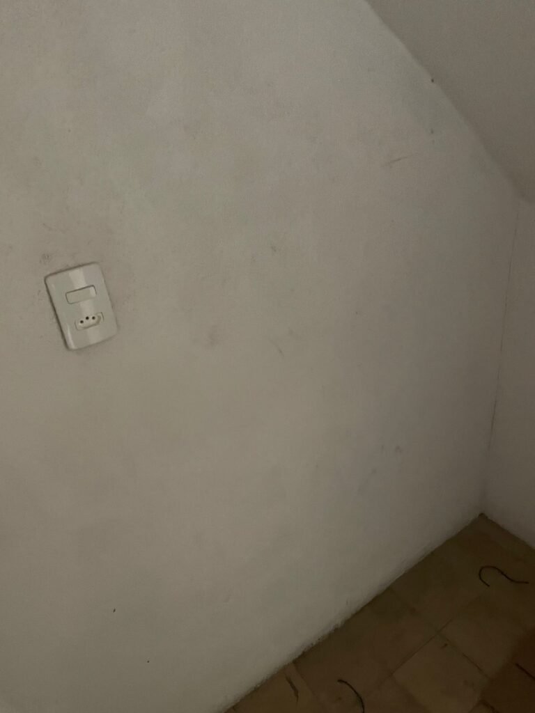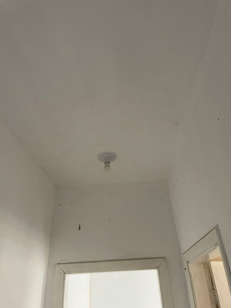CORREDOR-: Pisos de cerâmica com pintura na cor cinza, com desgaste natural e trincados, paredes e teto com pintura na cor branco neve com desgaste natural e manchas de infiltrações, 01 bocal de lâmpada com 01 lâmpada Led, 01 espelho de luz, 01 interruptor, 01 batente de madeira com pintura na cor branco com desgaste natural.