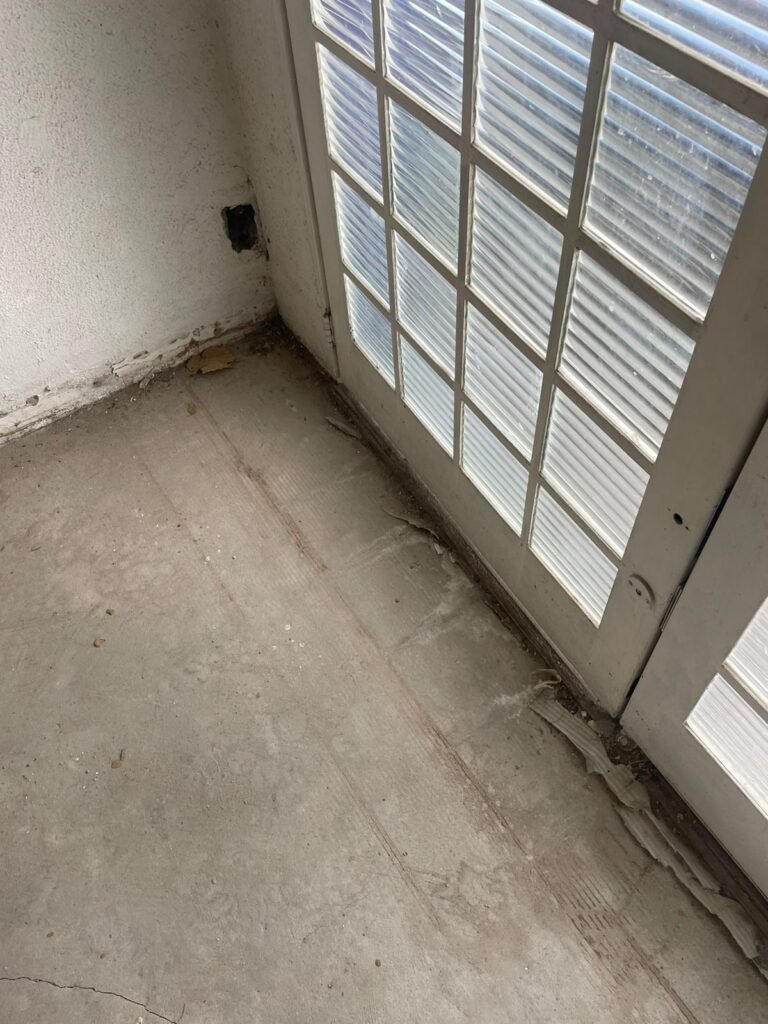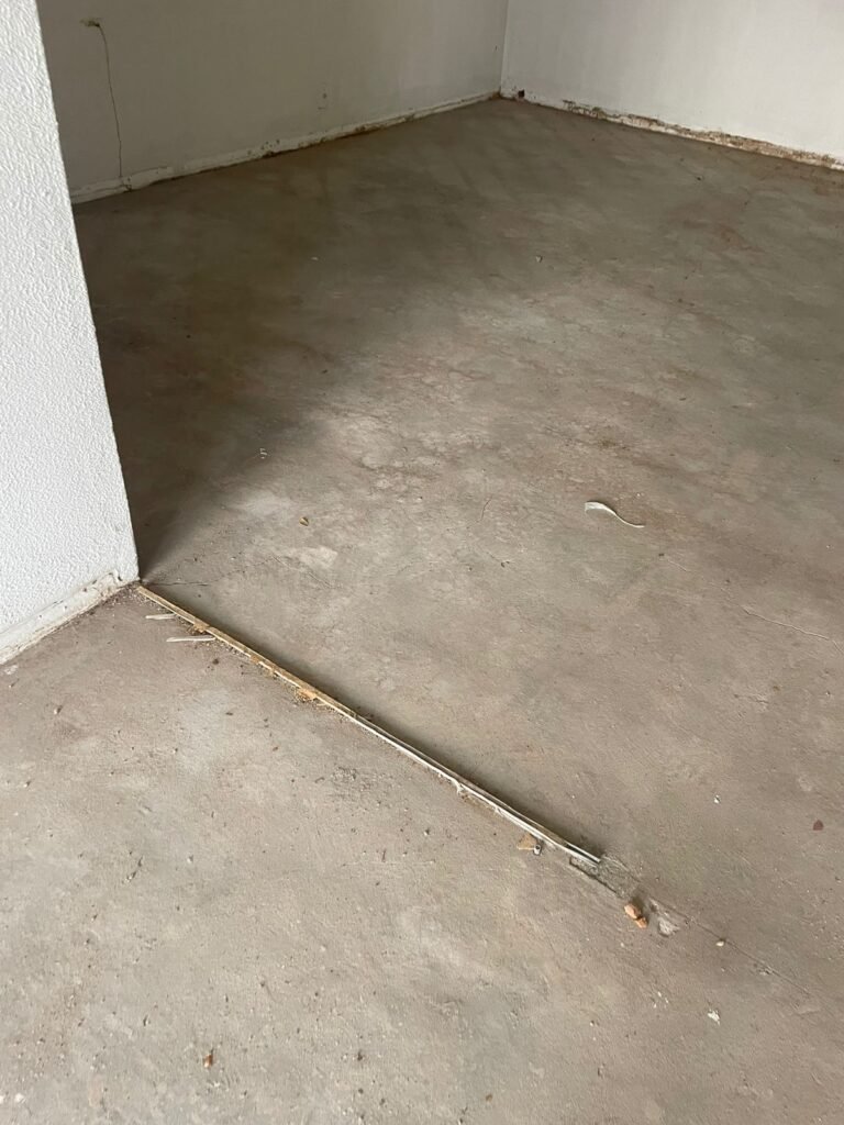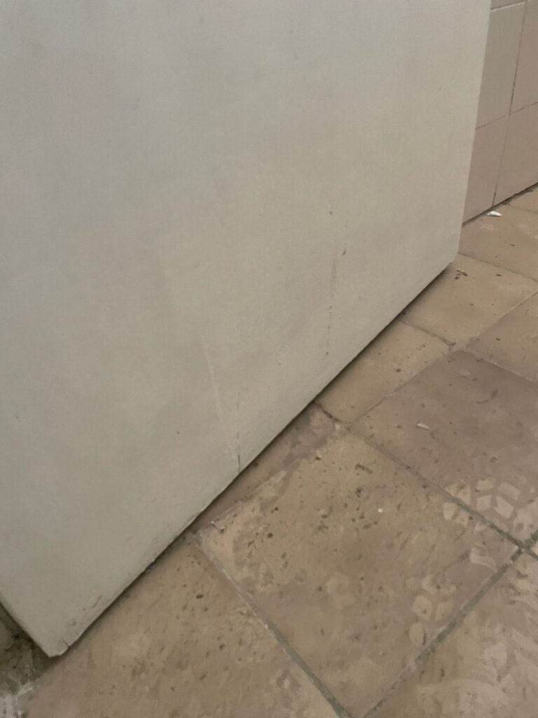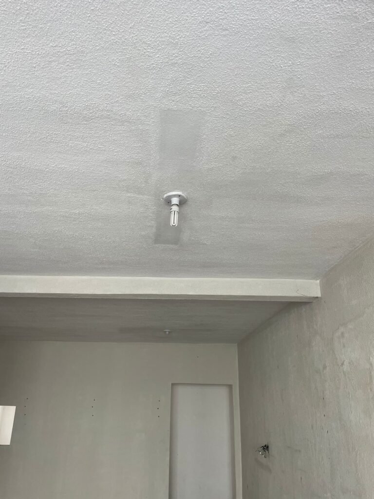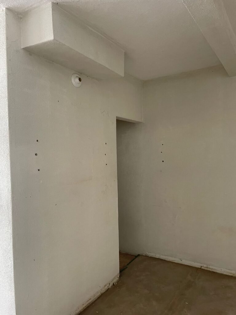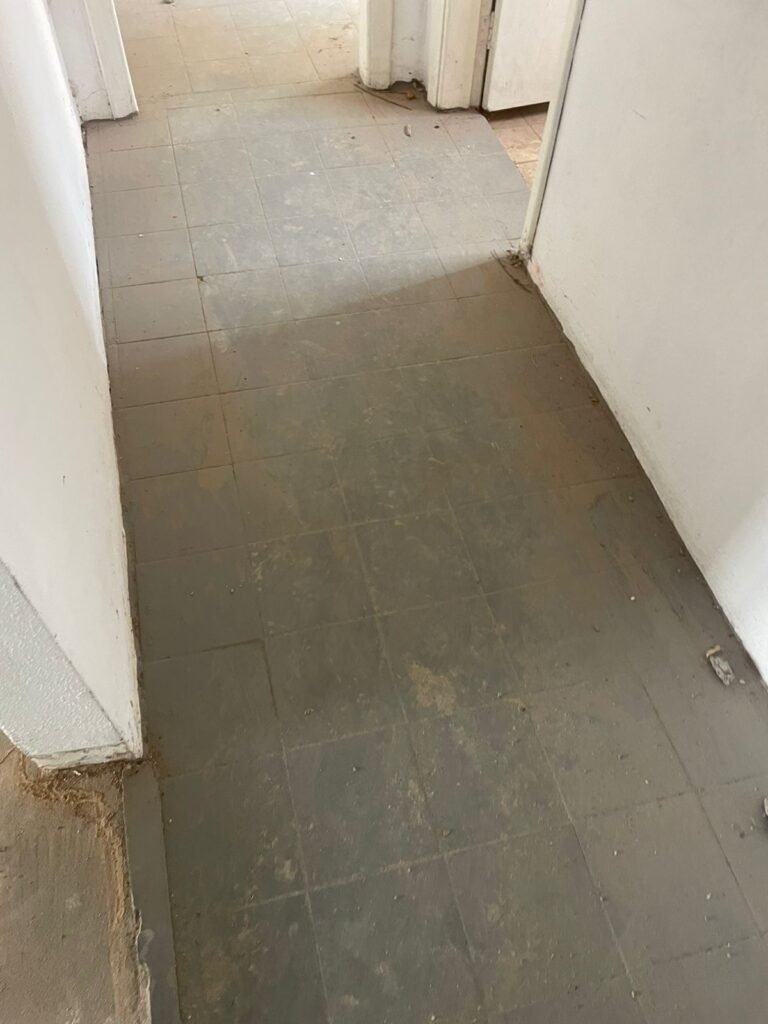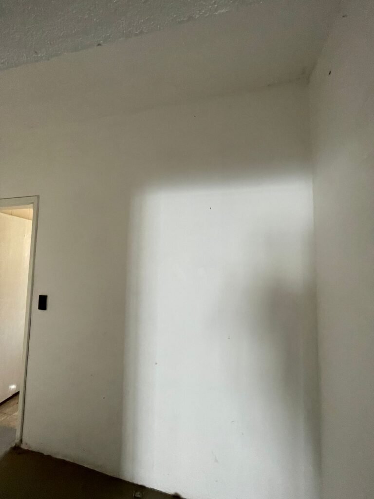 CORREDOR-: Pisos de cerâmica com pintura na cor cinza, com desgaste natural e trincados, paredes e teto com pintura na cor branco neve com desgaste natural e manchas de infiltrações, 01 bocal de lâmpada com 01 lâmpada Led, 01 espelho de luz, 01 interruptor, 01 batente de madeira com pintura na cor branco com desgaste natural.