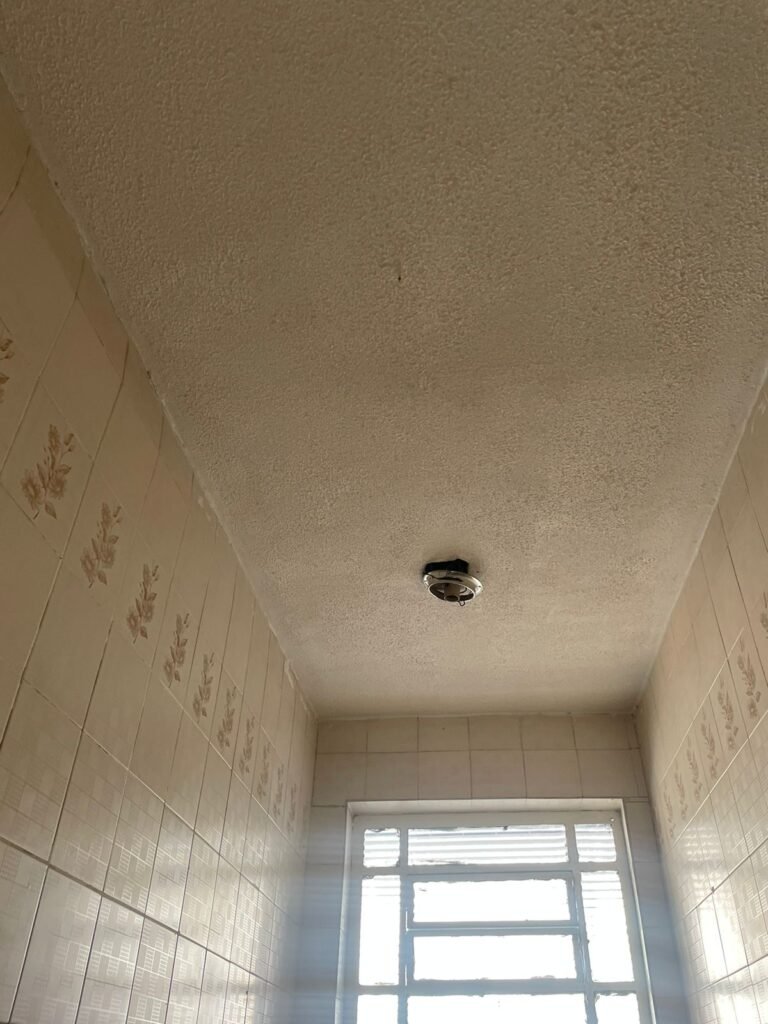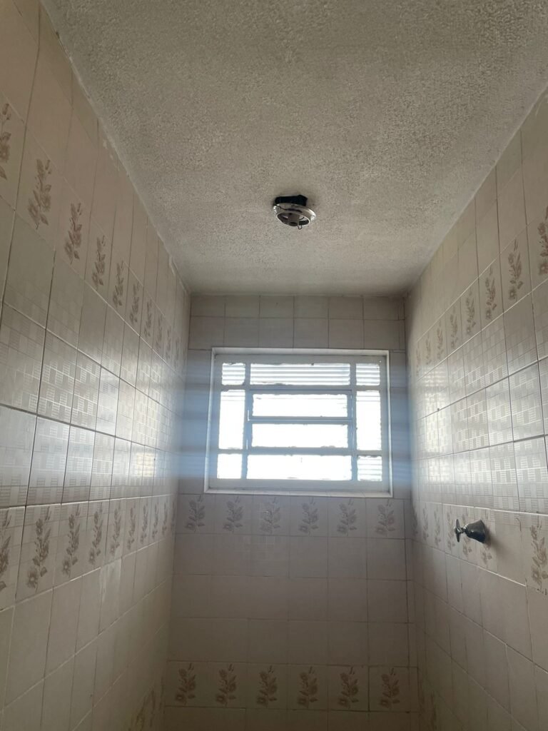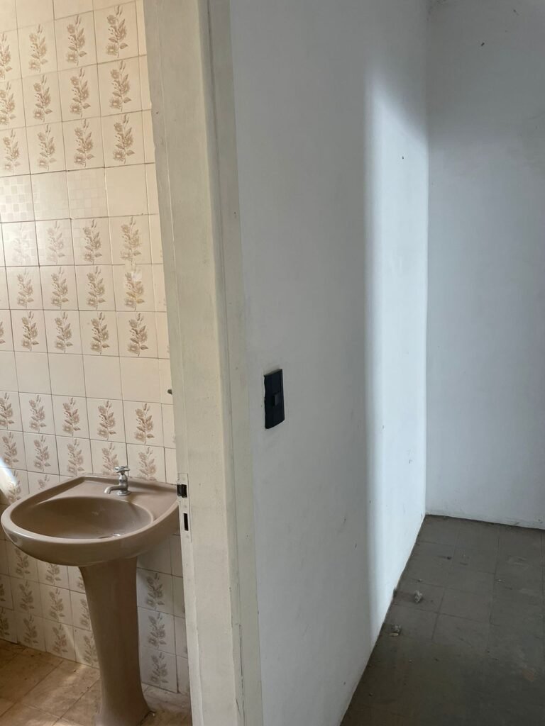 HALL BANHEIRO-: Piso de cerâmica na cor amarela com desgaste natural e trincados, paredes e teto em grafiato na cor branco neve, 01 luminária com fiação aparente, 01 interruptor com 01 tomada em ordem.