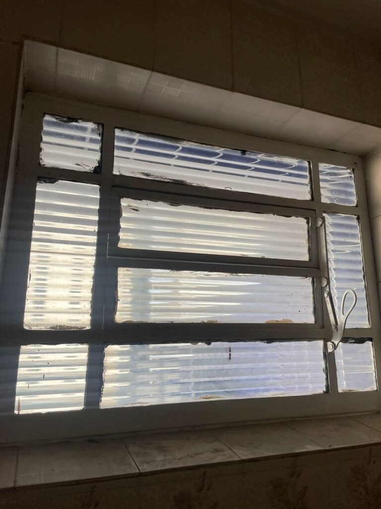 CÔMODO FUNDOS-: Piso de cerâmica com pintura na cor cinza, paredes e teto com pintura na cor branco neve com desgaste natural, 01 bocal de lampada, 01 porta de ferro com pintura na cor branco, com fechaduras danificadas, 13 vidros canelados sujos de tinta e com 01 deles trincado.