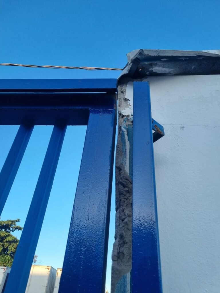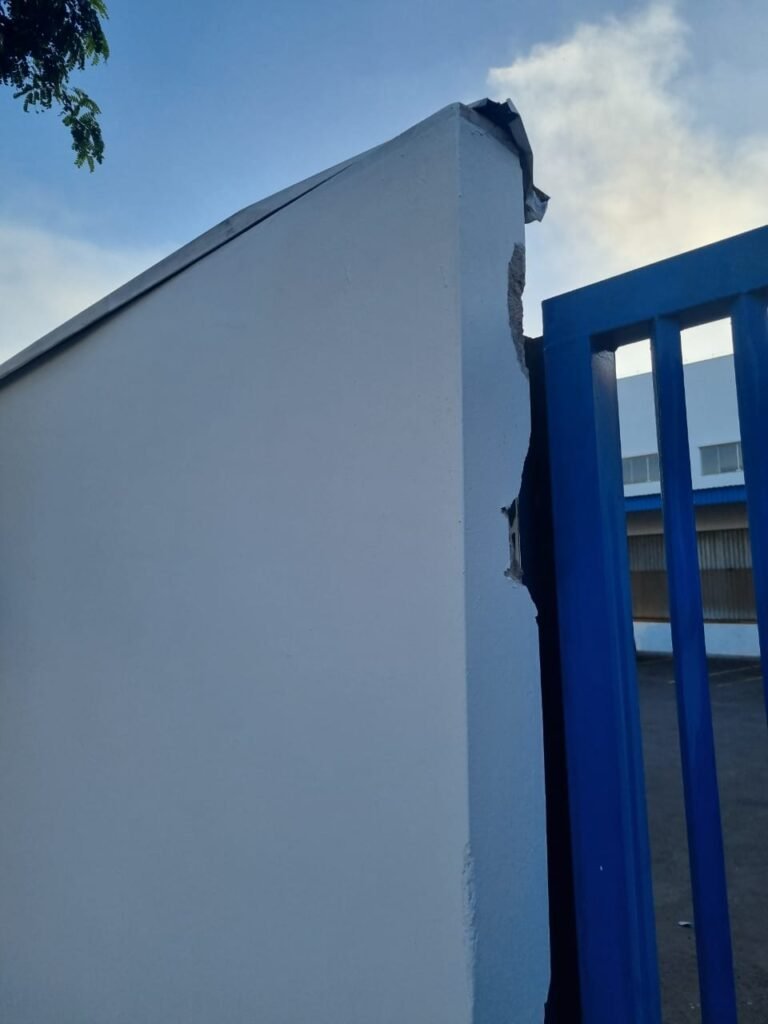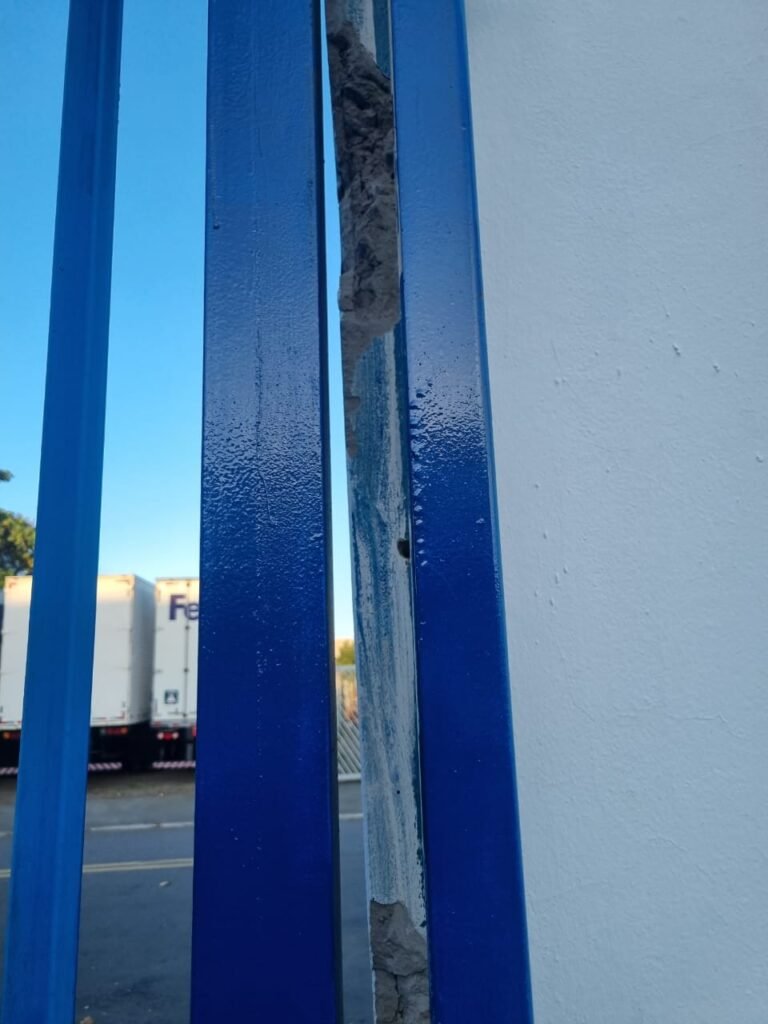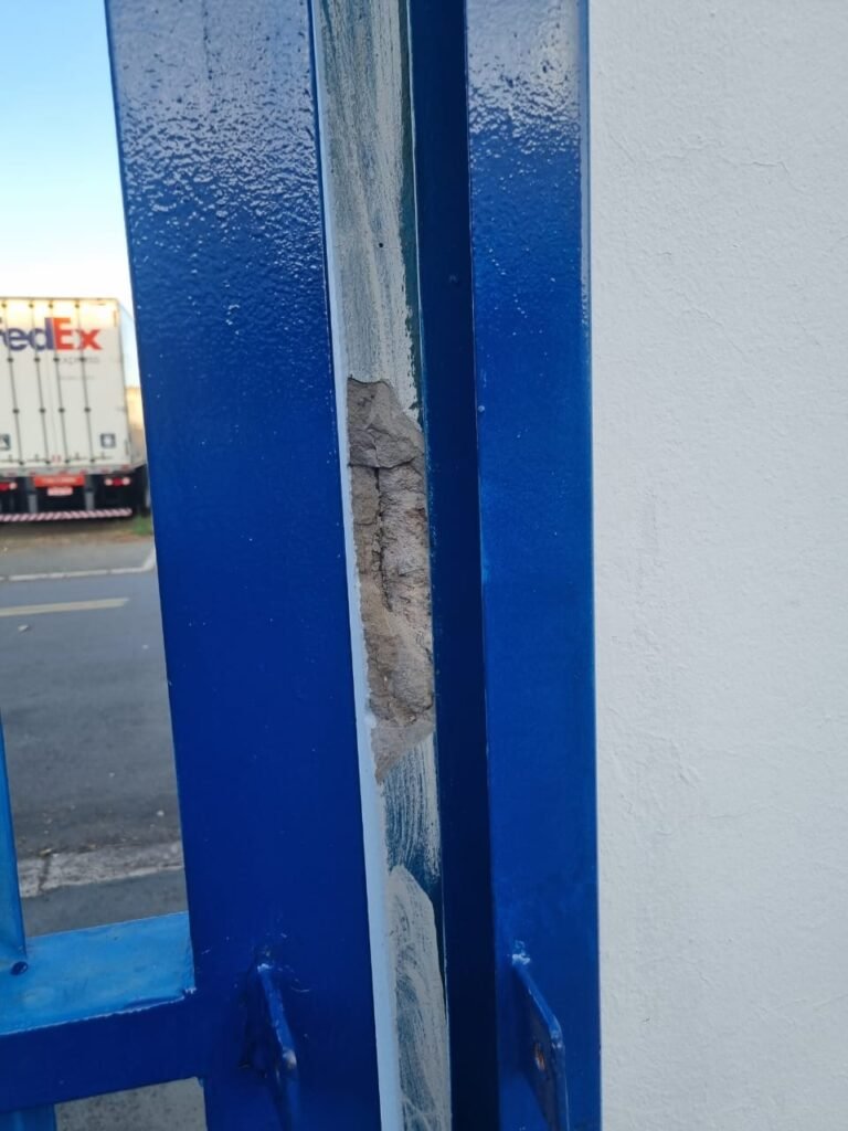 FACHADA:- Efetuar reparos nas quinas quebradas, efetuar reparos do rufo solto e danificado, muros com respingos de tinta azul, efetuar a pintura do portão, 01 cantoneira do portão deslizante solta, chumbar. 01 portão deslizante com roldanas travadas, muros com pintura sem com falhas e sem acabamento, paredes da fachada do galpão e administrativo pintura com falhas e sem acabamento, parede abaixo das docas pintura com falhas e sem acabamento.