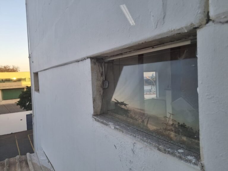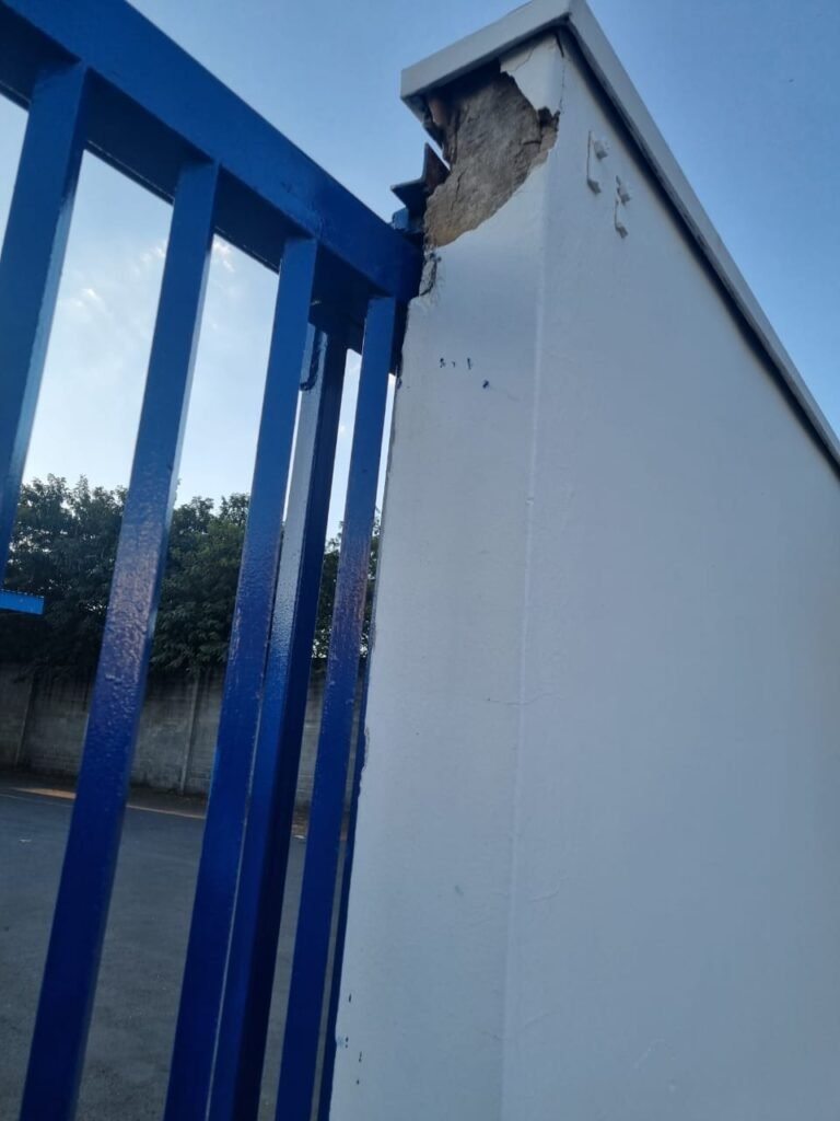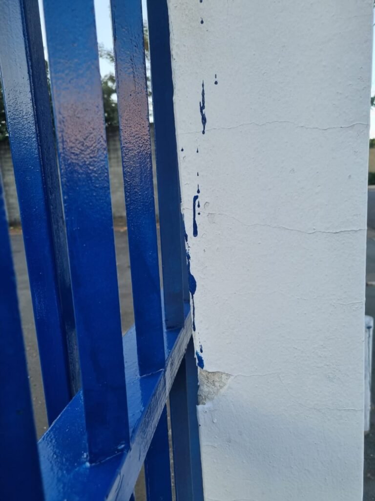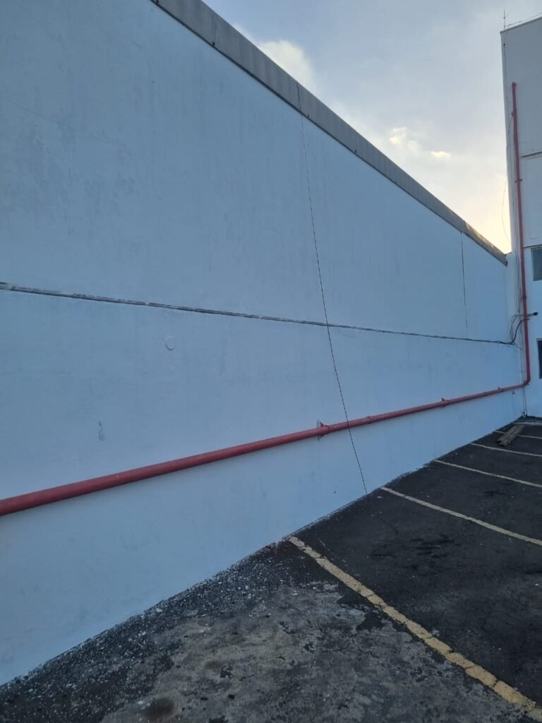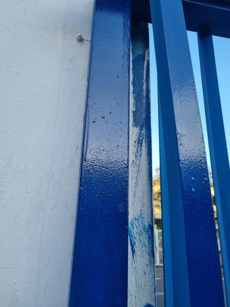 FACHADA:- Efetuar reparos nas quinas quebradas, efetuar reparos do rufo solto e danificado, muros com respingos de tinta azul, efetuar a pintura do portão, 01 cantoneira do portão deslizante solta, chumbar. 01 portão deslizante com roldanas travadas, muros com pintura sem com falhas e sem acabamento, paredes da fachada do galpão e administrativo pintura com falhas e sem acabamento, parede abaixo das docas pintura com falhas e sem acabamento.