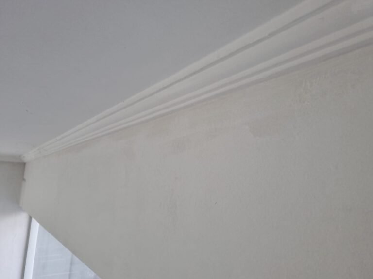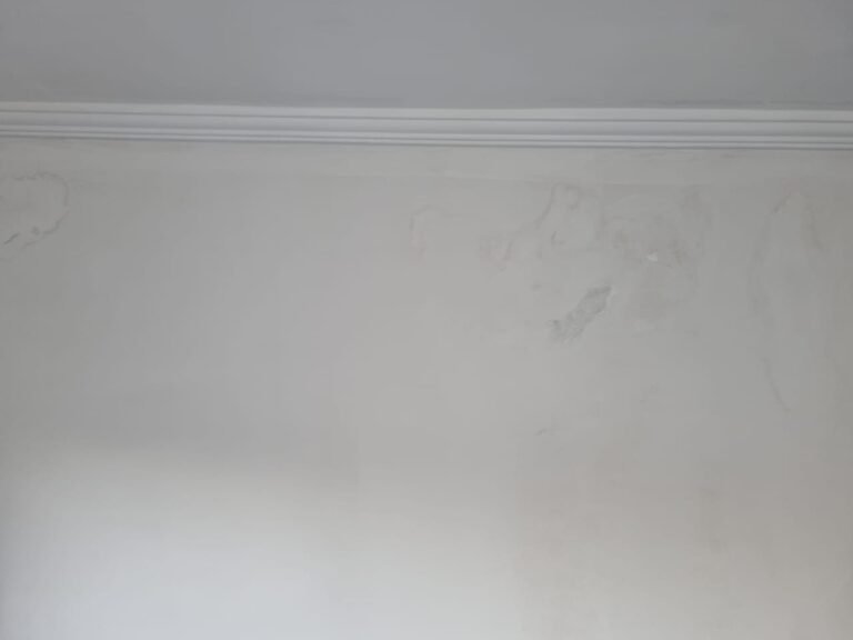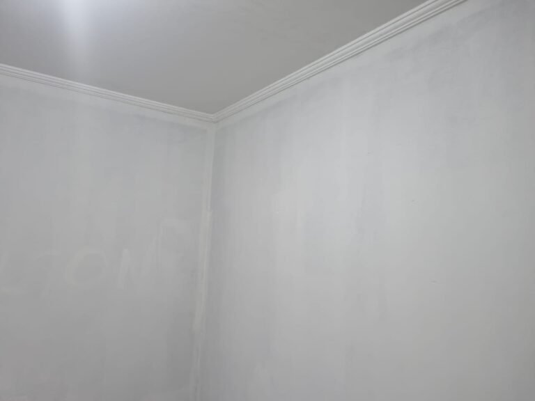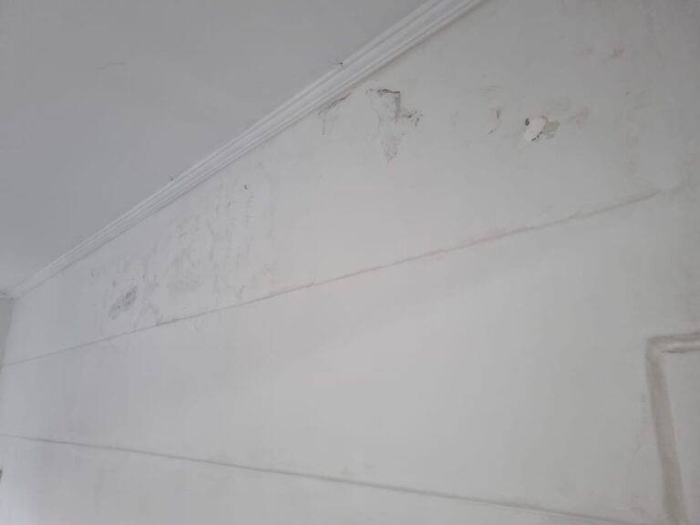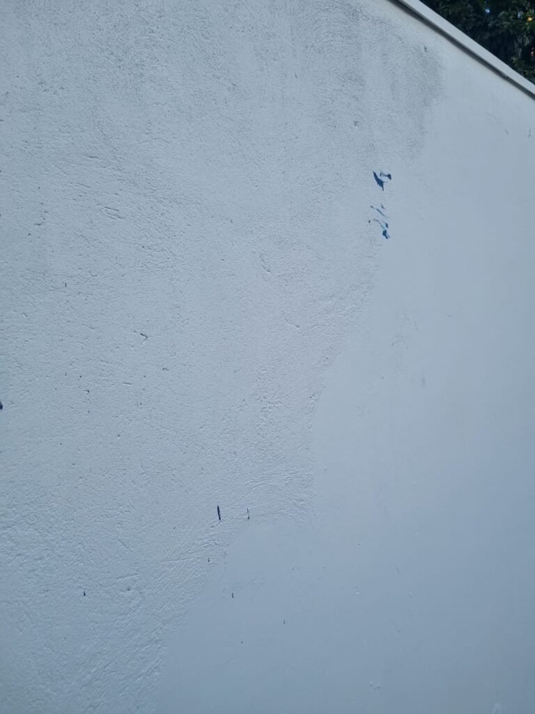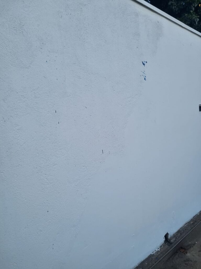 Paredes externas com pintura sendo barrado na cor azul com tinta PVA ( correto tinta esmalte), restante da parede com pintura na cor branco neve.