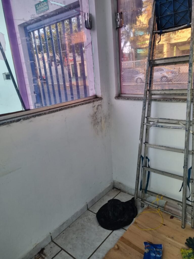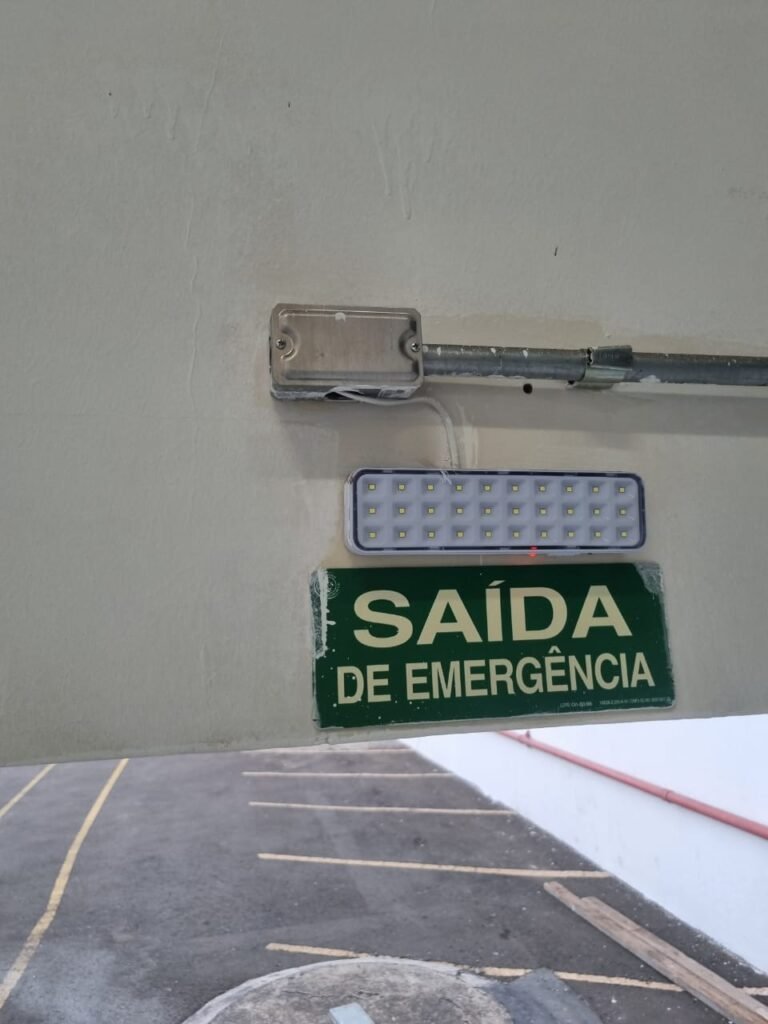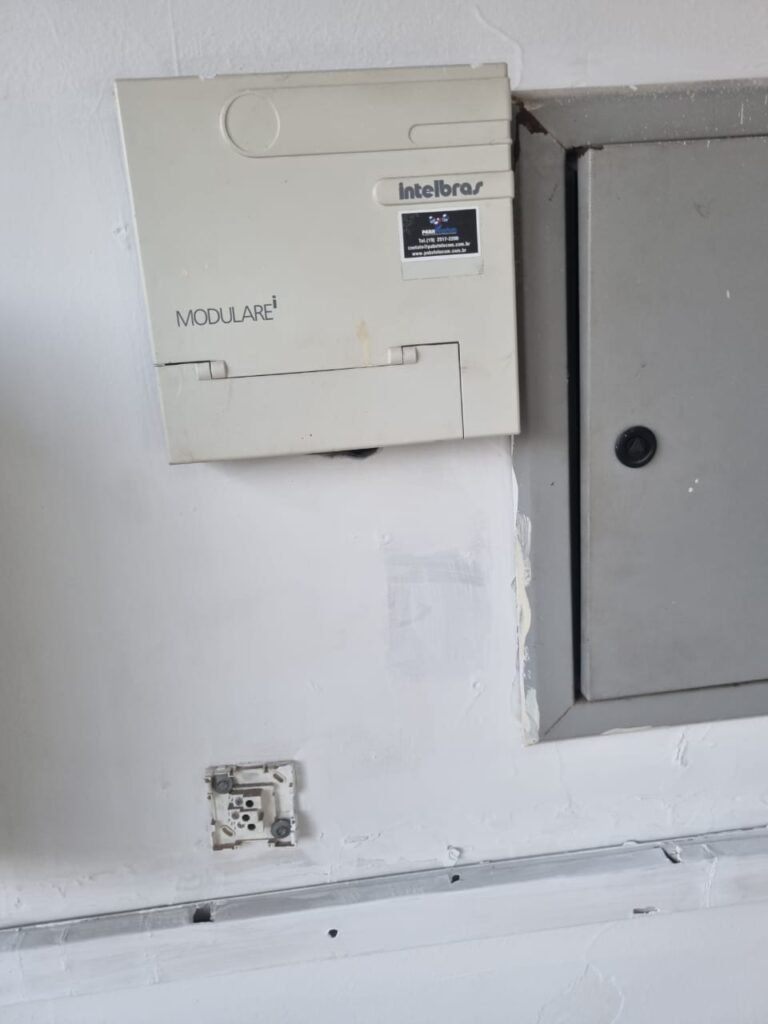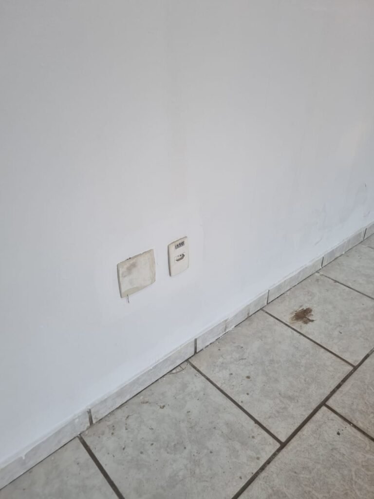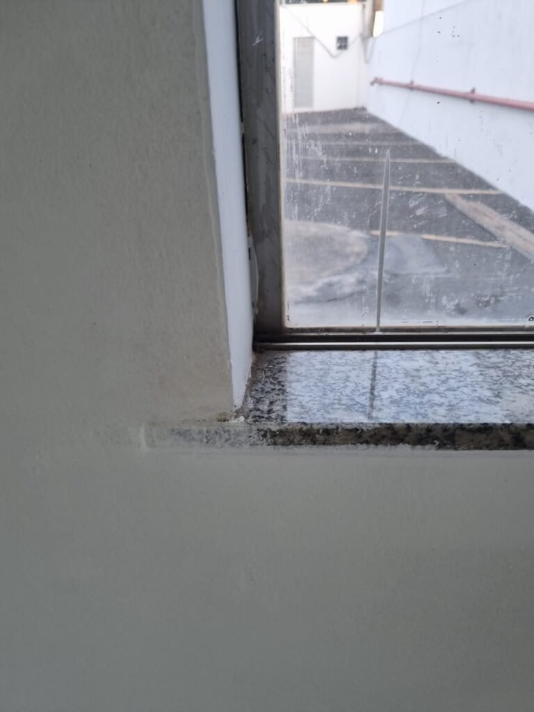 RECEPÇÃO:- Faltando 03 espelhos de luz, paredes com pintura na cor branco neve sem acabamento, refazer pintura original marfim, guarnições dos vitrôs e caixa de disjuntores sujas de tinta, efetuar a limpeza dos locais sujos de tinta.