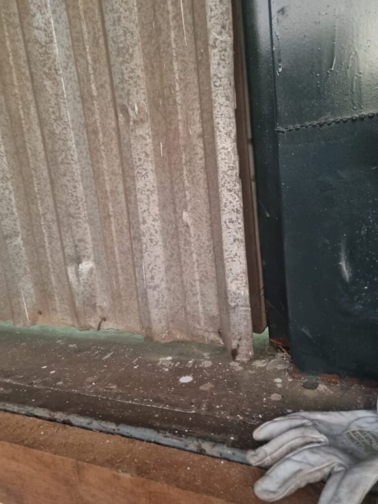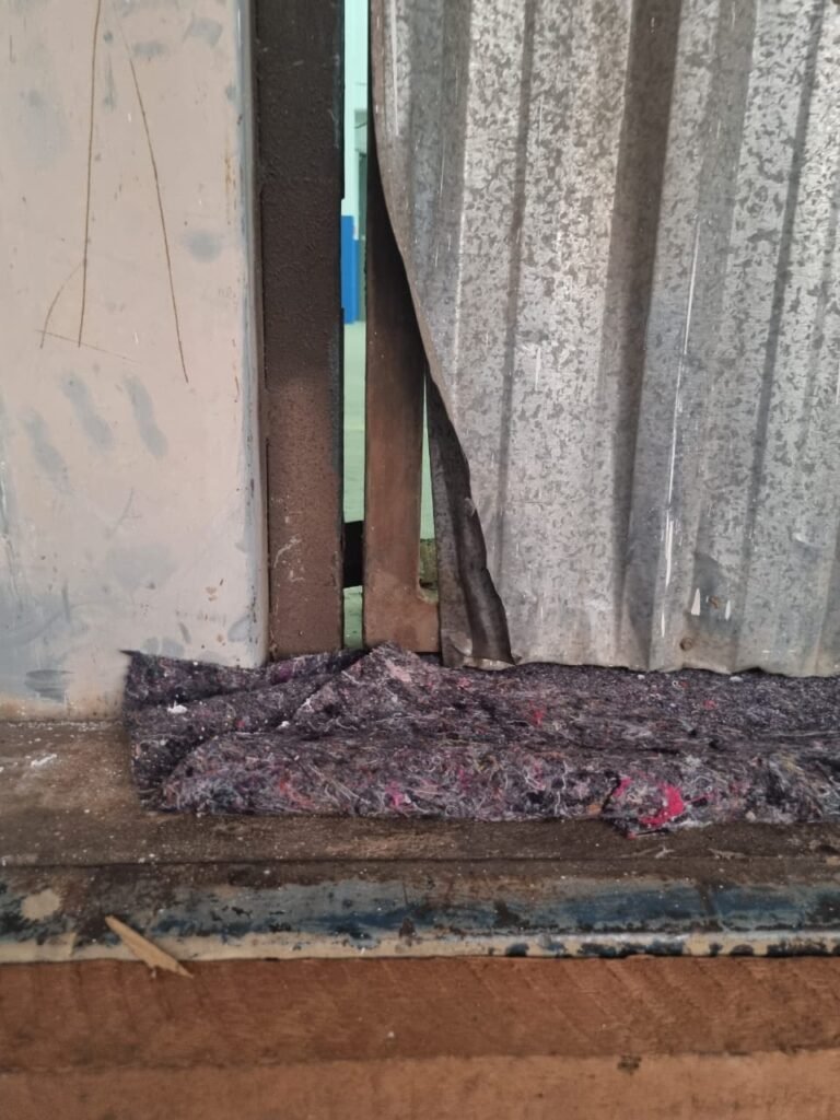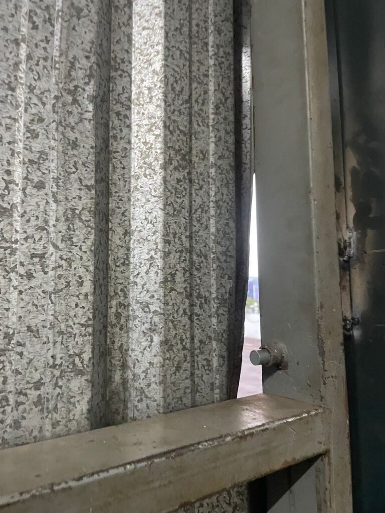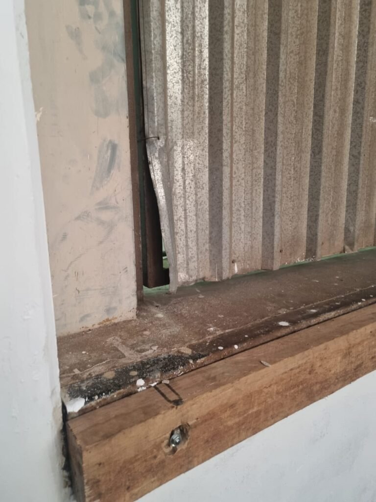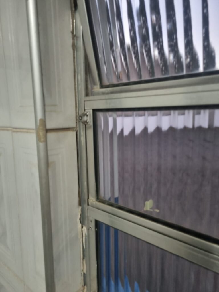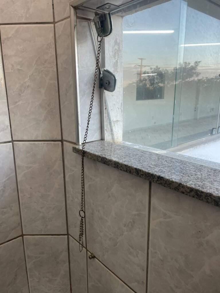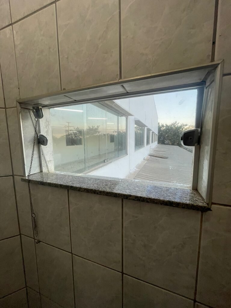 VESTIÁRIO 01:- 2º cômodo : paredes com pintura na cor branco neve sem acabamento e com falhas ( cor original correta é concreto), teto não foi pintado, 01 vitrô com puxador danificado.