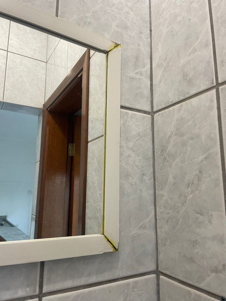 COPA:- Vitrô está com o puxador danificado, teto com pintura na cor branco neve sem acabamento, azulejos com respingos de tinta, torneira não está fechando totalmente.