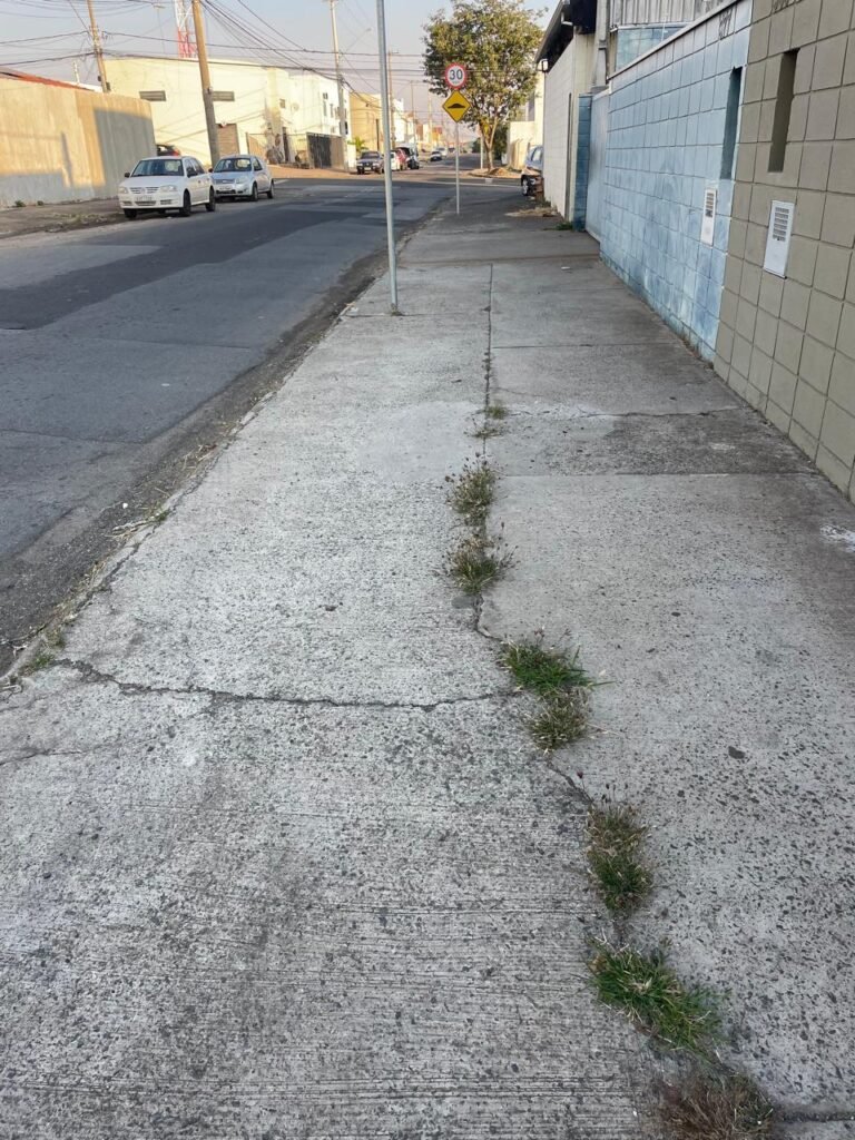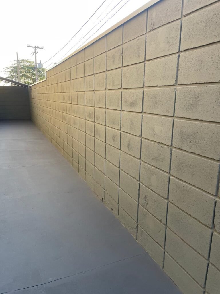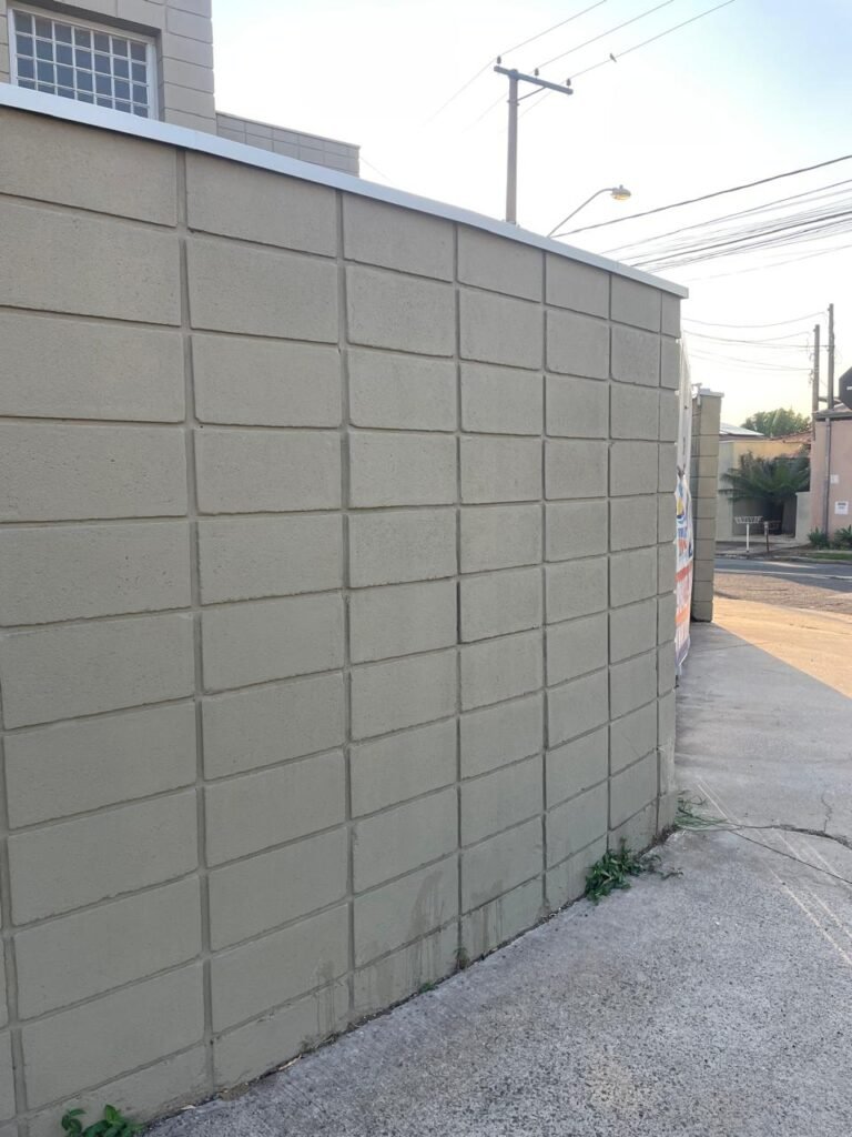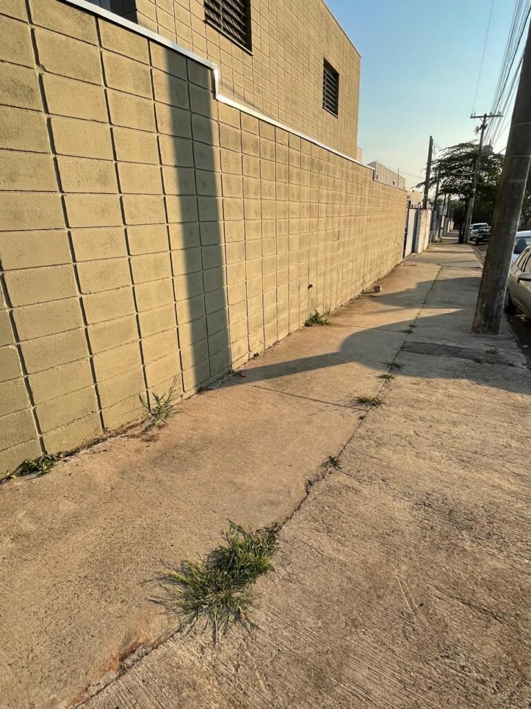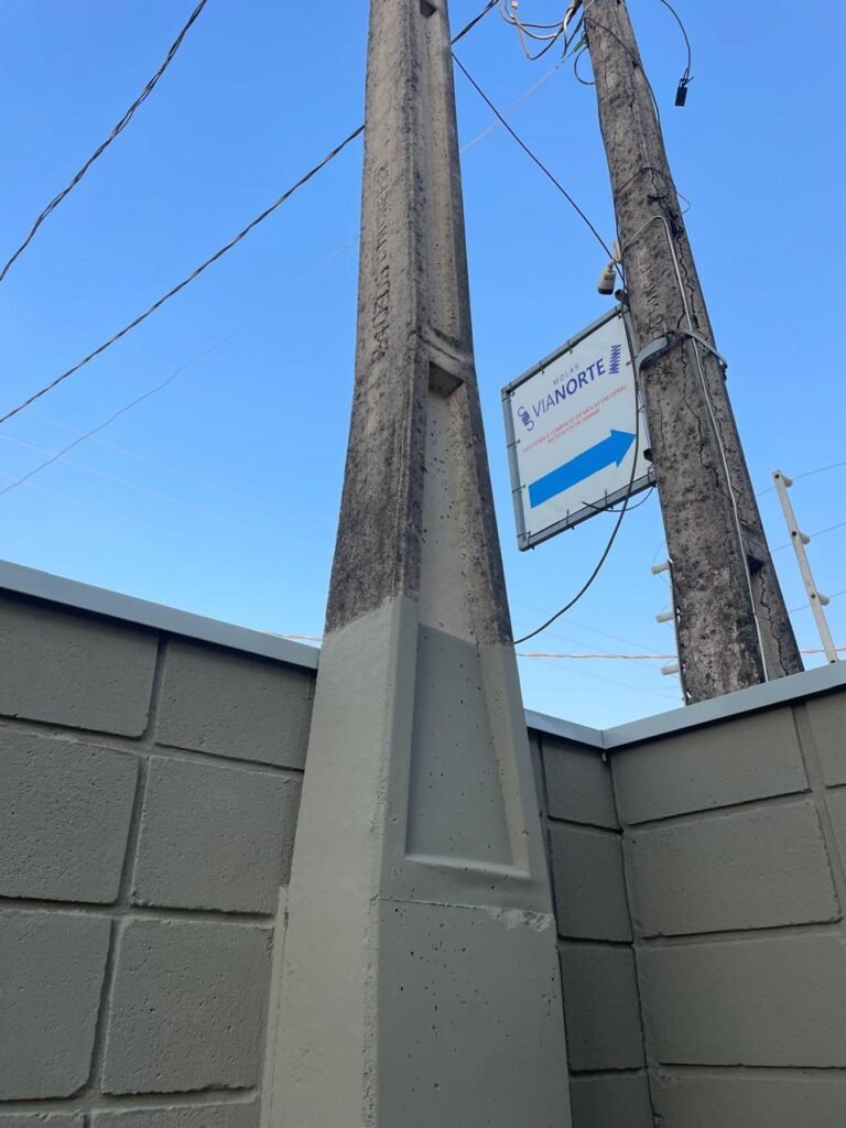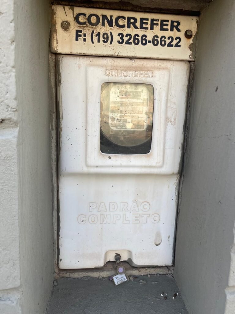 FACHADA-: Calçada de concreto desempenado com desgastes naturais, mato para aparar, rachaduras pela extensão e restante em ordem, muro em blocos de concreto aparentes com pintura nova na cor concreto em ordem, rufos com pintura na cor cinza nova e em ordem, 01 cavalete padrão Sanasa em ordem, com tampa em ordem, com lacre e com o hidrômetro em ordem, 01 poste padrão Concrefer com desgastes naturais, com tampa de proteção, vidro e lacre em ordem, 01 medidor elétrico padrão Elster em ordem.