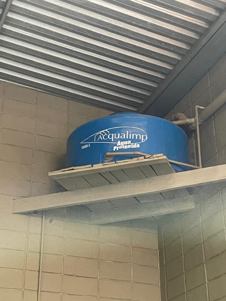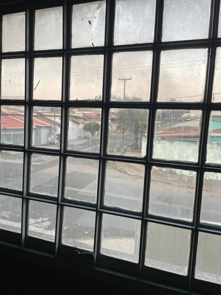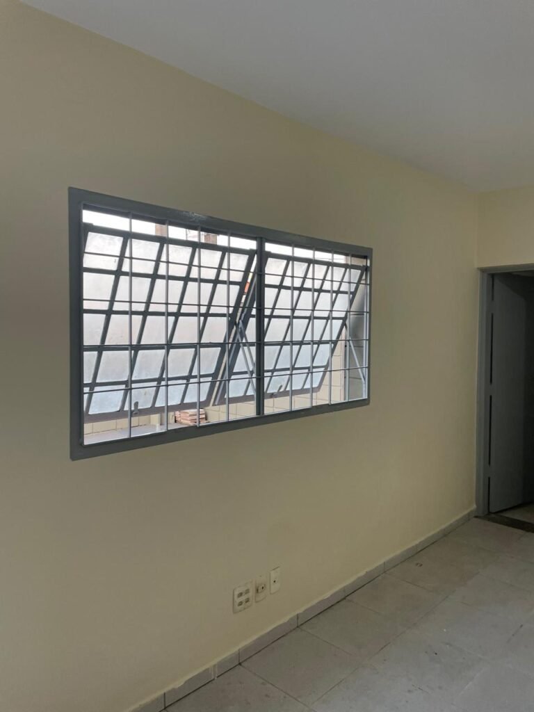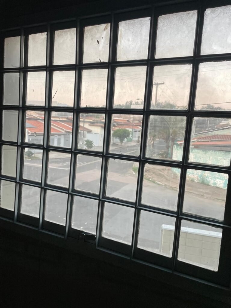MEZANINO-: Piso de concreto desempenado em ordem, 06 carcaças de conduletes, estrutura de madeira em ordem para caixa d’água, 01 caixa d’água marca Acqualimp 500l em ordem, canos da caixa d’água com canopla de registro em ordem, 03 vitrôs basculantes com esquadrias de ferro com pintura nova na cor cinza em ordem, 01 deles com 02 fechaduras e 02 com apenas 01 fechadura, todos com grades de ferro de proteção em ordem, 01 deles com 35 vidros lisos em ordem, 01 com 50 vidros lisos em ordem e 01 com 15 vidros lisos em ordem.