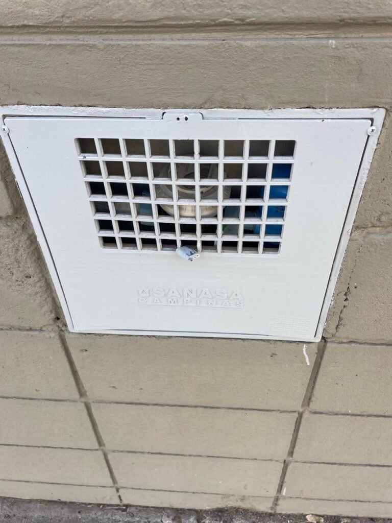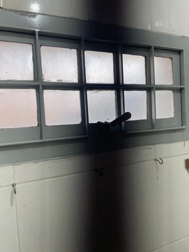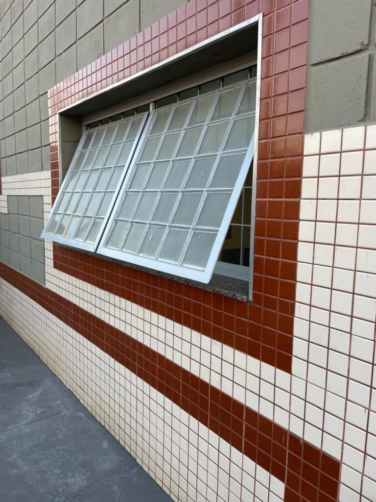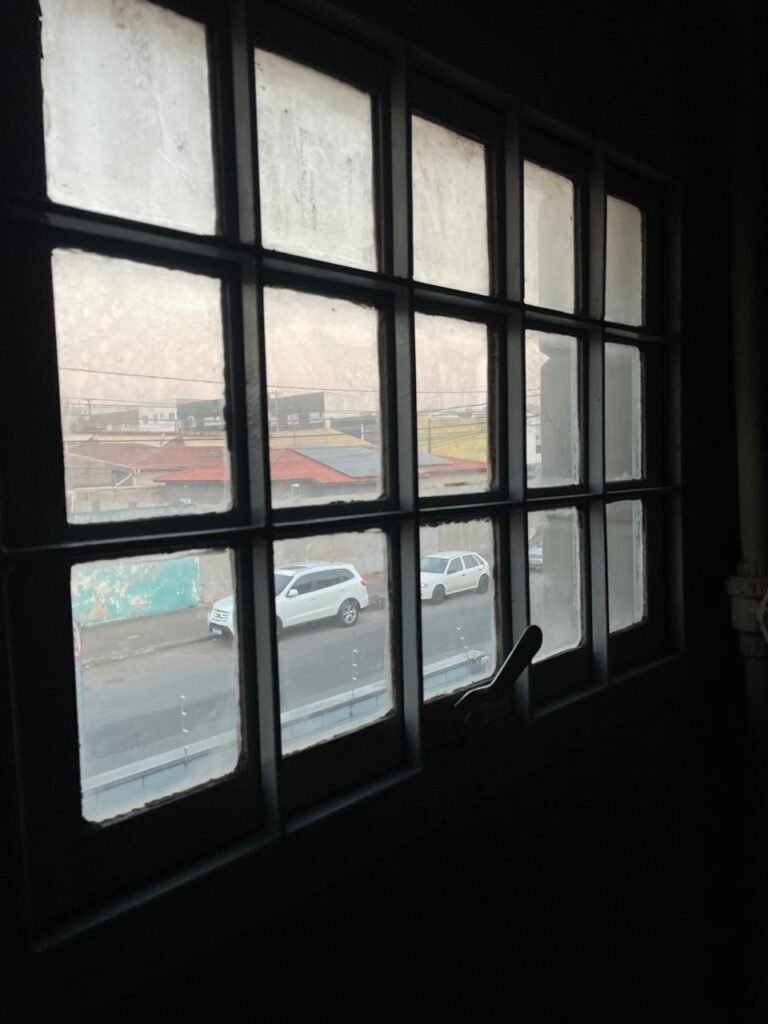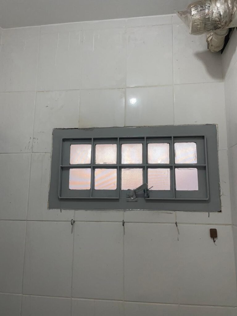 MEZANINO-: Piso de concreto desempenado em ordem, 06 carcaças de conduletes, estrutura de madeira em ordem para caixa d’água, 01 caixa d’água marca Acqualimp 500l em ordem, canos da caixa d’água com canopla de registro em ordem, 03 vitrôs basculantes com esquadrias de ferro com pintura nova na cor cinza em ordem, 01 deles com 02 fechaduras e 02 com apenas 01 fechadura, todos com grades de ferro de proteção em ordem, 01 deles com 35 vidros lisos em ordem, 01 com 50 vidros lisos em ordem e 01 com 15 vidros lisos em ordem.