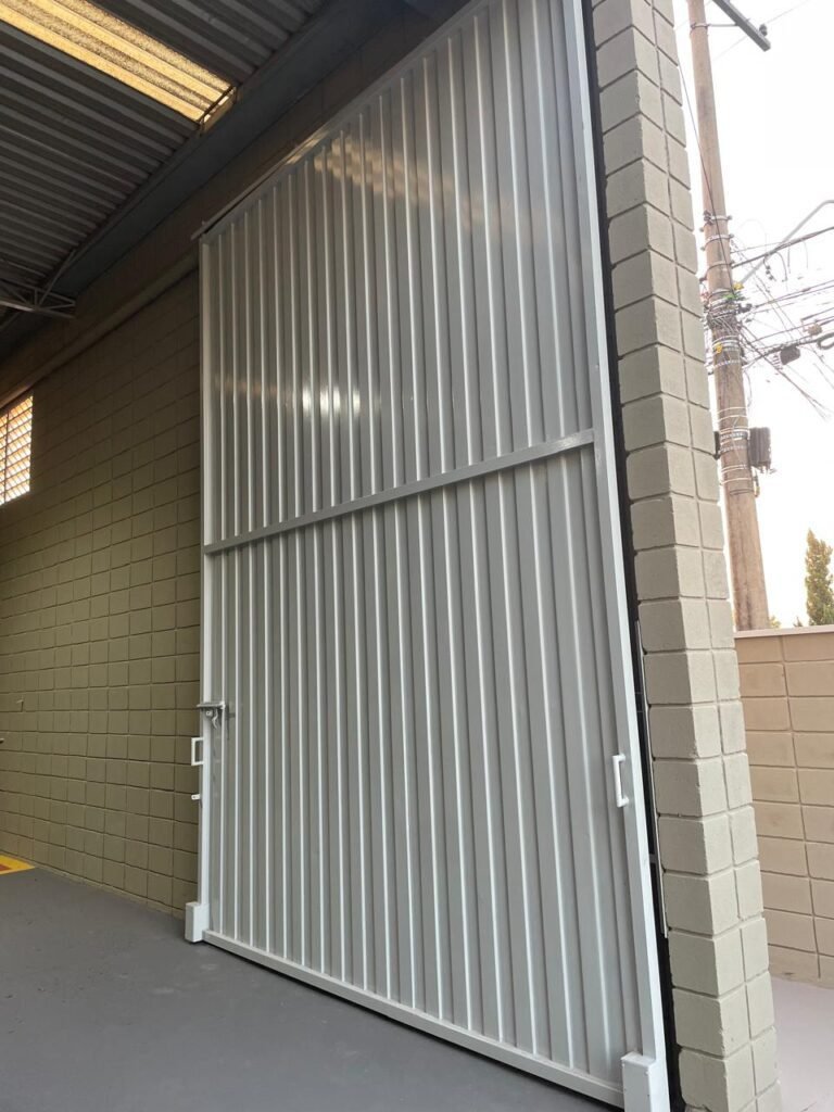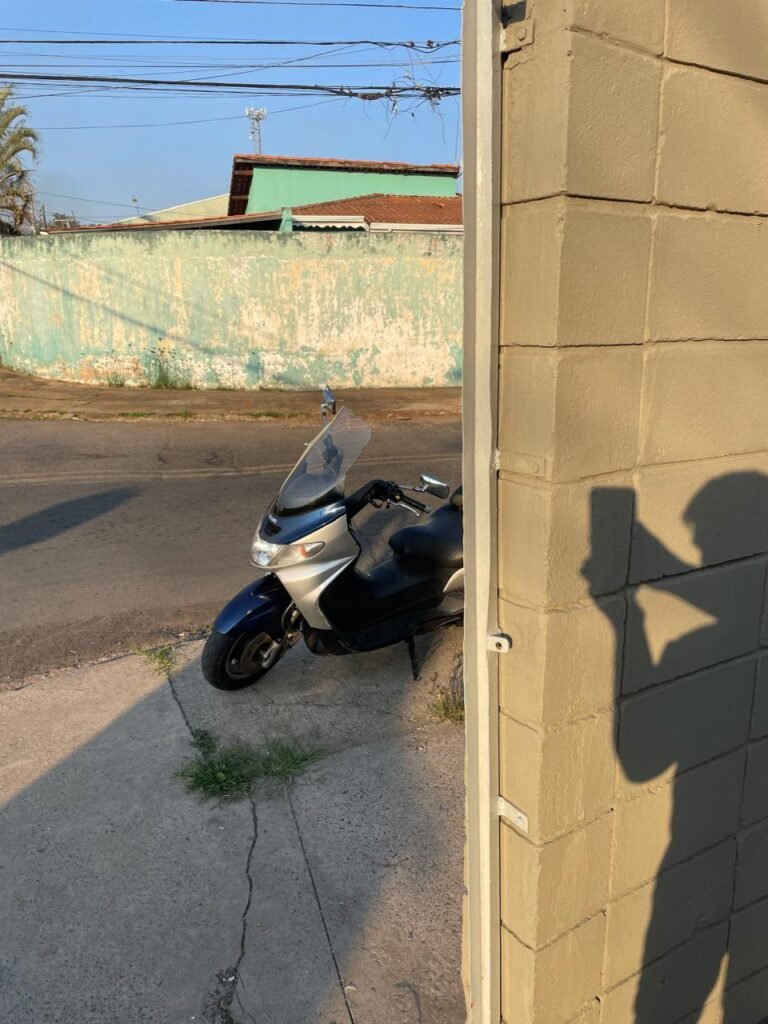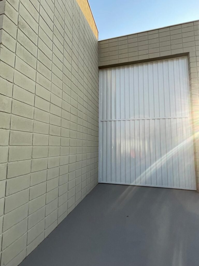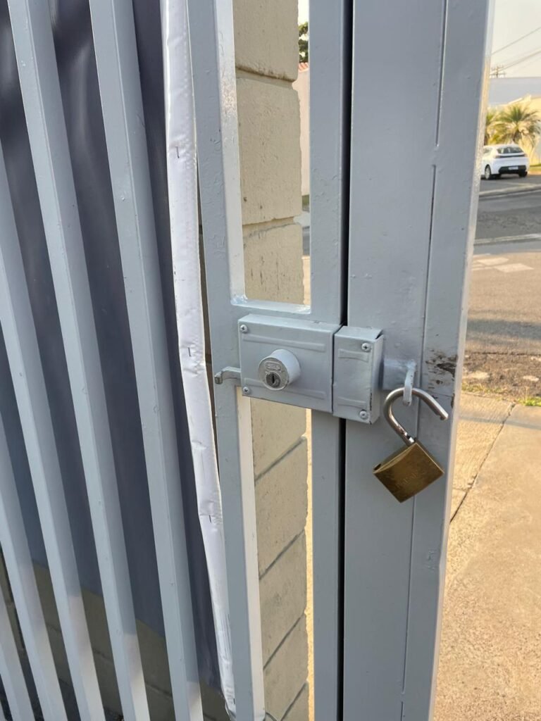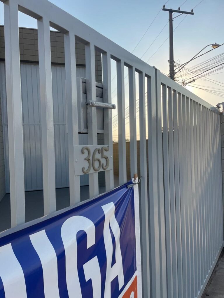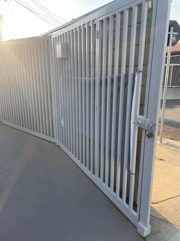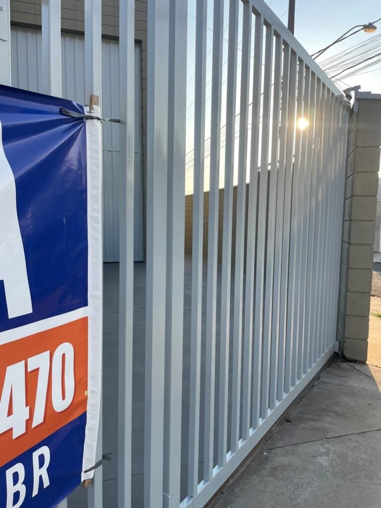 GARAGEM-: 01 Portão articulado deslizante em ordem, em gradil de ferro com pintura nova na cor cinza em ordem, trilhos com pequenos amassados porém em ordem, 01 portão social embutida com 01 fechadura start marca Stam com chave em ordem, 01 Caixa de correspondência com tampa em ordem, 01 trinco para cadeado com 01 cadeado marca Papaiz Cr-50 em ordem e com chave, piso de concreto com pintura nova na cor cinza em ordem, com rachaduras pela extensão, manchas na cor branca e restante em ordem, 01 canopla de registro em inox, 01 torneira de Jardim em ordem, 01 disjuntor geral marca Elgin 125A 3P em ordem, 02 tampas de inspeção de ferro em ordem, parte da parede revestida em azulejos na cor branco com desgastes naturais, 01 tanque de cerâmica cor branco com manchas de tinta e desgastes naturais, 01 torneira de jardim não testada, 01 cobertura com estrutura de ferro em ordem e com telha galvanizada com pequenas amassados, desgastes naturais e restante em ordem, paredes do barracão em blocos de concreto com pintura nova na cor concreto em ordem, parte revestida em pastilhas de cerâmica nas cores branca e na cor vermelha, com desgastes naturais, manchas de tinta e partes faltando, 01 refletor não testado.