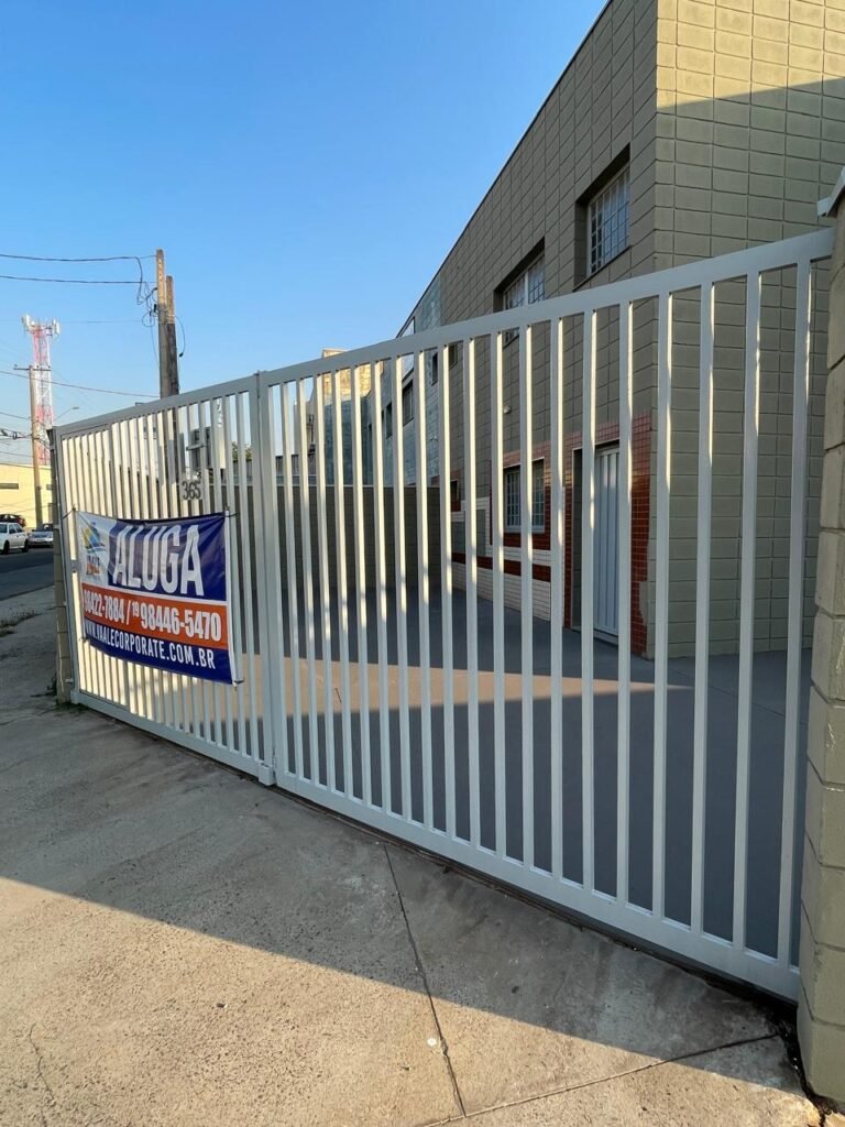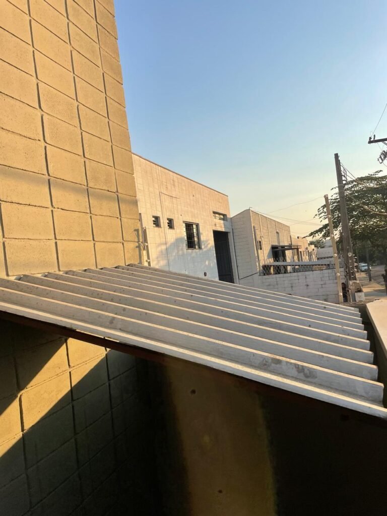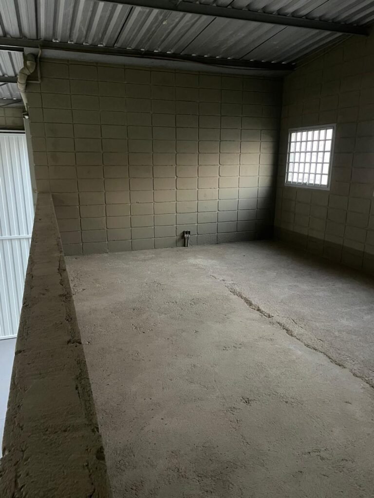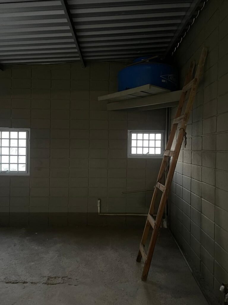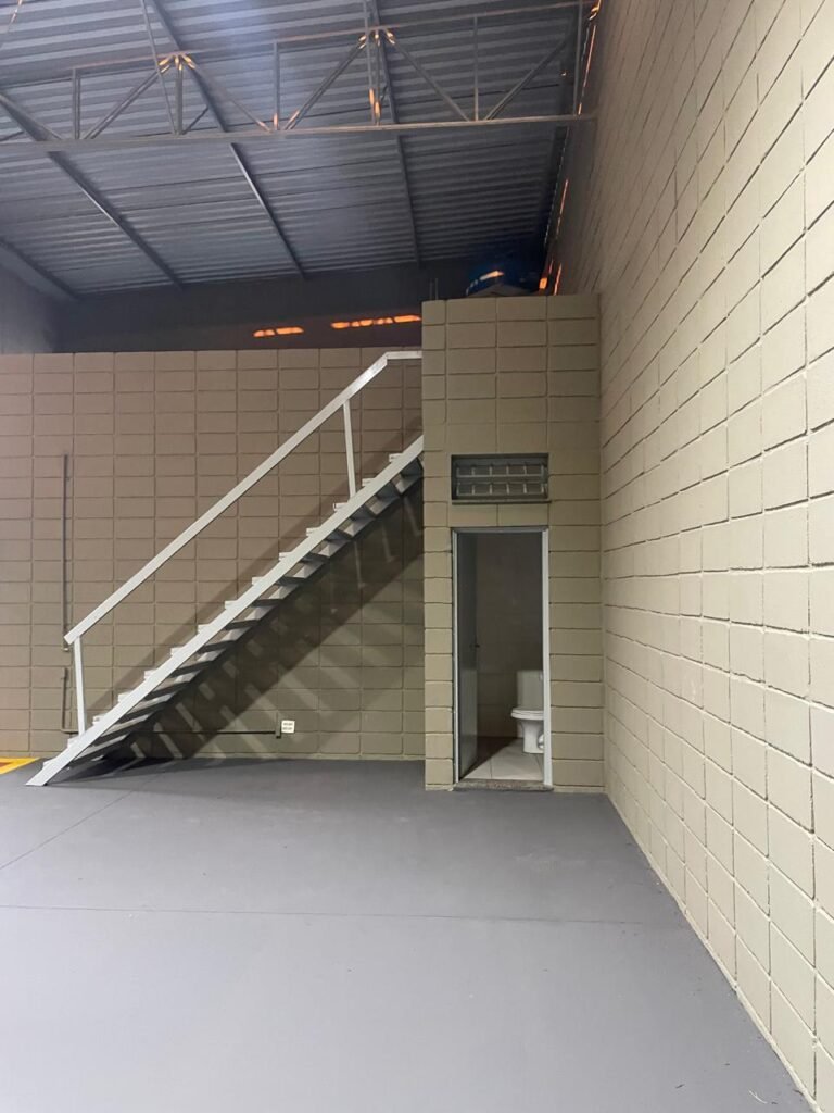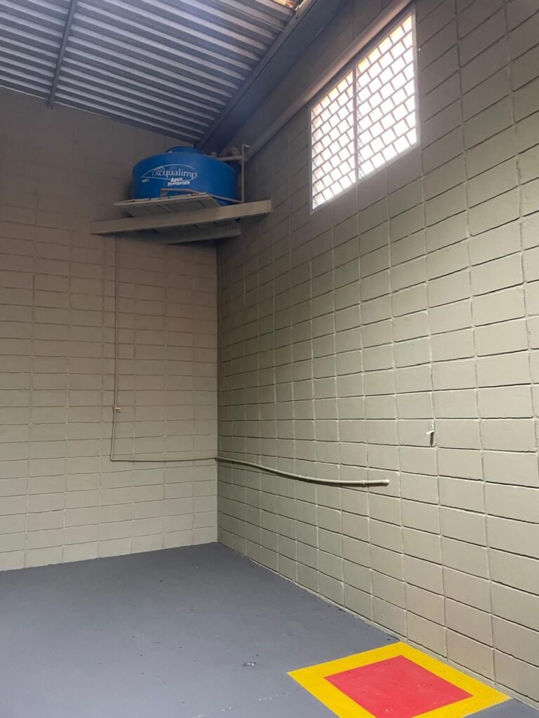 BARRACÃO-: 01 Soleira de granito cinza ocre em ordem, piso em concreto com pintura nova na cor cinza em ordem, 03 pinturas de demarcações de incêndio novas e em ordem, 02 extintores de incêndio sendo 01 de carga de pó químico BC e 01 de carga de água pressurizada, ambos estão vencidos, estrutura de madeira em ordem para caixa d’água, 01 caixa d’água marca Acqualimp 1000L com canos PVC e canopla de registro em ordem, paredes em blocos de concreto com pintura nova na cor concreto em ordem, 01 espelho de luz em ordem com 04 tomadas, 02 conduletes em ordem sendo 01 com 01 tomada e 01 condulete cego, escada com estrutura de ferro e madeira, com guarda corpo ambos com pintura nova na cor cinza em ordem, 02 vitrôs basculantes com esquadrias de ferro com pintura cinza Nova em ordem, ambos com 40 vidros lisos em ordem em cada, telhado com estrutura de ferro com pintura na cor cinza em ordem, revestido de telhas galvanizadas e de telhas translúcidas em ordem, 02 luminárias com LED em ordem, 02 ralos em inox em ordem, 01 portão de abrir em L de metalon, com roldanas e trilhos em ordem, com 02 puxadores em ordem, com 01 trinco para cadeado em ordem, com 01 fechadura ferrolho com 01 trinco para cadeado em ordem.