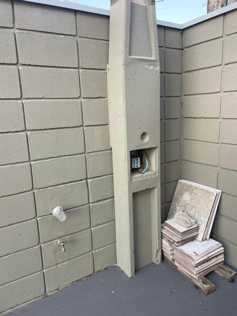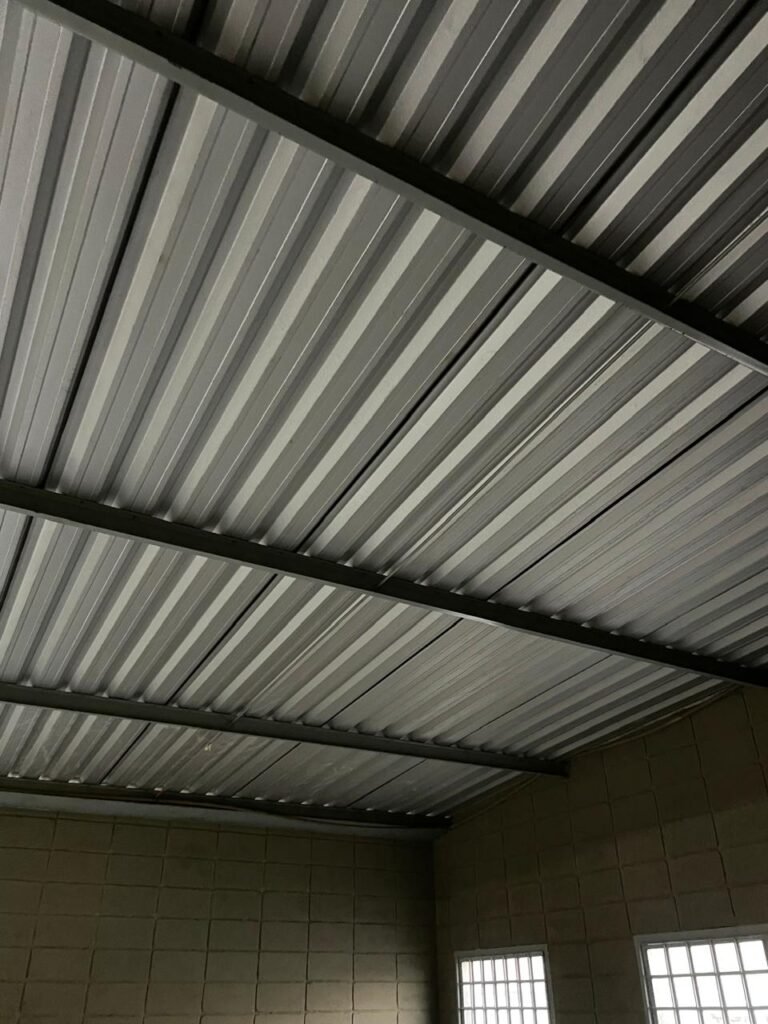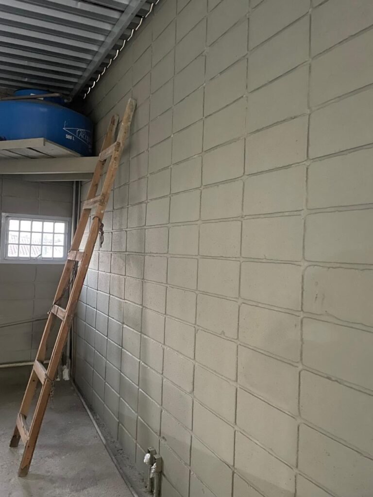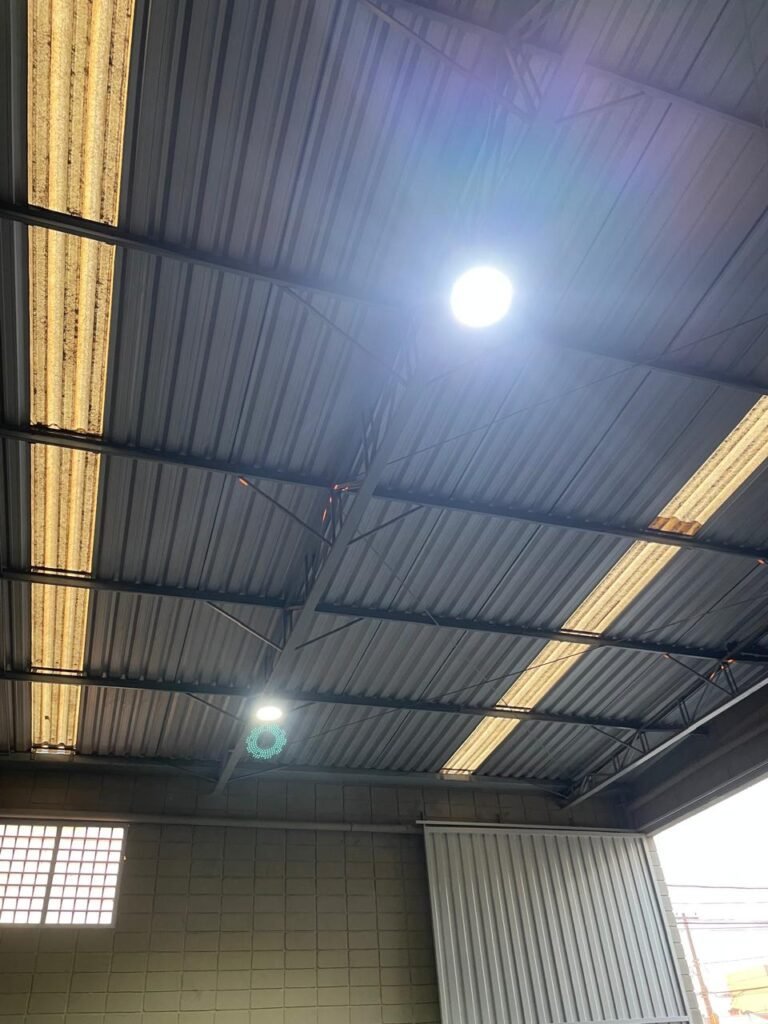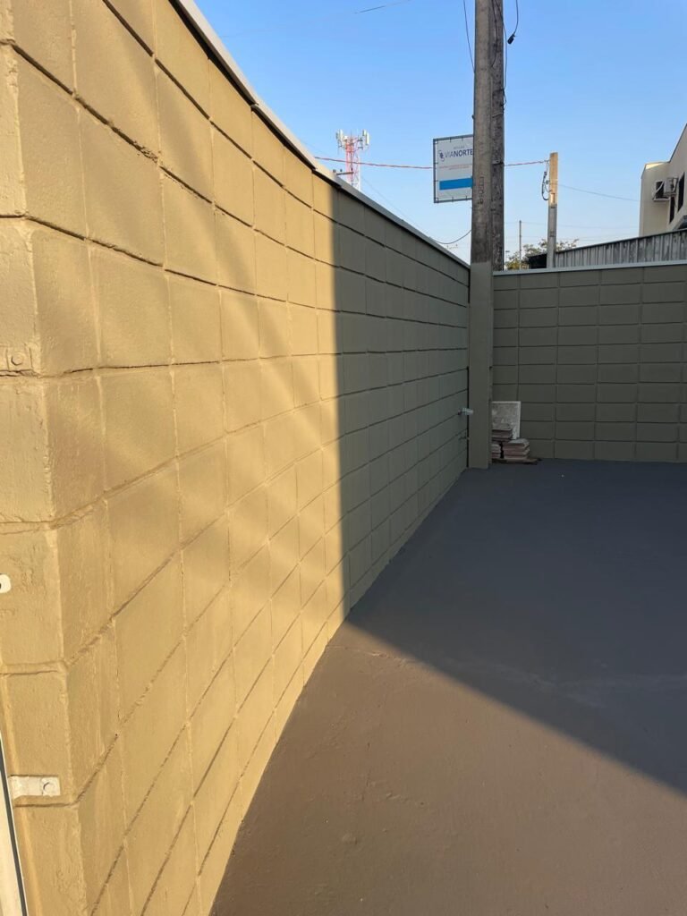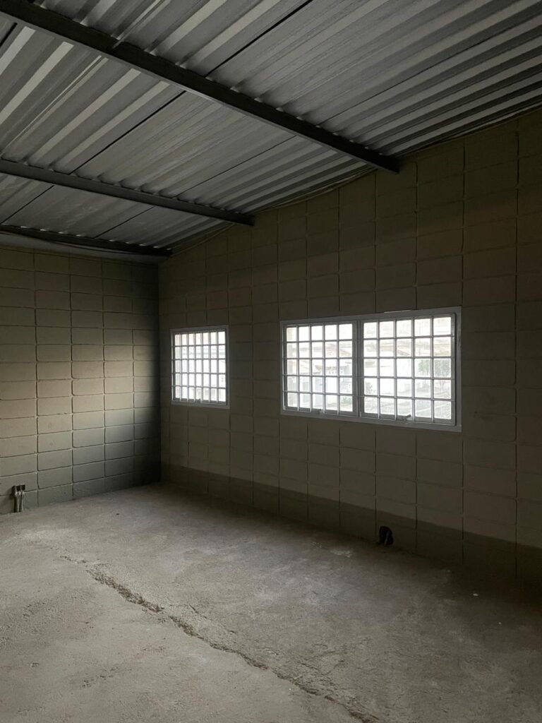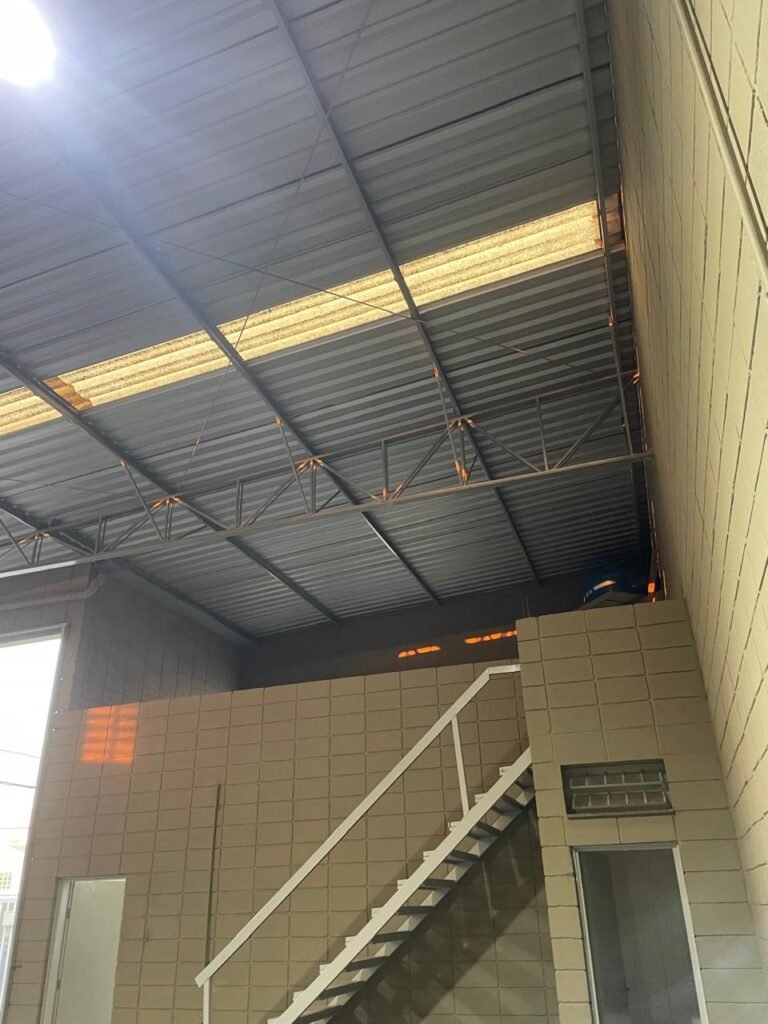 BARRACÃO-: 01 Soleira de granito cinza ocre em ordem, piso em concreto com pintura nova na cor cinza em ordem, 03 pinturas de demarcações de incêndio novas e em ordem, 02 extintores de incêndio sendo 01 de carga de pó químico BC e 01 de carga de água pressurizada, ambos estão vencidos, estrutura de madeira em ordem para caixa d’água, 01 caixa d’água marca Acqualimp 1000L com canos PVC e canopla de registro em ordem, paredes em blocos de concreto com pintura nova na cor concreto em ordem, 01 espelho de luz em ordem com 04 tomadas, 02 conduletes em ordem sendo 01 com 01 tomada e 01 condulete cego, escada com estrutura de ferro e madeira, com guarda corpo ambos com pintura nova na cor cinza em ordem, 02 vitrôs basculantes com esquadrias de ferro com pintura cinza Nova em ordem, ambos com 40 vidros lisos em ordem em cada, telhado com estrutura de ferro com pintura na cor cinza em ordem, revestido de telhas galvanizadas e de telhas translúcidas em ordem, 02 luminárias com LED em ordem, 02 ralos em inox em ordem, 01 portão de abrir em L de metalon, com roldanas e trilhos em ordem, com 02 puxadores em ordem, com 01 trinco para cadeado em ordem, com 01 fechadura ferrolho com 01 trinco para cadeado em ordem.