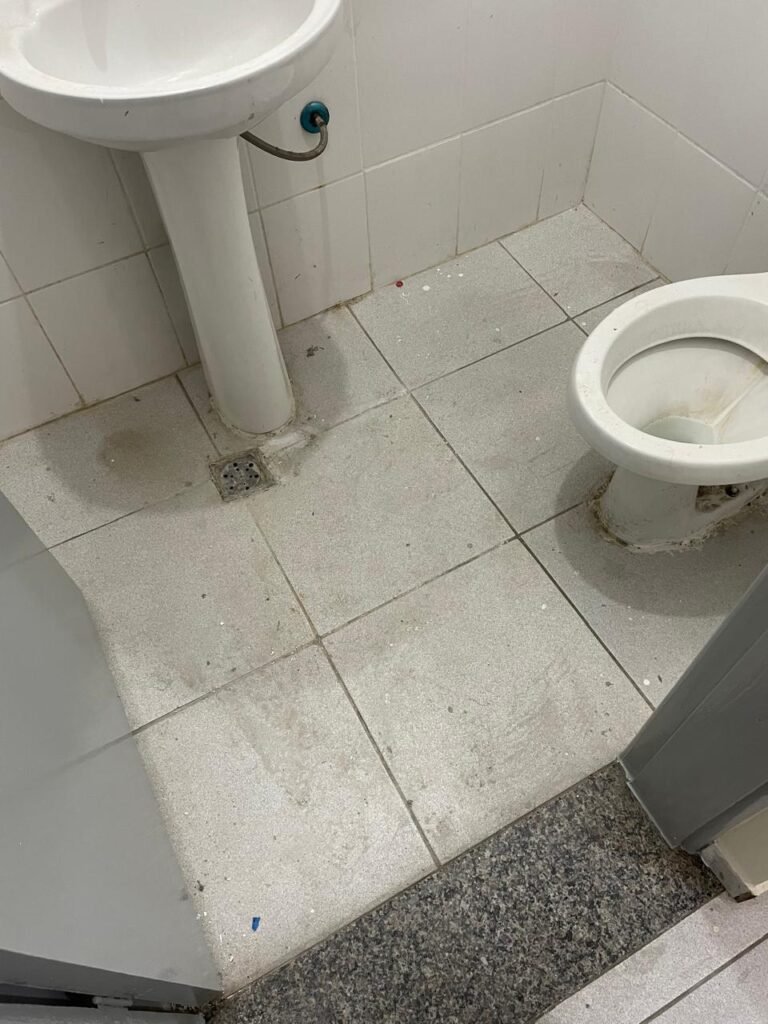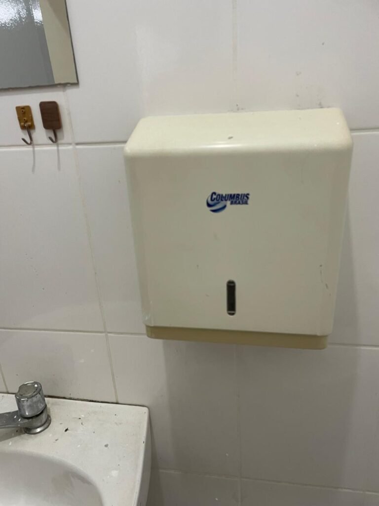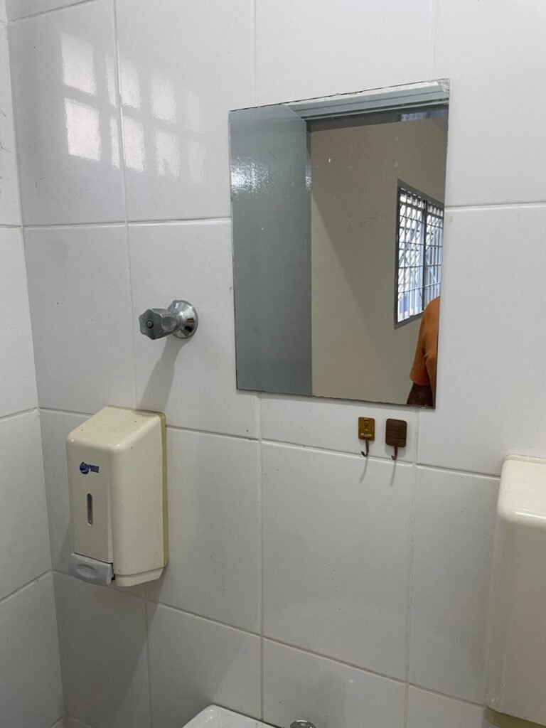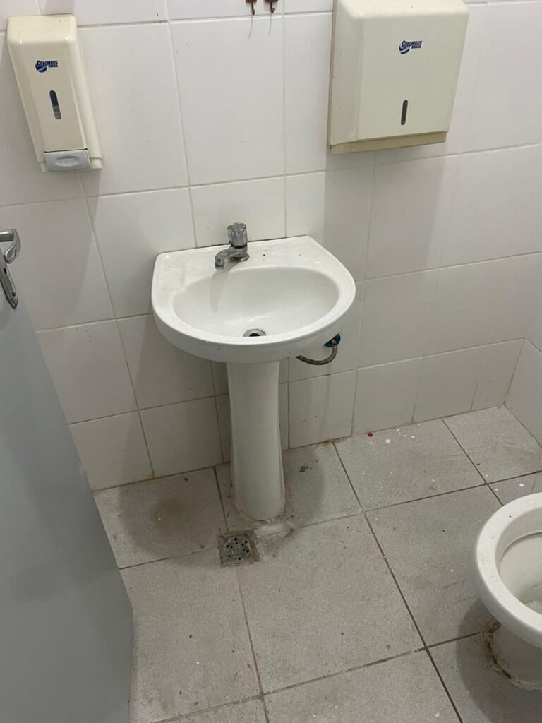 WC RECEPÇÃO-: 01 Porta de madeira em ordem, com pintura nova na cor cinza em ordem, com maçaneta em inox em ordem, com fechadura marca Stam em ordem, com chave embutida em ordem, 01 soleira de granito cinza ocre em ordem, piso revestido de piso frio cerâmico com manchas de tinta e restante em ordem, 01 ralo em inox em ordem, conjunto sanitário de cerâmica marca Looasa em ordem, descarga em ordem, conjunto lavatório de cerâmica cor branco com desgastes naturais, marca Looasa em ordem, com torneira em inox com manchas de tinta, acabamento solto e restante em ordem, sem sifão (água vazando), 01 suporte de sabonete líquido marca Columbus em ordem, 01 suporte de papel de mão marca Columbus em ordem, 07 suporte com desgastes naturais, paredes revestidas de azulejo na cor branco com desgastes naturais e restante em ordem, 01 interruptor sem tampa, 01 espelho de reflexo com partes trincada e restante em ordem, canopla de registro em inox em ordem, 01 vitrô basculante com esquadrias de ferro com pintura nova na cor cinza em ordem, com o 01 fechadura em ordem, grades de ferro de proteção em ordem, 10 vidros foscos com desgastes natural e restante em ordem, teto com pintura nova na cor branco neve em ordem, bocal com 01 lâmpada LED em ordem.