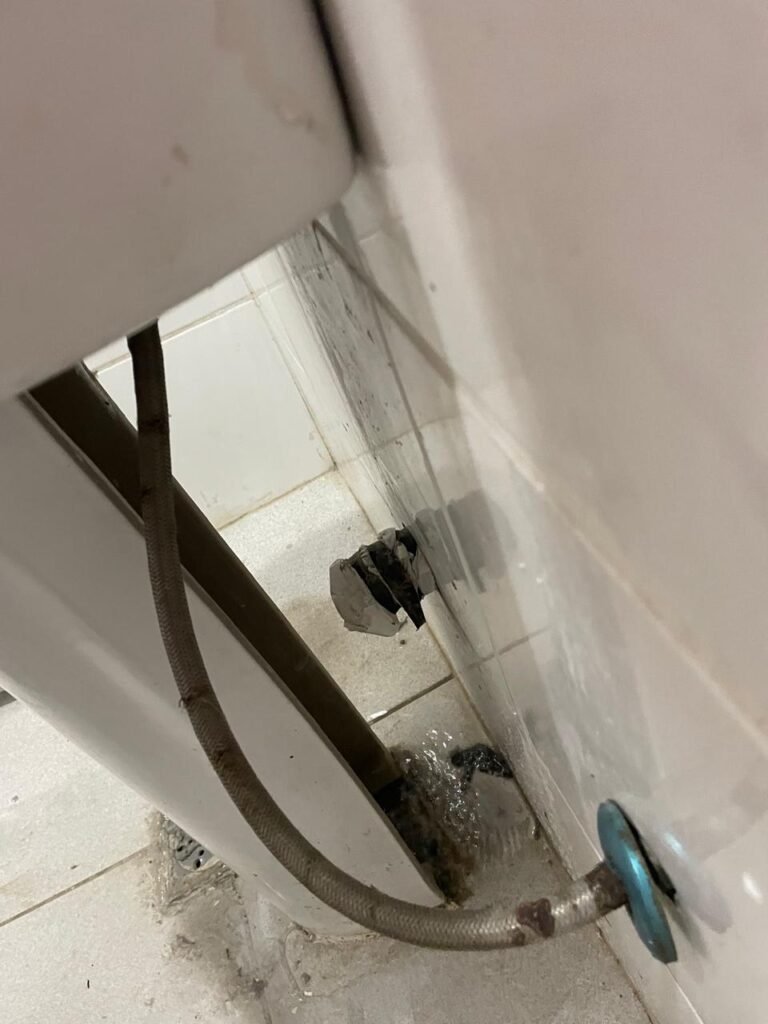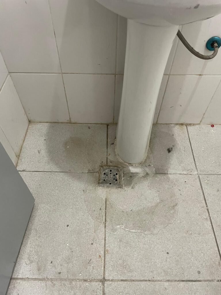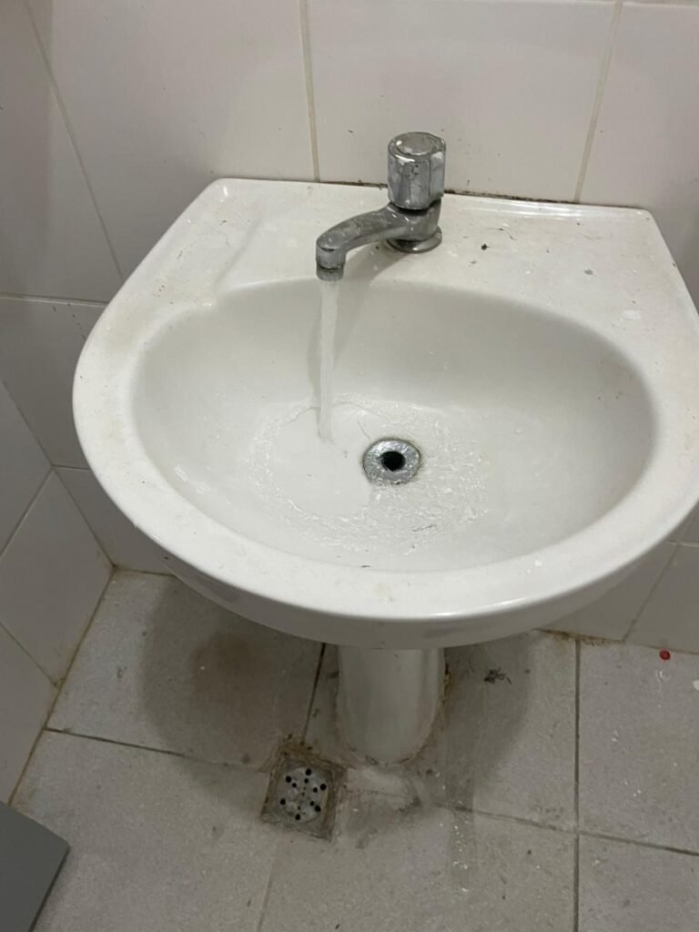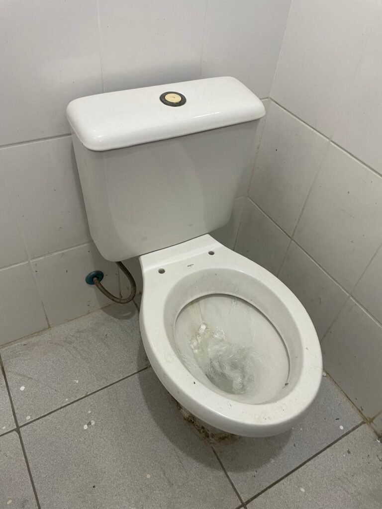 WC RECEPÇÃO-: 01 Porta de madeira em ordem, com pintura nova na cor cinza em ordem, com maçaneta em inox em ordem, com fechadura marca Stam em ordem, com chave embutida em ordem, 01 soleira de granito cinza ocre em ordem, piso revestido de piso frio cerâmico com manchas de tinta e restante em ordem, 01 ralo em inox em ordem, conjunto sanitário de cerâmica marca Looasa em ordem, descarga em ordem, conjunto lavatório de cerâmica cor branco com desgastes naturais, marca Looasa em ordem, com torneira em inox com manchas de tinta, acabamento solto e restante em ordem, sem sifão (água vazando), 01 suporte de sabonete líquido marca Columbus em ordem, 01 suporte de papel de mão marca Columbus em ordem, 07 suporte com desgastes naturais, paredes revestidas de azulejo na cor branco com desgastes naturais e restante em ordem, 01 interruptor sem tampa, 01 espelho de reflexo com partes trincada e restante em ordem, canopla de registro em inox em ordem, 01 vitrô basculante com esquadrias de ferro com pintura nova na cor cinza em ordem, com o 01 fechadura em ordem, grades de ferro de proteção em ordem, 10 vidros foscos com desgastes natural e restante em ordem, teto com pintura nova na cor branco neve em ordem, bocal com 01 lâmpada LED em ordem.