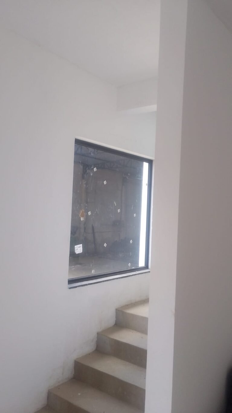 HALL DE ENTRADA-: Piso de concreto usinado e desempenado, 01 interruptor com 03 luminárias plafon de LED em ordem, parede na cor branca em ordem, 03 interruptores em ordem, 01 janela Blindex com acabamento em preto e uma pedra de mármore em ordem.