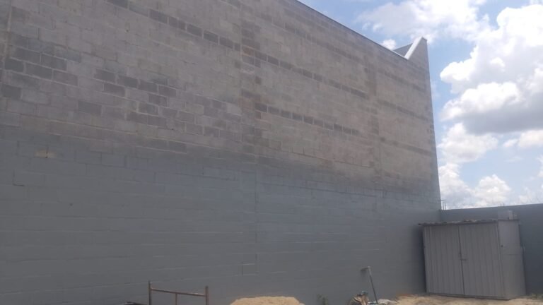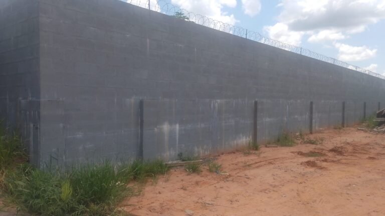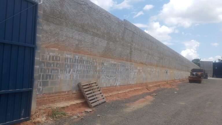 PÁTIO-: Pedras de brita no chão, muro na cor cinza com pintura nova, portão na cor azul.
