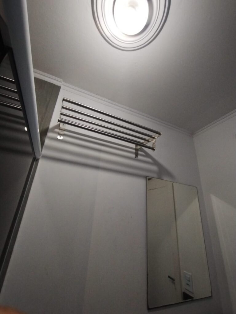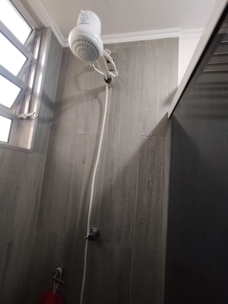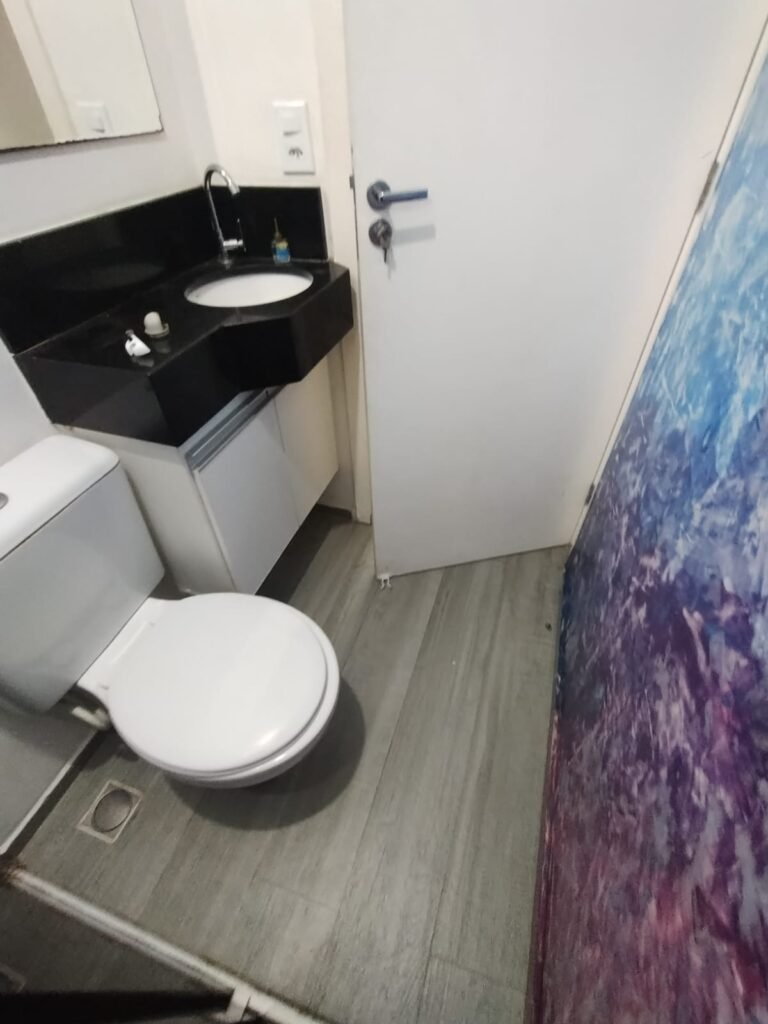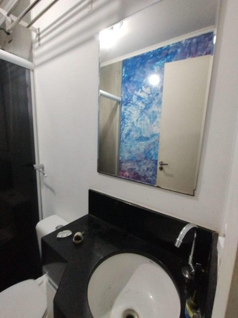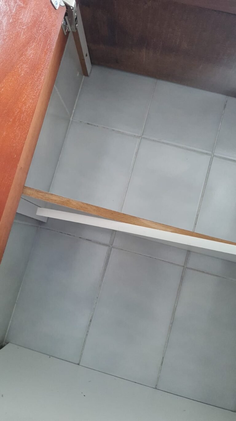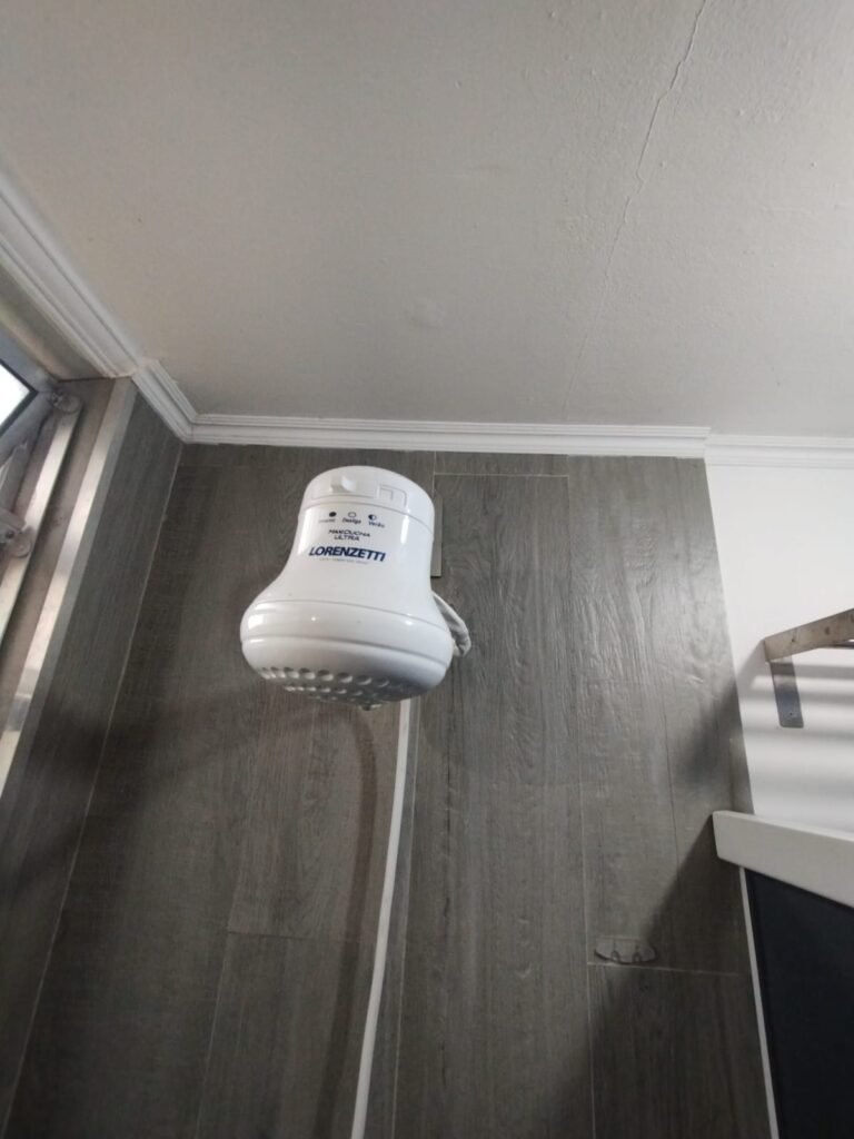 Banheiro:- Piso cerâmico porcelanato Eliane modelo madeira na cor cinza com rodapés em ordem, 01soleira de granito São Gabriel em ordem, paredes dentro do box com revestimento cerâmico porcelanato Eliane modelo madeira na cinza até o teto em ordem, parede com massa acrílica com a pintura na cor branco neve em ordem, 01 parede de massa acrílica com efeito de cimento queimado colorido revestido de resina em ordem, teto na cor branco neve em ordem, gola de isopor na cor branco neve em ordem, 01 box de vidro blindex na cor fume com duas folhas sendo uma decorrer em ordem , 01 puxador em ordem, 01 ralo seco com tampa inox desentupido em ordem, 02 registros deca em ordem, 01 pia de granito São Gabriel com desgaste natural do tempo restante em ordem, 01 cuba de cerâmica branca marca Deca em ordem, 01 torneira bica móvel em ordem, 02 registros Deca sendo 01 do chuveiro e 01 geral em ordem, 01 armário embutido de madeira MDF 18 cm com a pintura na cor branco com duas portas em ordem, 04 dobradiças pneumáticas em ordem, 02 puxadores de inox em ordem, 01 porta papel higiênico de inox em ordem, 01porta toalhas de aço inox em ordem, 01 spot com 01 lâmpada fluorescente em ordem, 01 espelho com parte lateral lascada o restante em ordem, 01 ralo com tampa inox desentupido em ordem, 01 conjunto de vaso sanitário e caixa acoplada cerâmica na cor branco marca incepa em ordem, 01 tampa vaso em acrílico em ordem, 01 interruptor para lâmpada e tomada com espelho em ordem, 01 janela de alumínio de abrir com 04 vidros em ordem, 01 prateleira de granito São Gabriel em ordem, 01 porta de madeira concremwood 75 cm MDF na cor branco com manchas com guarnição com base lascada o restante em ordem,01 chuveiro Lorenzetti Ducha Maxi Ultra 03 temperaturas em ordem.