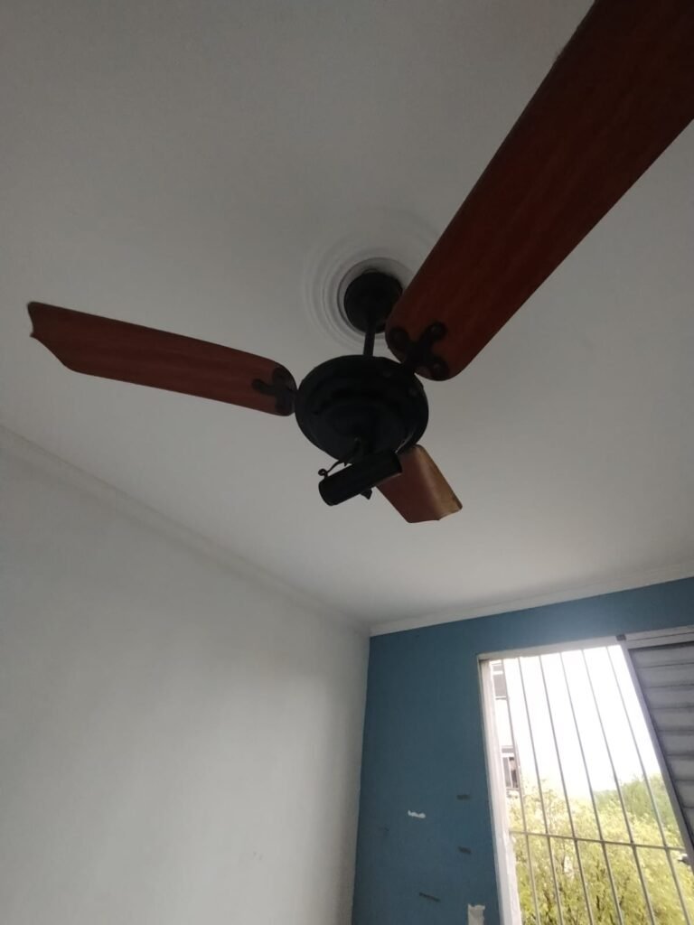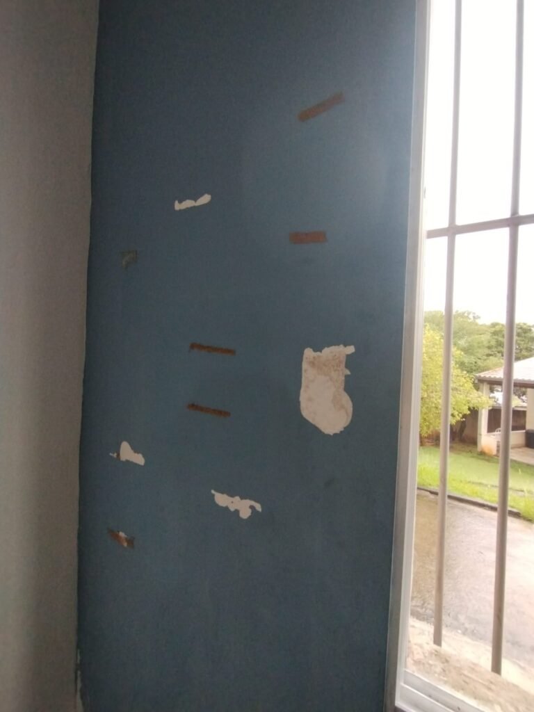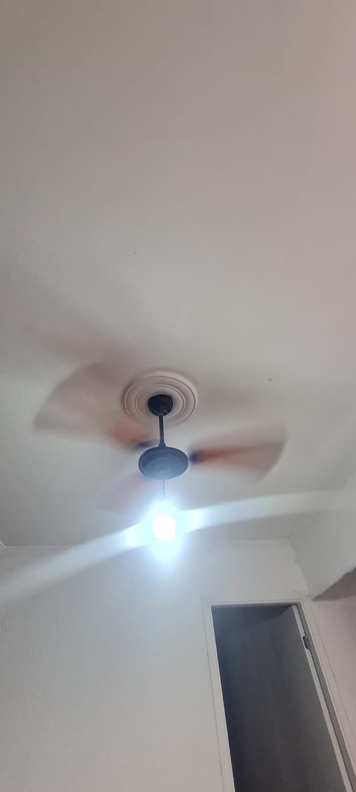 Quarto:- Piso frio cerâmico mesclado com desgaste natural do tempo restante em ordem, rodapé em ordem, porta de madeira concremwood 75 cm MDF na cor branco com guarnição em ordem, paredes com pintura nova na cor branco neve Coral com Manchas o restante em ordem, 01 parede com pintura na cor azul inverno fosco Coral com manhas o restante em ordem, teto com a pintura na cor branco neve Coral em ordem, golas de gesso com pintura na cor branco neve em ordem, 01 janela de alumínio de correr com 01 folha de vidro em ordem, 01 ventilador de teto sem 01 lâmpada fluorescente restante em ordem, 01 interruptor para ventilador e lâmpada e ordem, 02 interruptores de energia com espelho em ordem.