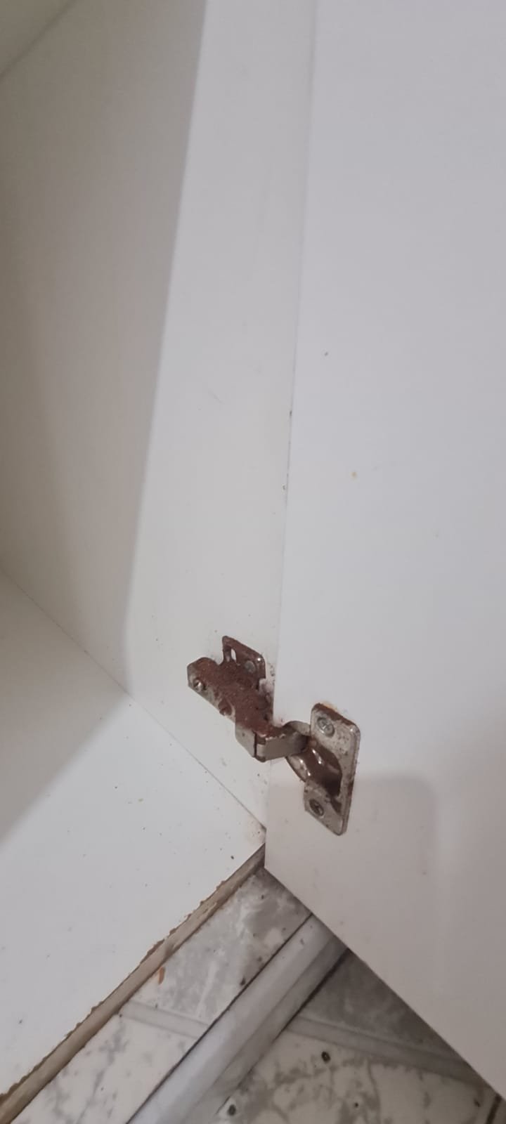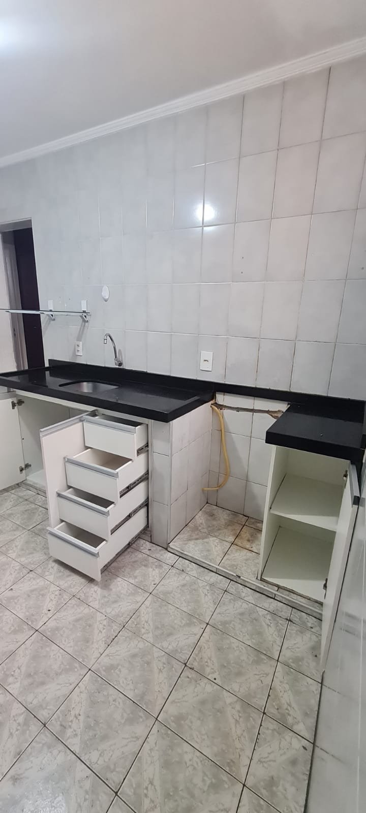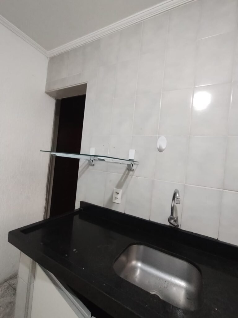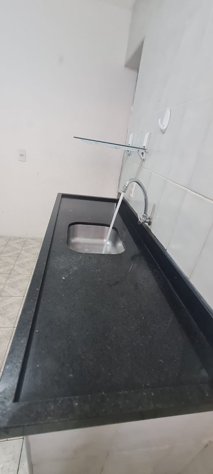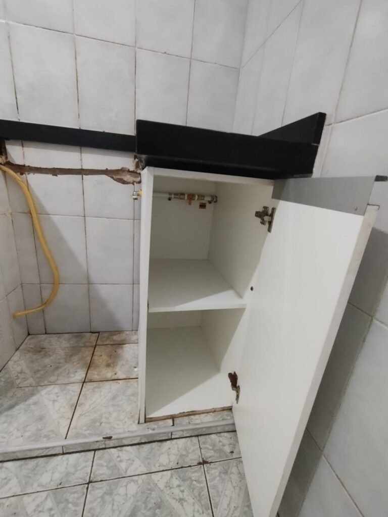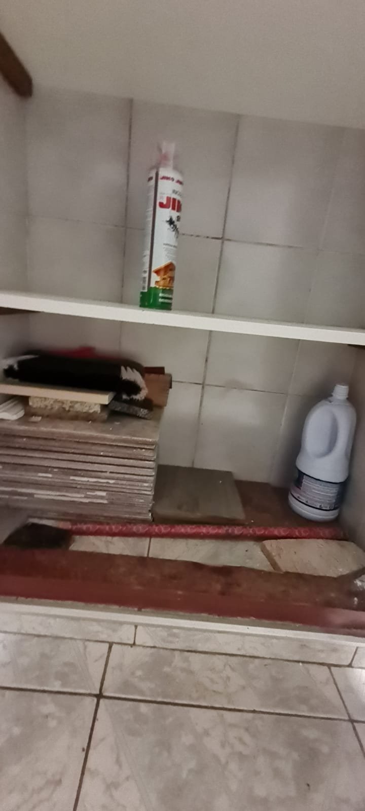 Cozinha:- Piso frio cerâmico mesclado com desgaste natural do tempo restante em ordem, paredes com revestimento cinza cerâmico com desgaste natural do tempo contento 10 furos com bucha restante em ordem, 01 peça azulejo lascado próximo a janela restante em ordem, 01 parede com grafiato com a pintura na cor branco com algumas manchas o restante em ordem, 01 pia em granito São Gabriel com desgaste natural do tempo o restante em ordem, cuba de inox em ordem, 01 torneira bica móvel em ordem, 01 armário embutido de MDF 18 cm em ordem, 03 portas com 06 dobradiças pneumáticas em ordem, 07 puxadores alumínio em ordem, 04 gavetas com roldanas corrediças em ordem, 02 prateleiras sendo 01 removível em ordem, teto com pintura na cor branco neve em ordem, gola de gesso faltando meia parede restante em ordem, gola de gesso em volta da lâmpada em ordem, 01 spot com 01 lâmpada fluorescente compacta em ordem, 01 janela de ferro com desgaste natural do tempo restante em ordem, 08 vidros em ordem, 01 interruptor em ordem, 05 tomadas de energia emordem,06 espelhos de luz em ordem.